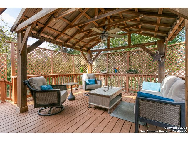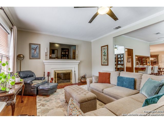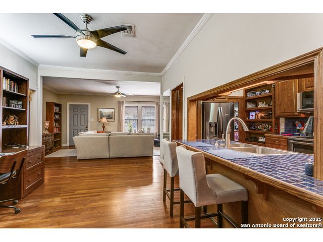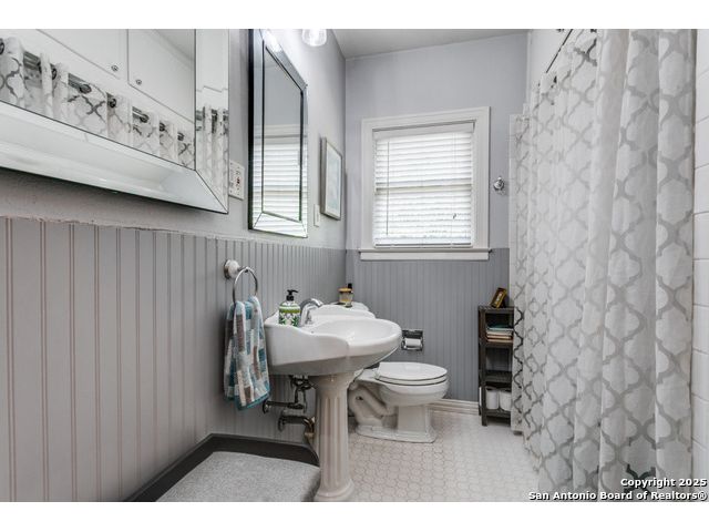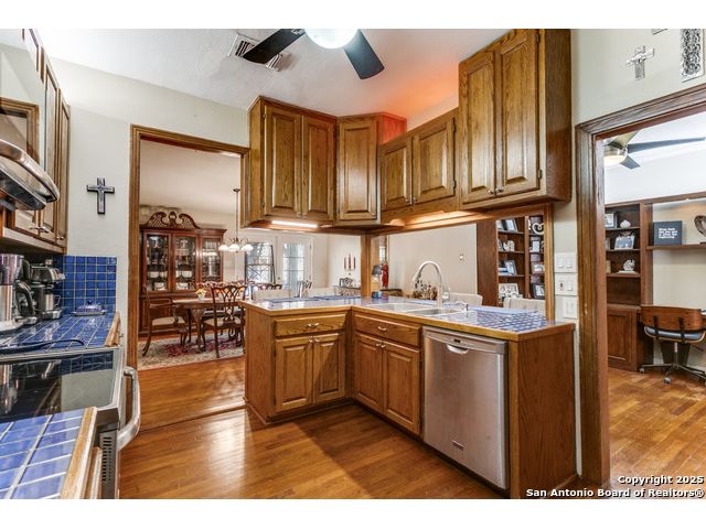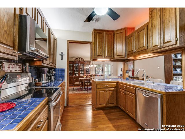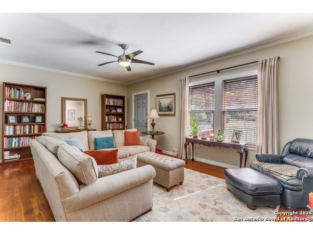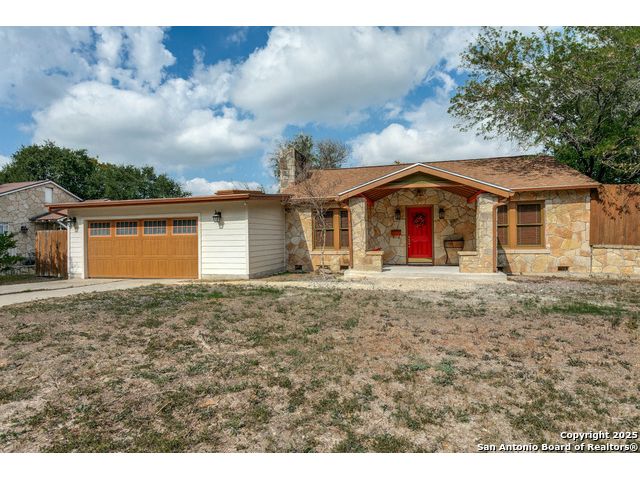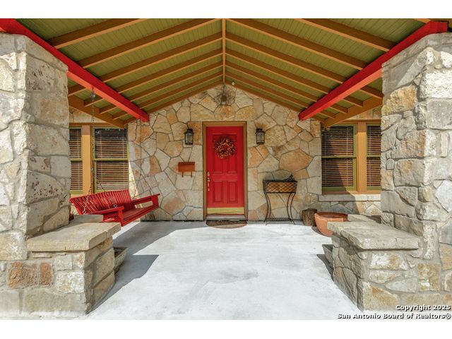 Discover timeless character and modern comfort in this beautifully preserved historic home in Olmos Park Terrace. Showcasing a distinctive rock exterior, this 3 bedroom, 2 bath home blends classic charm with thoughtful updates. Step inside to a warm, inviting living room with original wood floors and a wood-burning fireplace, creating the perfect setting for relaxed evenings. A separate dining room offers an elegant place for gatherings, while the adjacent kitchen with breakfast bar, stainless appliances and charming lapis blue tile counters is ideal for everyday cooking and entertaining. Enjoy multiple outdoor living areas, including a covered front porch with a cozy swing, a sizable covered back deck and a private side patio. Rich in character and wonderfully appointed, this home is welcoming and full of history.