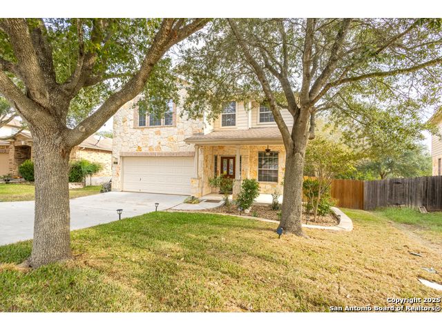 Charming home in a great neighborhood. Conveniently located five minutes off Interstate 35 & 15 minutes from New Braunfels. Highly rated schools. Rock fireplace in the living room with tile flooring downstairs. Large master bedroom and walk-in closets in the secondary bedrooms. Nice size game room. Three-sided rock exterior & gutters. Surround sound downstairs & garage. Central vacuum in home. Built-in storage in garage. Large private backyard with covered patio, mature trees & two large sheds with electricity.