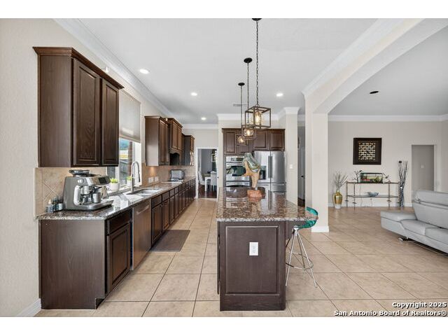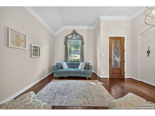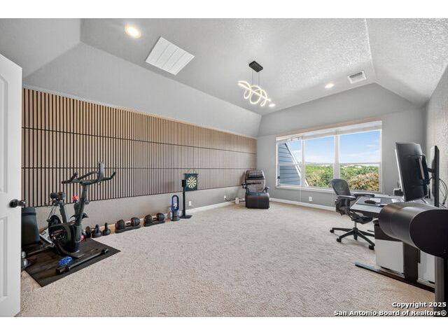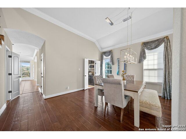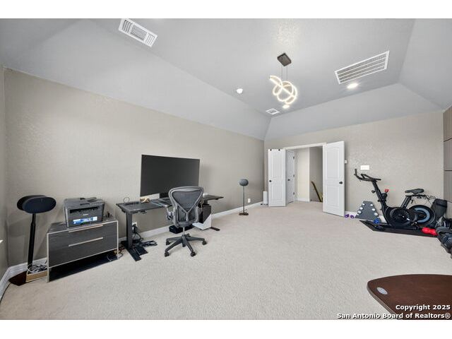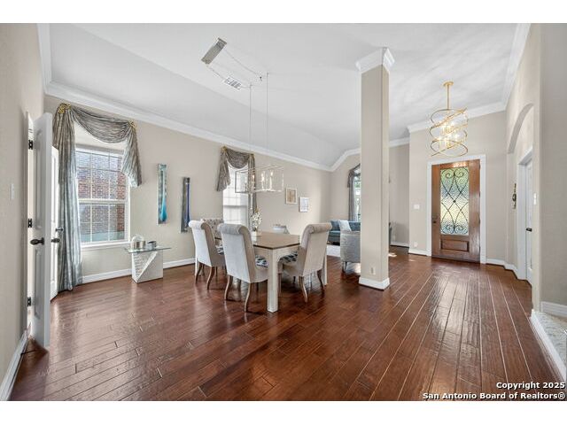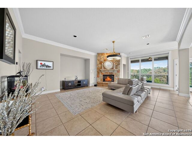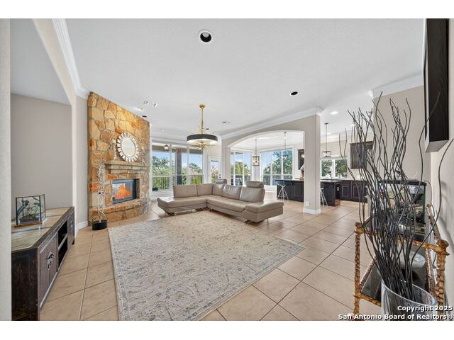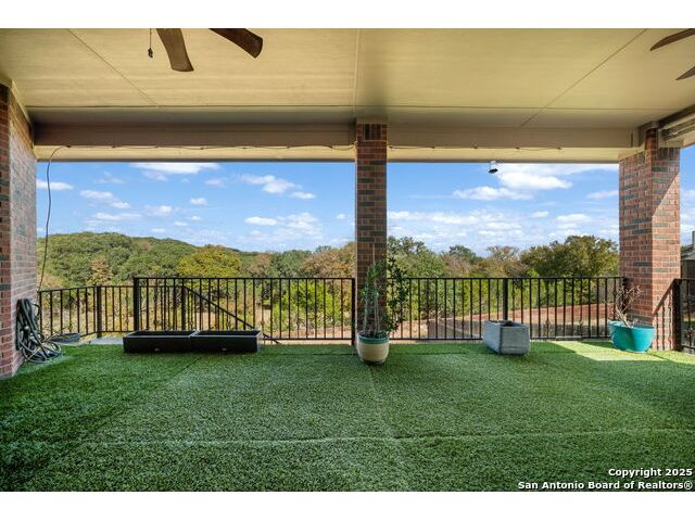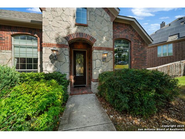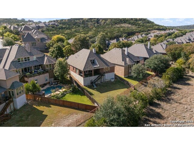 Experience refined living in this exceptional 4-bedroom, 3.5-bath residence, perfectly positioned along an expansive greenbelt for unmatched privacy and breathtaking natural vistas. A grand formal living and dining area sets an elegant tone upon entry, flowing seamlessly into a gourmet kitchen appointed with a generous island and open sightlines to the sophisticated family room. Walls of windows invite abundant natural light and frame sweeping Hill Country views, leading to an oversized covered patio ideal for elevated indoor-outdoor entertaining. The main level showcases a serene primary suite with a spa-quality ensuite, complemented by two additional well-appointed bedrooms. A versatile fourth bedroom with a full bath-currently arranged as an impressive game room-offers flexibility for guests or leisure. Additional luxuries include an oversized garage with premium epoxy flooring and an EV charging station.