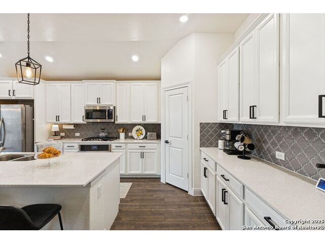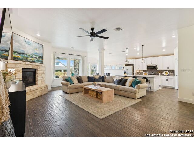 You are going to love living at Veramendi! Explore new trails, enjoy quiet hill country mornings and experience the joy of a summertime splash pad. The beautifully maintained D Weekley Home has an open floor plan that is warm and inviting. Gorgeous kitchen with stainless steel appliances and gas cooktop offers abundant storage and plenty of space to gather at the large island breakfast bar which easily sits 4-6. Breakfast nook is spacious light and bright and leads to the covered porch and lovingly landscaped large backyard with lots of room to play or host a garden party. In the center of the home, relax in the well-proportioned living room with a fabulous stone fireplace that you can enjoy winter, spring and fall. Retreat to the over-sized den which makes a fabulous play space, a library-study, an indoor gym or whatever you wish. The spacious master suite with sitting area is separate from secondary bedrooms offering a cozy retreat. Large shower, separate vanities and walk-in closet with built-in shelves. Generous sized secondary bedrooms offer ample room for family members or guests. Secondary bathroom with plenty of counter space and wood cabinets in a soft finish keep the space feeling calm and organized. Veramendi, inspired by New Braunfels' heritage, embraces the rugged beauty of Hill Country and the vitality and energy of urban living. Make this home yours today!