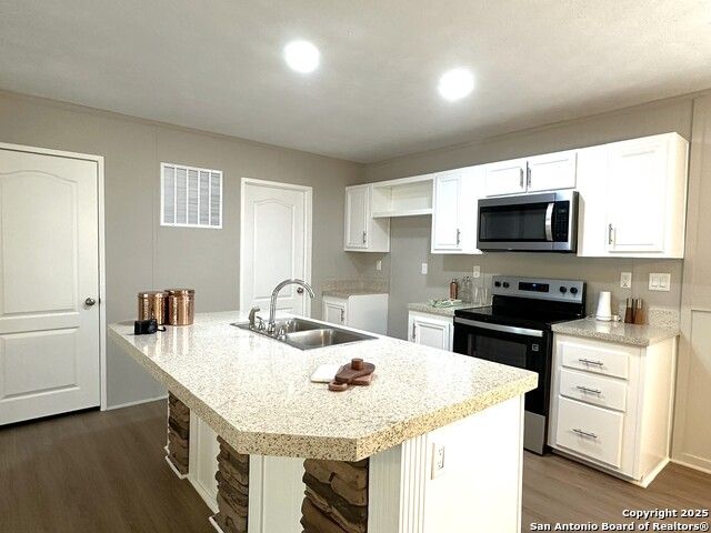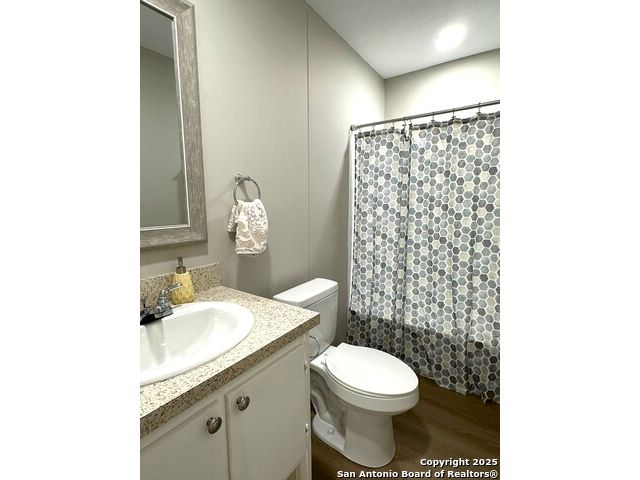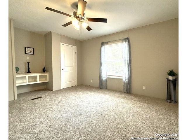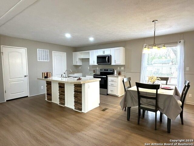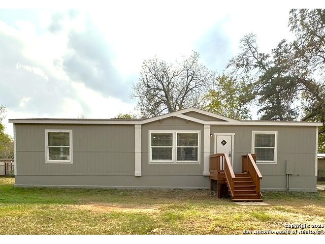 Completely updated and beautiful. Island kitchen with new stainless appliances and a breakfast bar. New light fixtures. New faux wood flooring in the living area, dining, and kitchen. New carpet in the bedrooms. Fresh paint inside and out. Open floor plan. Primary bath offers a soaking tub, separate shower, and double vanity. 2 inch blinds and window treatments are included. Fully fenced nearly 1/2 acre lot. Mature pecan trees. Located close to the Guadalupe River. New energy efficient heat pump AC and heat system 2025.