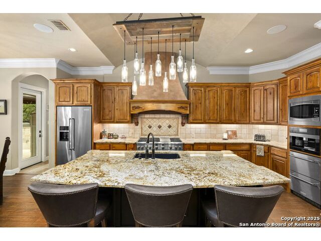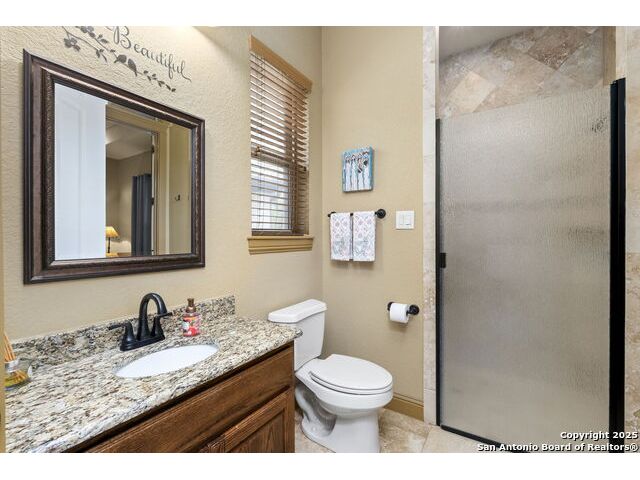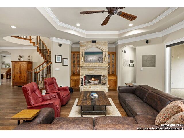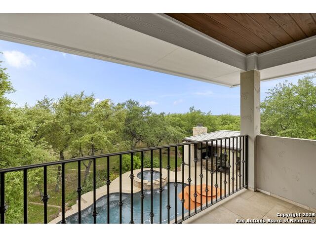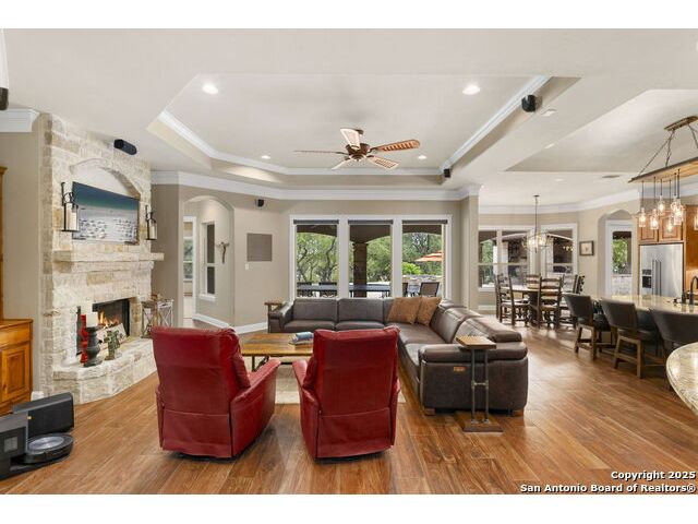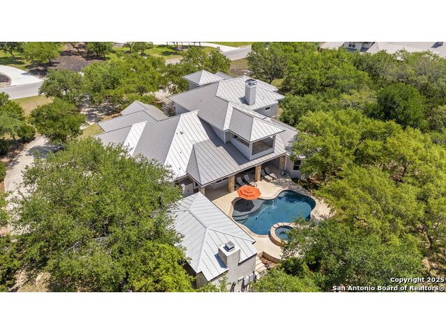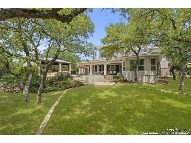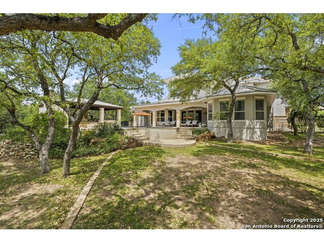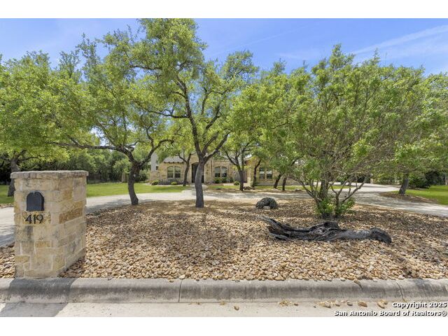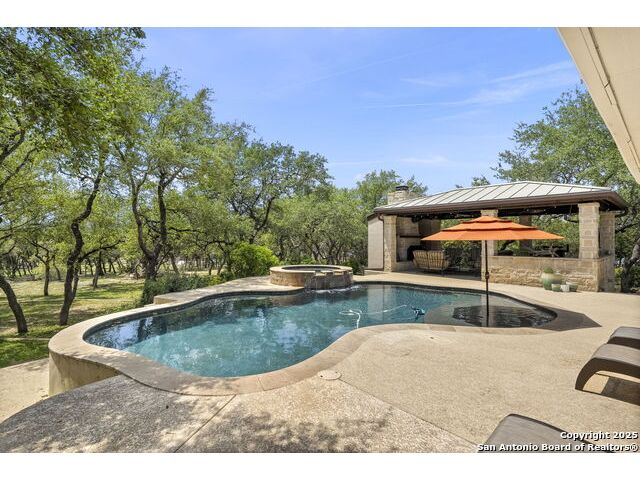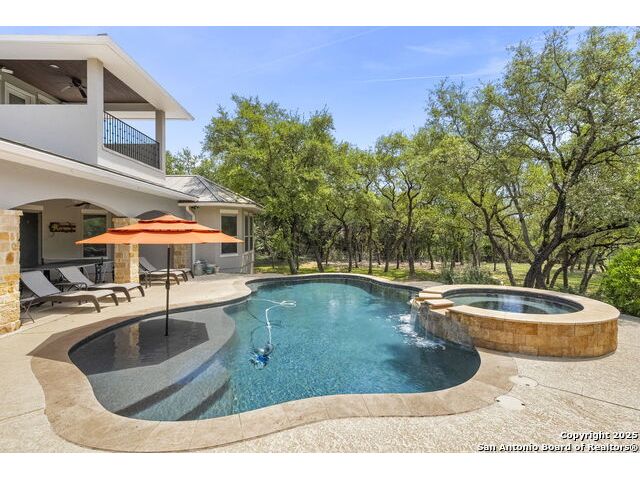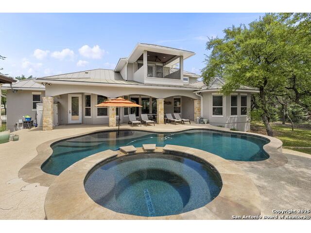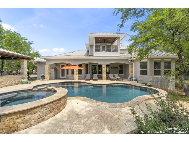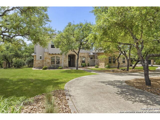 Located in the prestigious, gated community of Stone Creek Ranch, this exquisite Texas Hill Country home offers a rare combination of privacy, luxury, and thoughtful design. From the moment you arrive, you're greeted by a circular drive framed by mature trees and Hill Country charm. Inside, a grand entryway with a dramatic curved staircase sets the tone for the spacious, open-concept living areas. The heart of the home is a chef's dream kitchen featuring a 6-burner gas stove, two beverage drawers and coffee maker. There is a large center island with granite countertops, and a walk-in pantry. The primary suite is a sanctuary, complete with a spa-style bath featuring a walk-in shower, jetted tub, dual vanities, and generous closet space. A second bedroom suite downstairs is perfect for guests or multi-generational living. Upstairs, you'll find three additional bedrooms and a game room, offering ample room for entertainment and relaxation. Step outside to your private backyard retreat with a covered patio, outdoor kitchen, and heated in-ground pool and spa-all surrounded by lush landscaping and privacy trees on your 1+ acre lot.