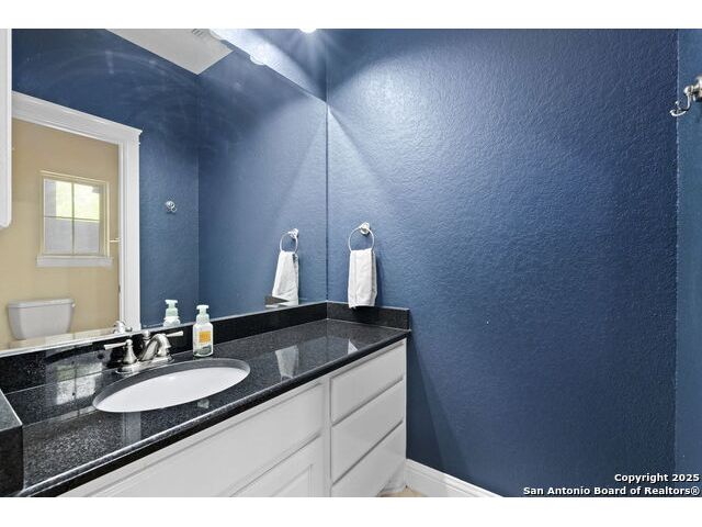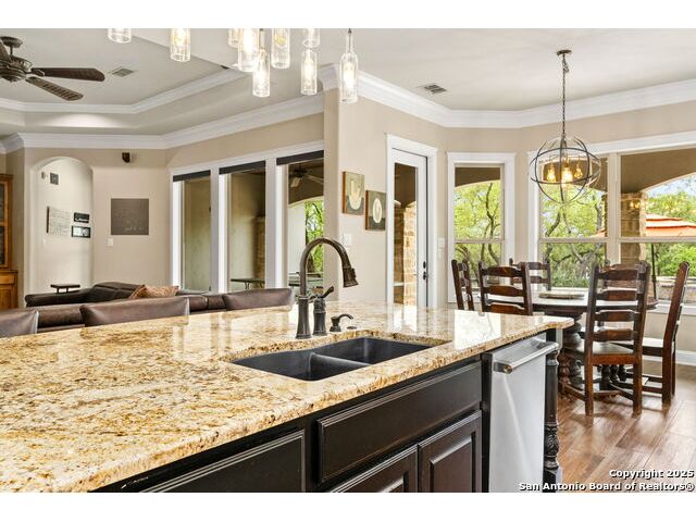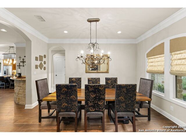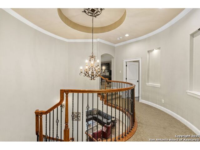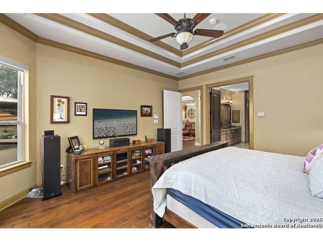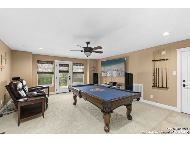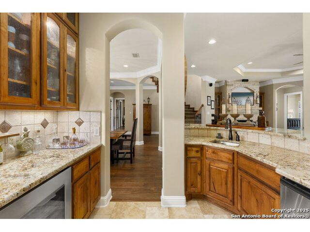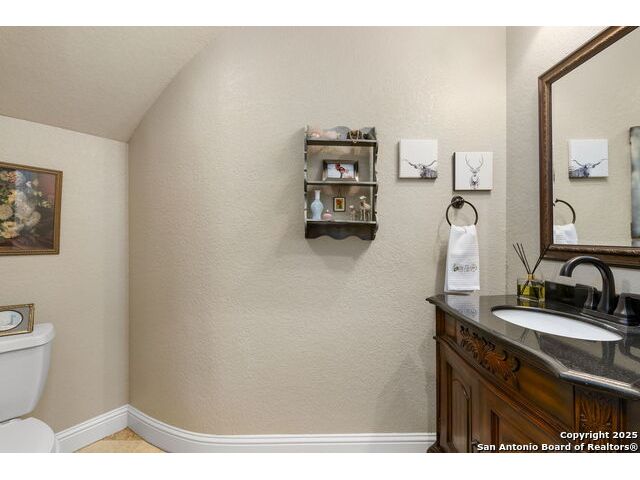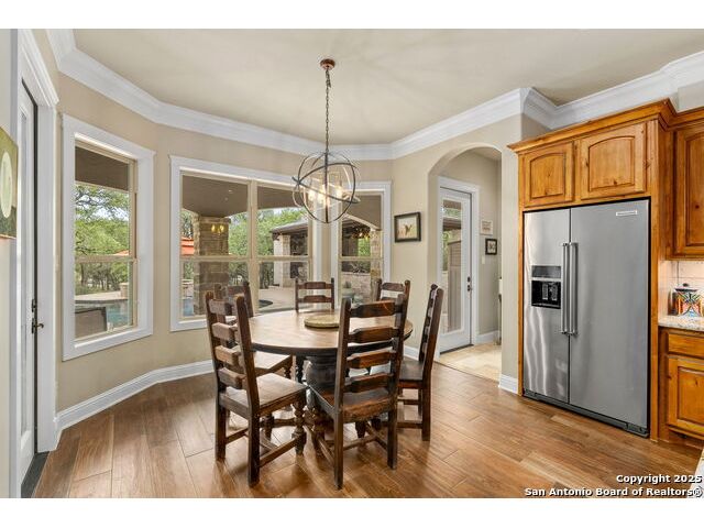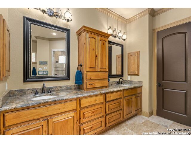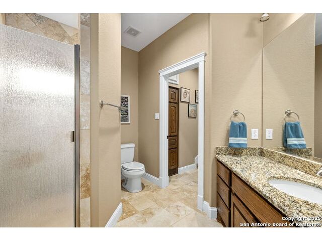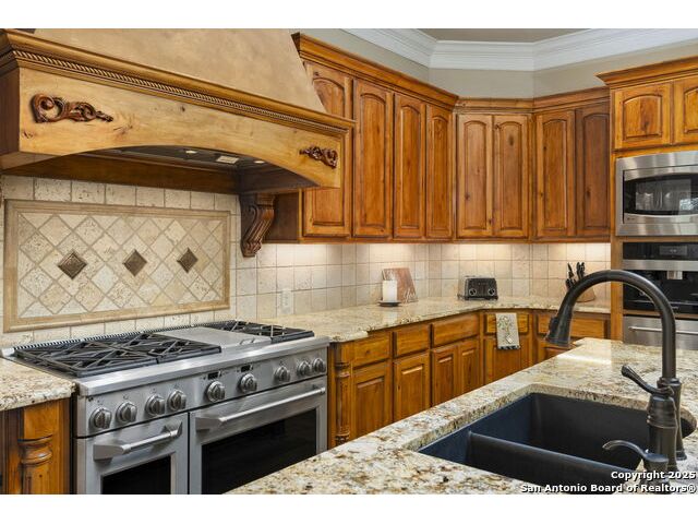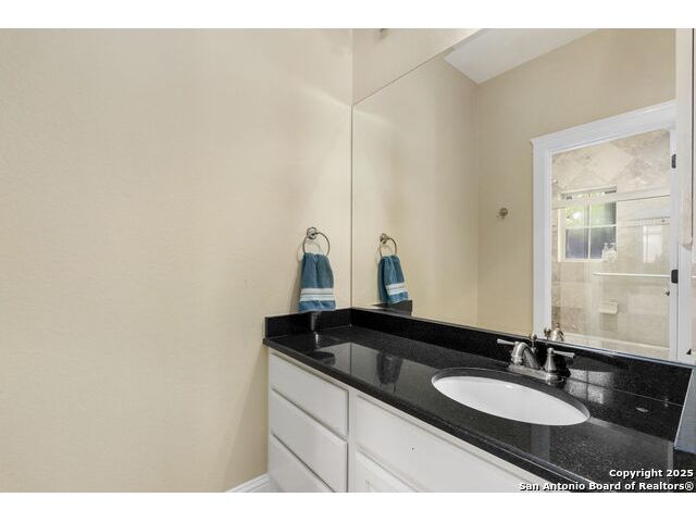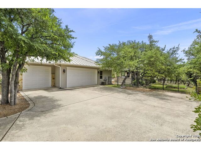 Located in the prestigious, gated community of Stone Creek Ranch, this exquisite Texas Hill Country home offers a rare combination of privacy, luxury, and thoughtful design. From the moment you arrive, you're greeted by a circular drive framed by mature trees and Hill Country charm. Inside, a grand entryway with a dramatic curved staircase sets the tone for the spacious, open-concept living areas. The heart of the home is a chef's dream kitchen featuring a 6-burner gas stove, two beverage drawers and coffee maker. There is a large center island with granite countertops, and a walk-in pantry. The primary suite is a sanctuary, complete with a spa-style bath featuring a walk-in shower, jetted tub, dual vanities, and generous closet space. A second bedroom suite downstairs is perfect for guests or multi-generational living. Upstairs, you'll find three additional bedrooms and a game room, offering ample room for entertainment and relaxation. Step outside to your private backyard retreat with a covered patio, outdoor kitchen, and heated in-ground pool and spa-all surrounded by lush landscaping and privacy trees on your 1+ acre lot.