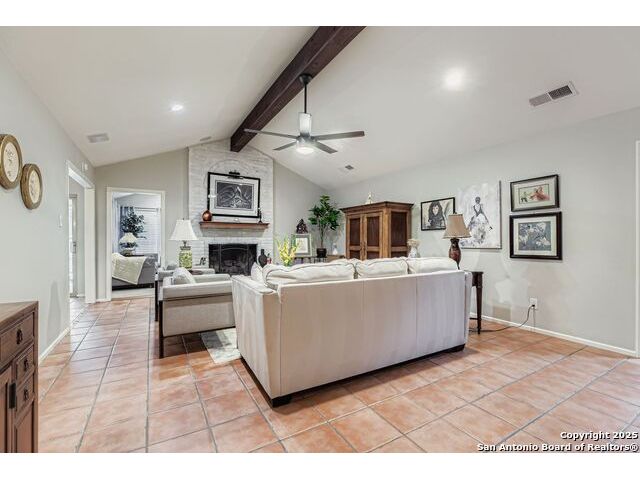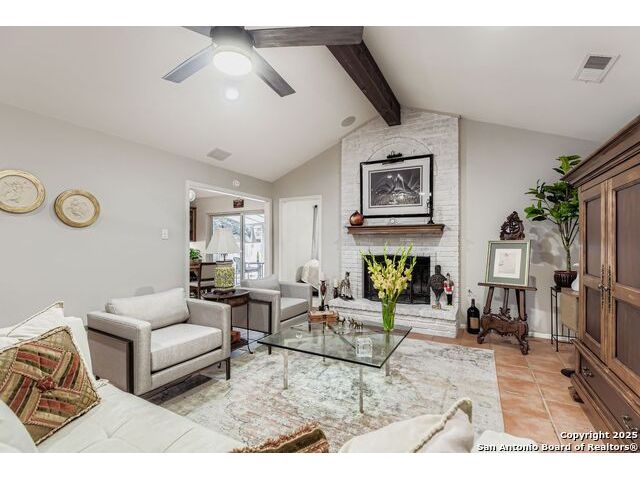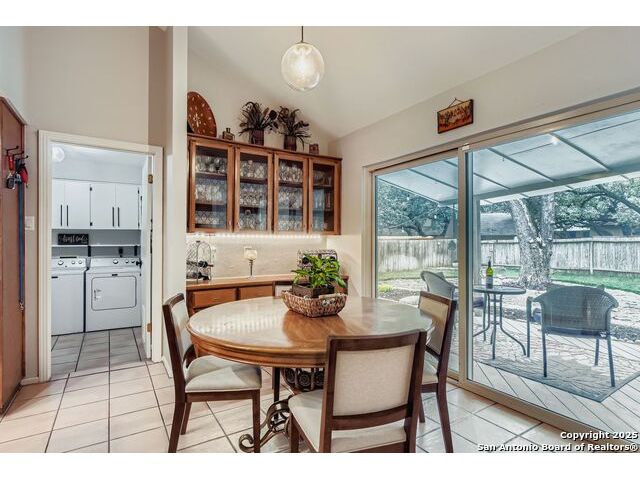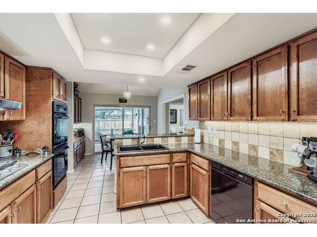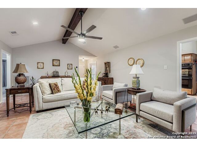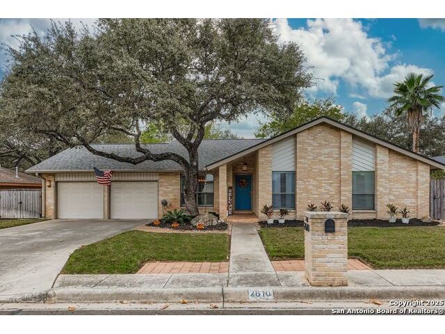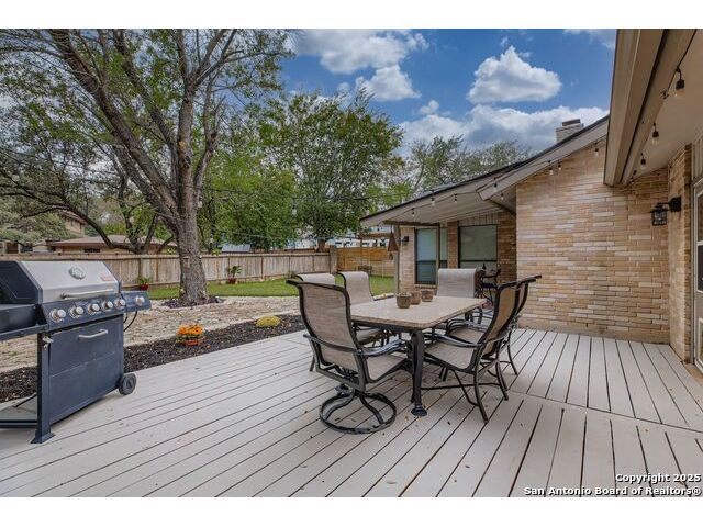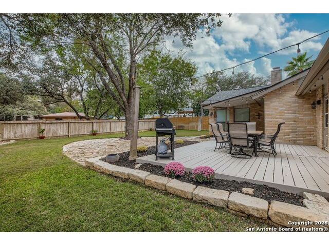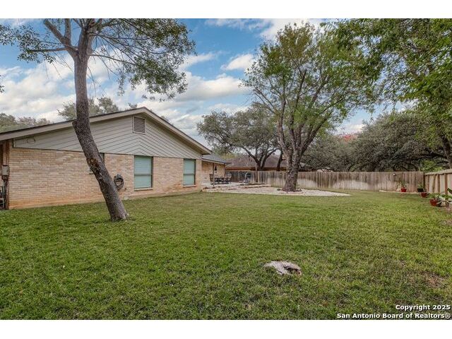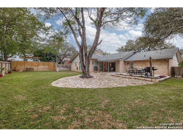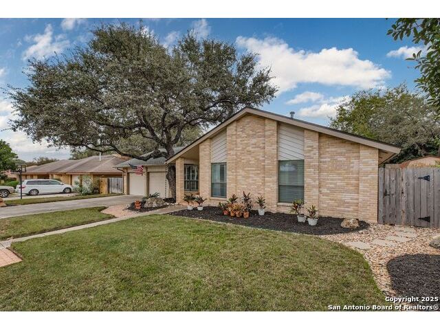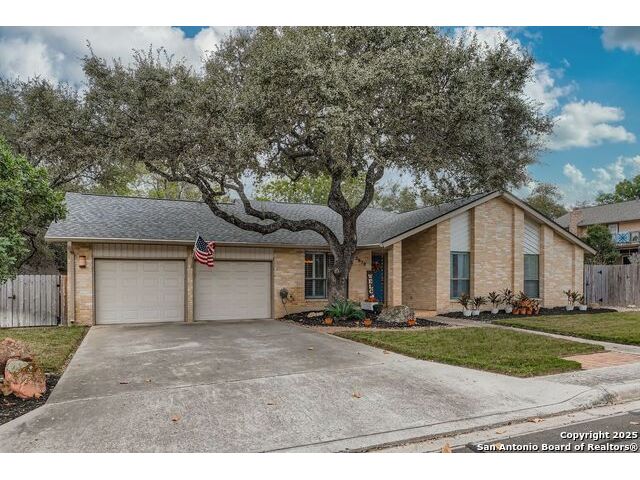 This single story Oak Hollow Estates residence is uniquely warm and elegant. It is superbly designed for both relaxation and entertaining. The moment you step inside, cathedral ceilings, stylish Saltillo tile and a grand fireplace establish the welcoming ambiance of the main living area - a space generous enough to accommodate gatherings with family or friends, yet intimate enough for quiet evenings. The kitchen is eye-catching with thoughtful functionality. Granite countertops provide a generous workspace that supports the gas-powered range and double ovens that most home cooks prefer. A breakfast nook with custom built-ins offers a place for everyday feel-good dining and morning coffee experiences as its oversized glass door windows overlook the tree lined yard. A separate dining room with plantation shutters provides distinct space for more formal gatherings. The three bedrooms include a primary suite that commands attention with its size and comfort and the primary bathroom sports large dual walk-in closets, an ultra- spacious shower, and dual vanities to create a personal retreat within the home. The family room is a perfect setting to enjoy movies or gaming - it is spacious and cozy with high ceilings and plenty of natural light. The outside property is an impressive asset, as it is beautiful, private, and large. The wide, tree lined backyard is secured by a privacy fence and transforms into a genuine extension of the home. A covered patio flows into an extended deck and flagstone area, creating distinct areas for different activities - whether you're grilling, lounging, or simply watching the Texas sky. An irrigation system keeps landscaping maintained without demanding your constant attention. The home sits within the NEISD school district, positioning you near quality educational options. At approximately 2,193 square feet, this layout balances spacious living with manageable maintenance, offering room for your life to unfold without excess.