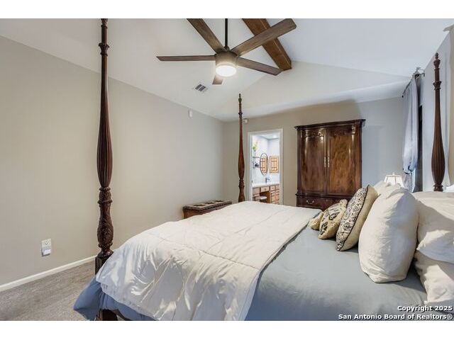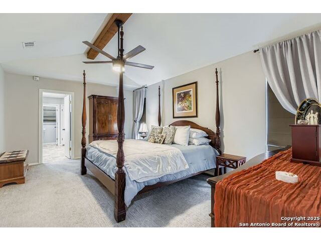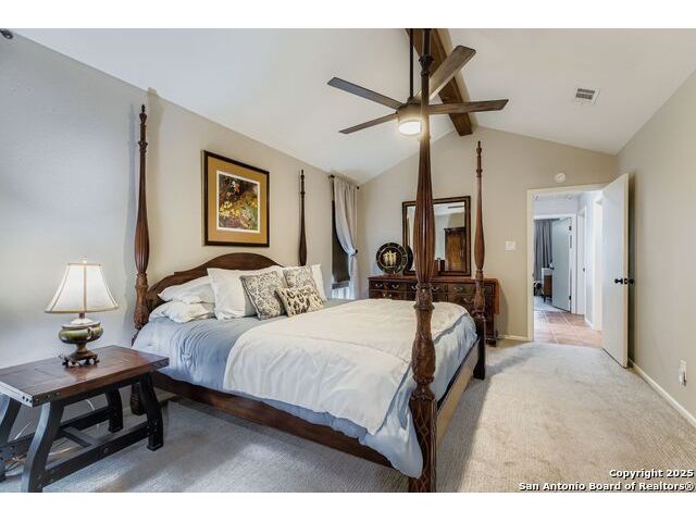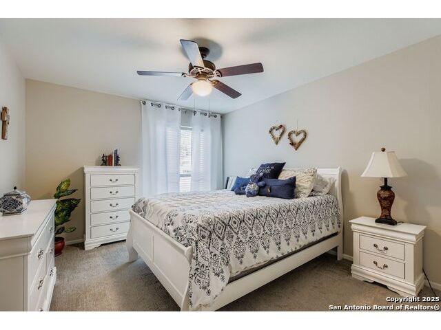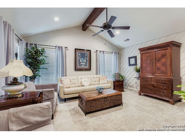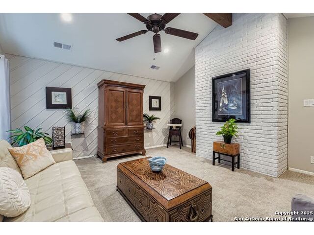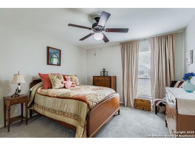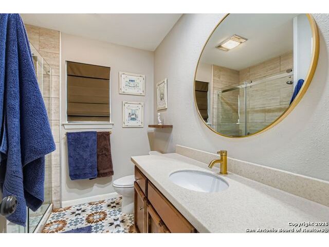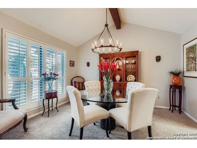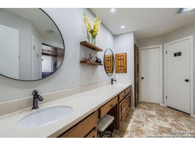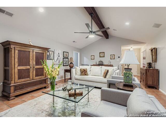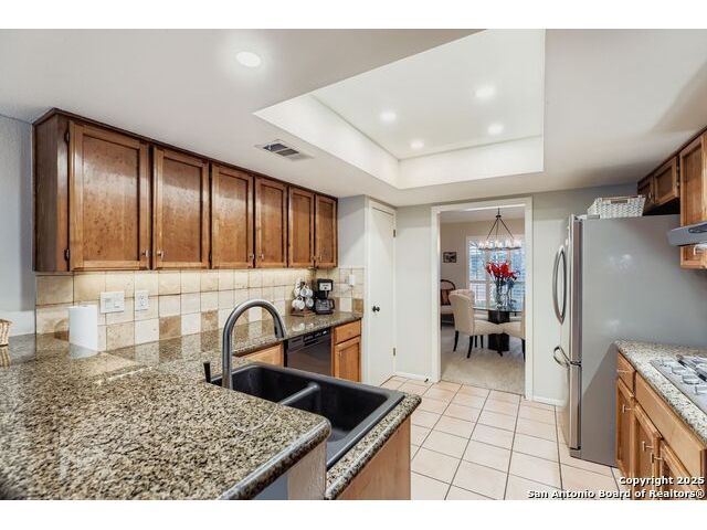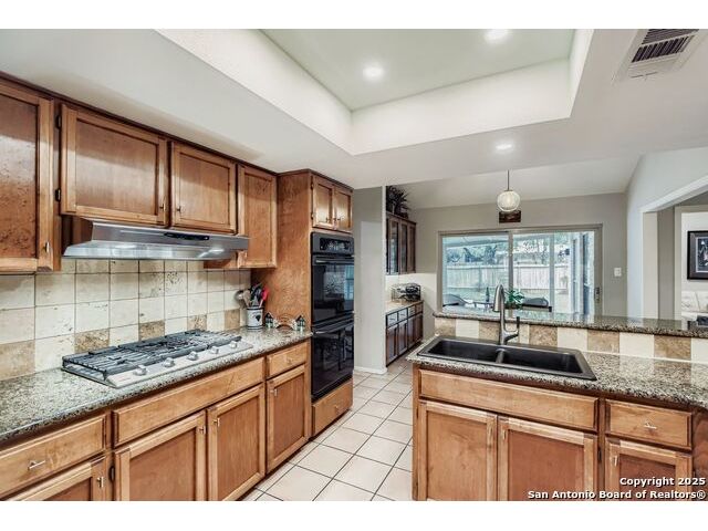 This single story Oak Hollow Estates residence is uniquely warm and elegant. It is superbly designed for both relaxation and entertaining. The moment you step inside, cathedral ceilings, stylish Saltillo tile and a grand fireplace establish the welcoming ambiance of the main living area - a space generous enough to accommodate gatherings with family or friends, yet intimate enough for quiet evenings. The kitchen is eye-catching with thoughtful functionality. Granite countertops provide a generous workspace that supports the gas-powered range and double ovens that most home cooks prefer. A breakfast nook with custom built-ins offers a place for everyday feel-good dining and morning coffee experiences as its oversized glass door windows overlook the tree lined yard. A separate dining room with plantation shutters provides distinct space for more formal gatherings. The three bedrooms include a primary suite that commands attention with its size and comfort and the primary bathroom sports large dual walk-in closets, an ultra- spacious shower, and dual vanities to create a personal retreat within the home. The family room is a perfect setting to enjoy movies or gaming - it is spacious and cozy with high ceilings and plenty of natural light. The outside property is an impressive asset, as it is beautiful, private, and large. The wide, tree lined backyard is secured by a privacy fence and transforms into a genuine extension of the home. A covered patio flows into an extended deck and flagstone area, creating distinct areas for different activities - whether you're grilling, lounging, or simply watching the Texas sky. An irrigation system keeps landscaping maintained without demanding your constant attention. The home sits within the NEISD school district, positioning you near quality educational options. At approximately 2,193 square feet, this layout balances spacious living with manageable maintenance, offering room for your life to unfold without excess.