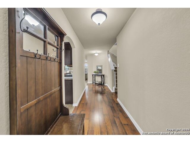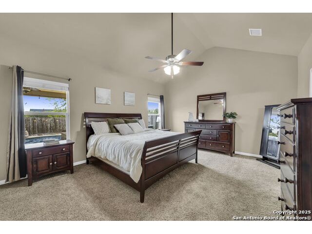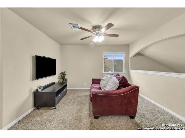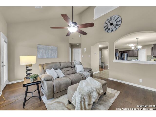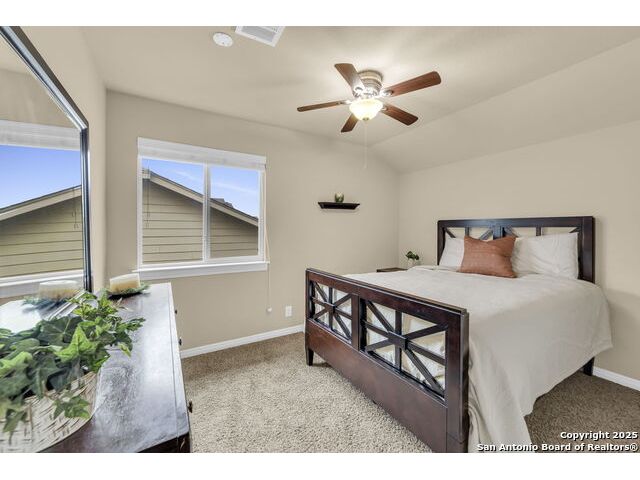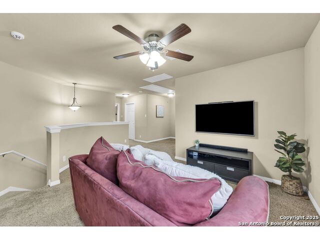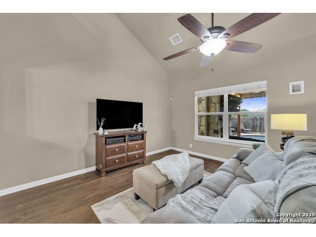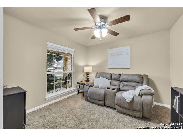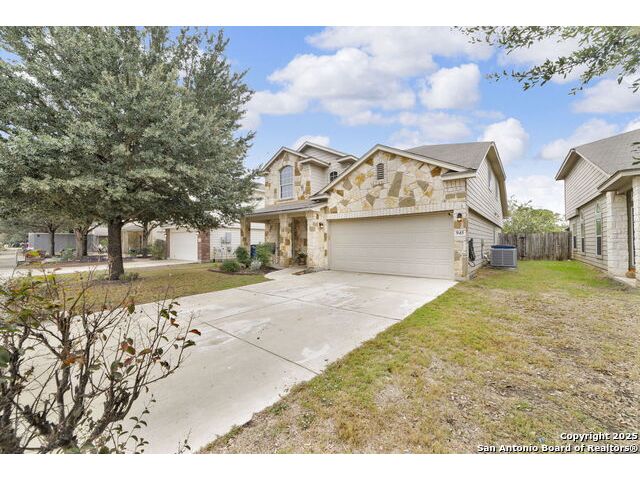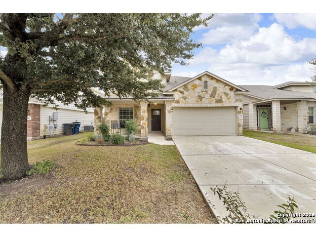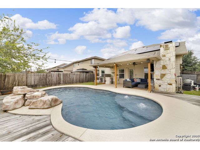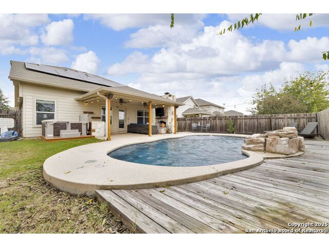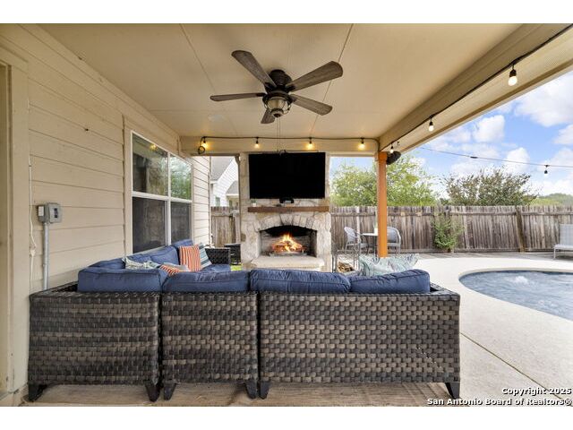Welcome to 945 Lauren, a beautifully designed 4-bed, 2.5-bath home offering the perfect blend of comfort, style, and privacy in the heart of New Braunfels. The primary suite is conveniently located downstairs, providing a peaceful retreat, while three spacious secondary bedrooms sit upstairs along with their own full bath and second living space. Ideal for everyone to have their own space. A dedicated office at the front of the home creates the perfect work-from-home setup or quiet study space. The open-concept living area flows seamlessly into the kitchen and dining, making this home perfect for everyday living and entertaining. Step outside to your own backyard oasis featuring a covered back porch with a cozy fireplace and a sparkling pool - the ultimate setup for Texas summers. Backing to a greenbelt, you'll enjoy added privacy with no rear neighbors and peaceful views year-round.