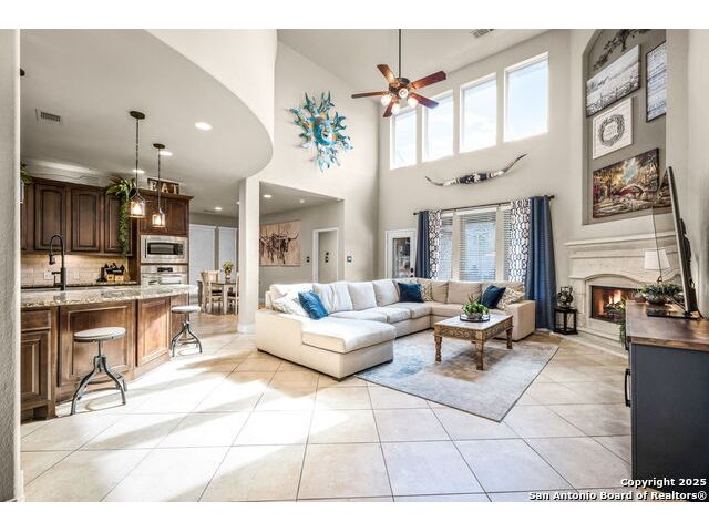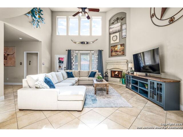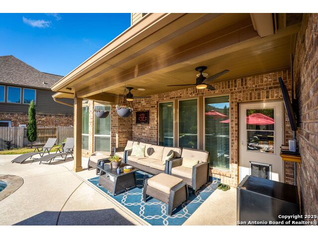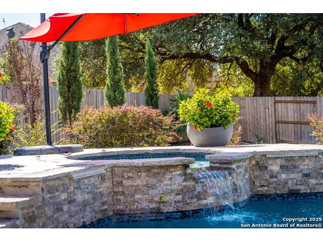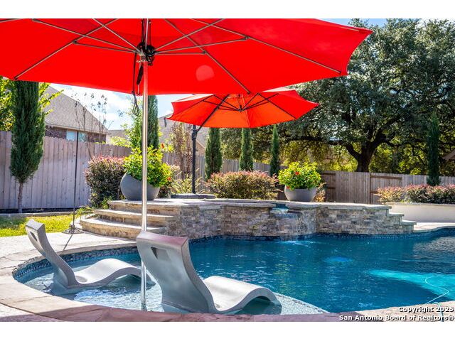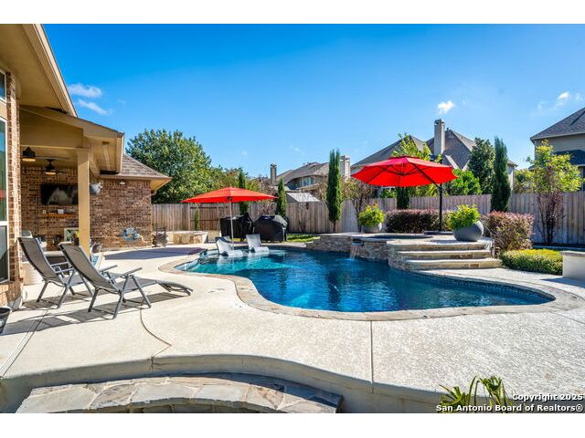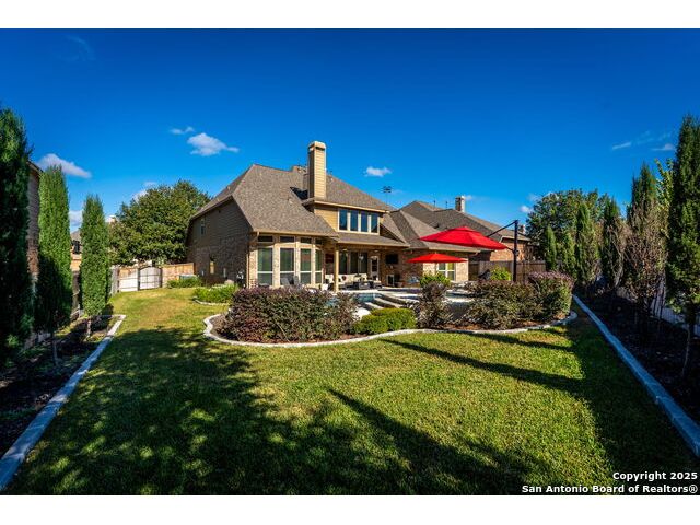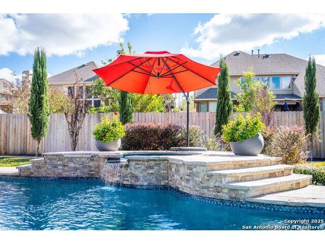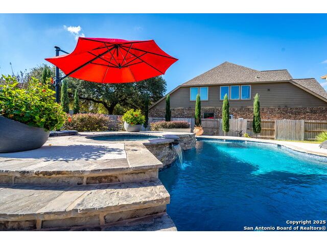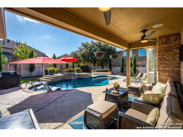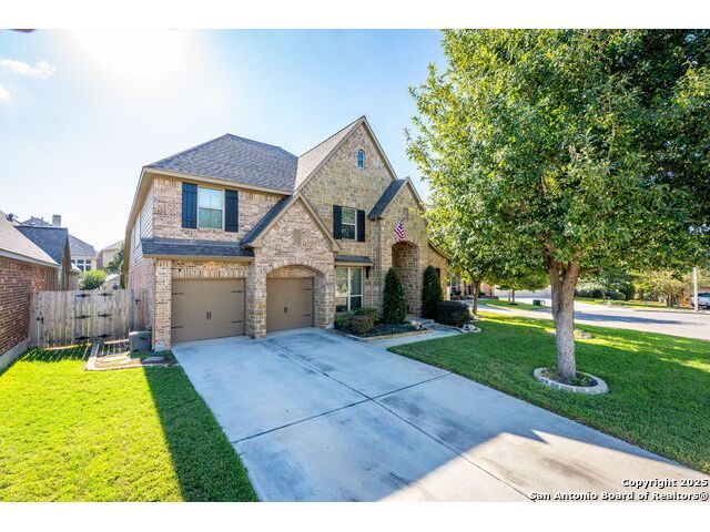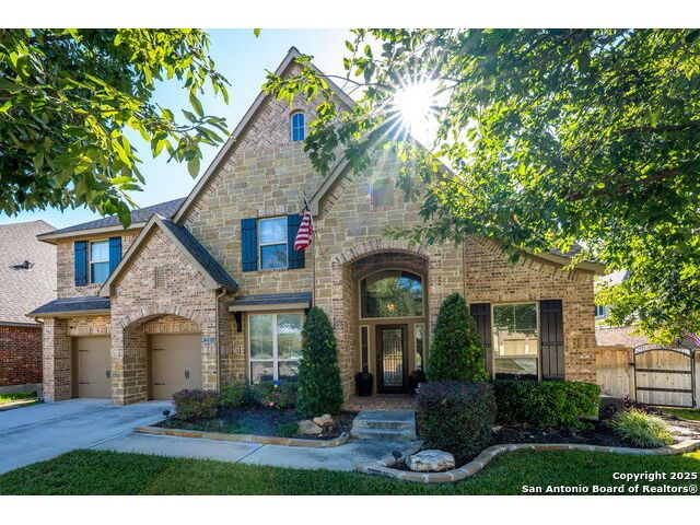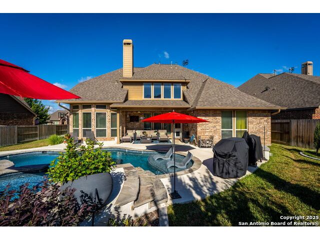 Welcome to this stunning 5-bedroom, 4.5-bathroom residence nestled in the highly sought-after Oak Run subdivision in New Braunfels, Texas. This exceptional two-story home offers an impressive blend of sophistication, comfort, and thoughtful design, all set on a beautifully landscaped lot with a custom-built gate and fencing that enhance both curb appeal and privacy. With its striking brick-and-stone exterior, mature trees, and meticulously maintained grounds, the property delivers a warm and inviting first impression the moment you arrive. Step inside to a spacious, open-concept layout featuring soaring high ceilings and an abundance of natural light. The large living room serves as the heart of the home, complete with a charming wood-burning fireplace, large windows overlooking the backyard oasis, and seamless flow into the kitchen and dining areas. The kitchen is designed for both everyday living and entertaining, offering a generous center island, gas cooking, ample cabinetry, sleek counters, and direct access to the cozy morning room-perfect for casual meals or enjoying your first cup of coffee. A formal dining room adds an elegant space for gatherings and holiday meals, while the dedicated office provides an ideal setting for remote work or quiet productivity. The home offers exceptional functionality with two bedrooms located on the main level, including a luxurious primary suite featuring a spa-inspired bathroom, dual vanities, a soaking tub, separate shower, and a spacious walk-in closet. The secondary downstairs bedroom, complete with its own private bath, is perfect for guests, multigenerational living, or a quiet retreat for extended family members. Upstairs, you'll find a thoughtfully designed layout that includes a large game room, a separate media room, and three additional bedrooms, each offering comfortable space and generous storage. A convenient Jack-and-Jill bathroom connects two of the upstairs bedrooms, adding to the home's practical and well-balanced floor plan. Step outside and escape to your very own backyard paradise. The highlight of this outdoor space is the custom pool featuring a relaxing tanning ledge, integrated seating, and beautiful stonework. Multiple lounge areas and an extended covered patio provide plenty of room for outdoor dining, entertaining, or simply unwinding after a long day. The lush landscaping, privacy fencing, and thoughtful design create a serene and inviting environment that feels like a private resort. Located in one of New Braunfels' most desirable neighborhoods, this Oak Run beauty is just minutes from NBISD schools, shopping, dining, medical facilities, and major commuter routes. Residents of Oak Run also enjoy access to community amenities including pools, parks, and walking paths, making it a fantastic place to live, relax, and thrive. This exceptional property seamlessly blends style, comfort, and modern living in a prime New Braunfels location. Don't miss the opportunity to make this remarkable home your own!