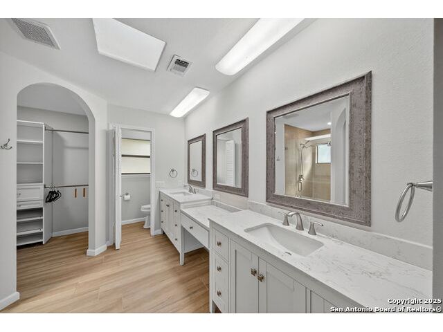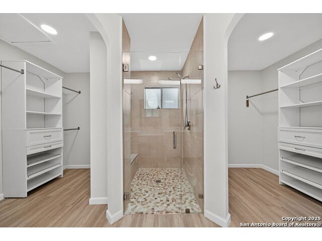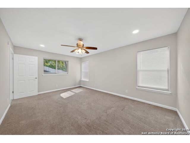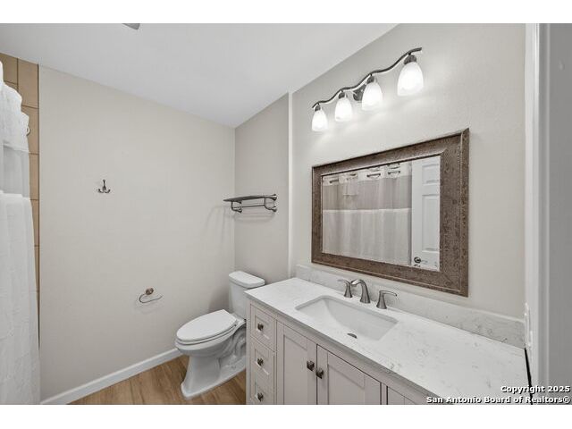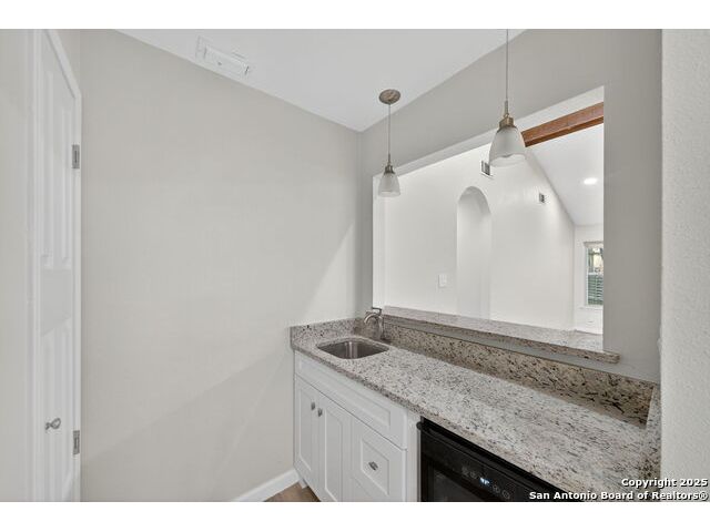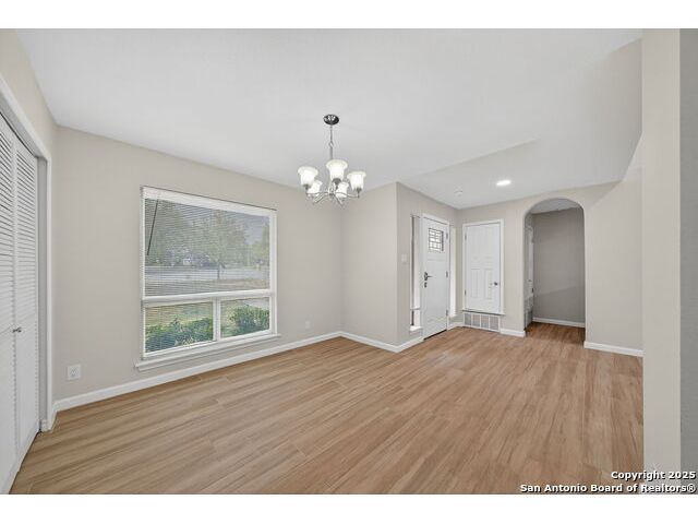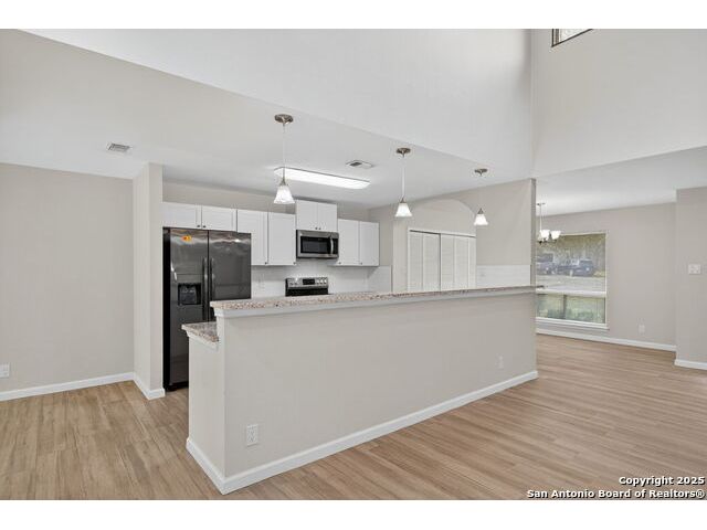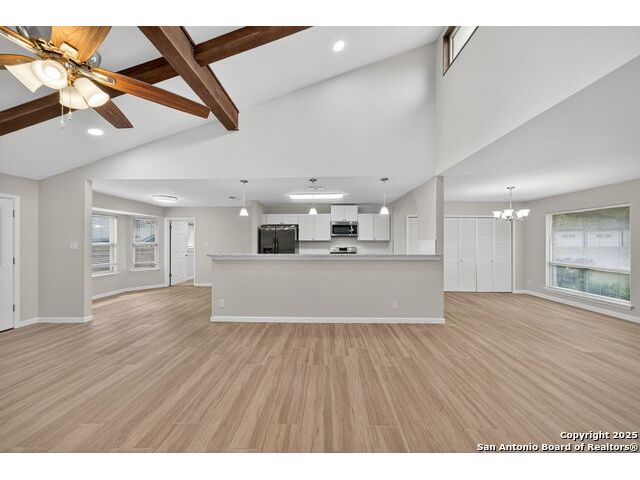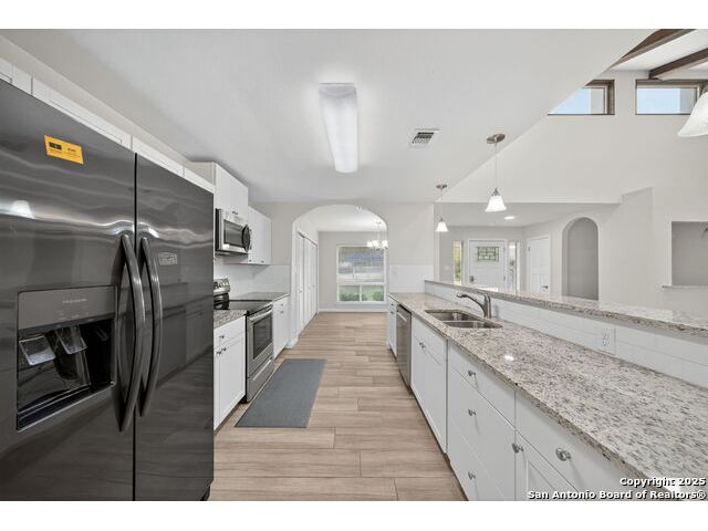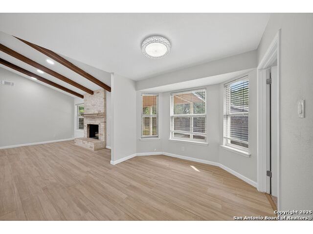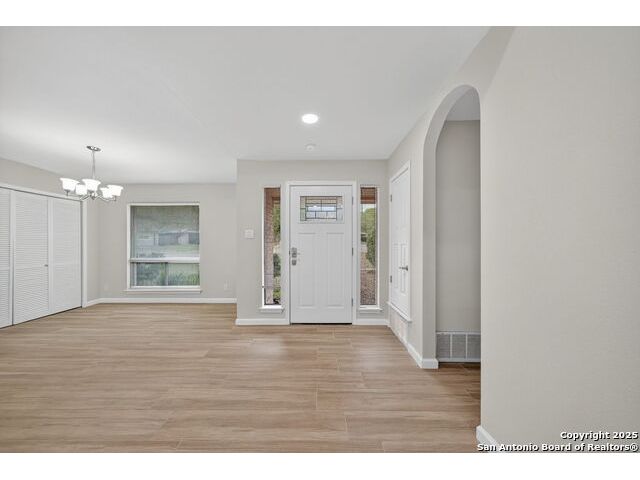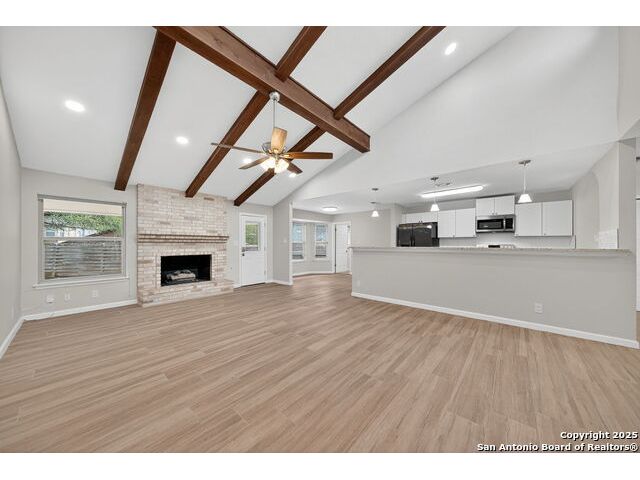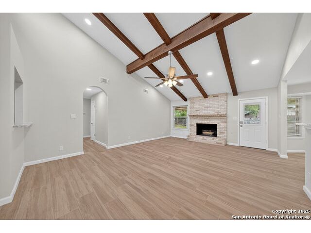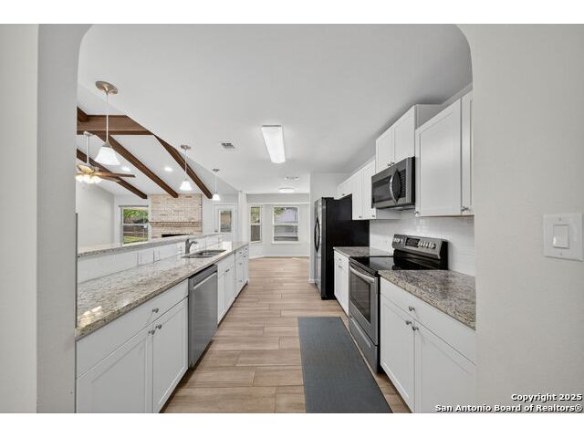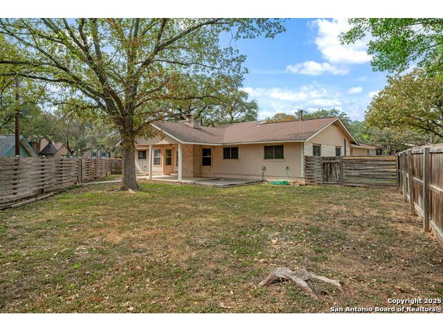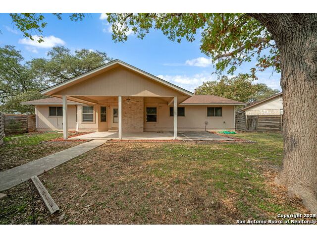 Stunning, fully updated 4-bedroom, 2-bathroom home now available in the highly sought-after Coronado Village community in Universal City! Step inside to find an inviting entryway that opens to a spacious living and dining area featuring beautiful high-end tile plank flooring. The living room offers impressive architectural detail with vaulted ceilings, exposed wood beams, and a cozy wood-burning fireplace-perfect for relaxing or entertaining. The recently renovated kitchen overlooks the living room and breakfast area, creating an ideal open-concept layout. It boasts granite countertops, modern shaker cabinets, a stylish tile backsplash, and sleek stainless-steel appliances. The private primary suite provides ample space and a completely redesigned en-suite bathroom showcasing dual separate vanities, an oversized walk-in shower with floor-to-ceiling tile, and a built-out his-and-hers closet. All secondary bedrooms are generously sized and include ceiling fans for added comfort. Step outside to a large covered and extended patio-perfect for weekend BBQs and outdoor gatherings. Mature trees surround the home, offering shade and curb appeal, and the property sits peacefully on a cul-de-sac. The convenient location offers easy access to Loop 1604, I-35, and Randolph AFB. This home shows beautifully-a true must-see!
