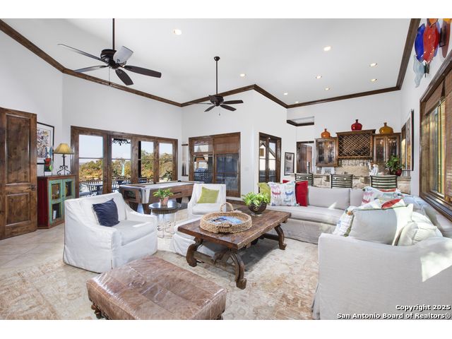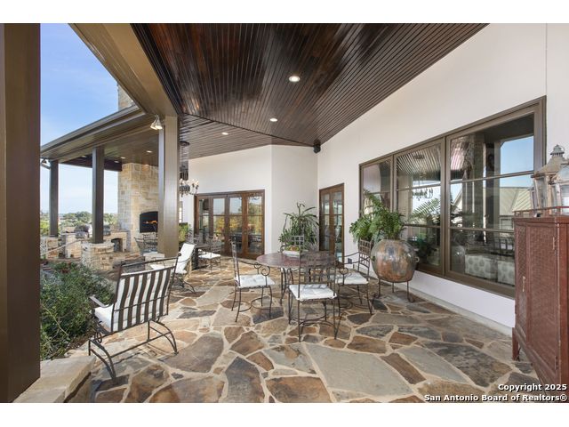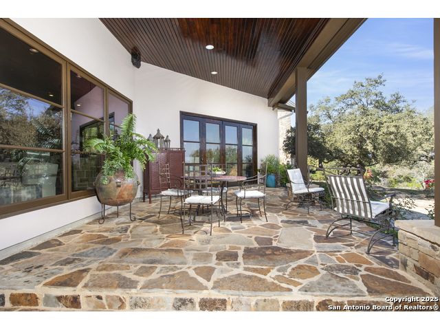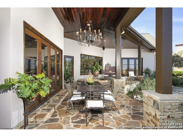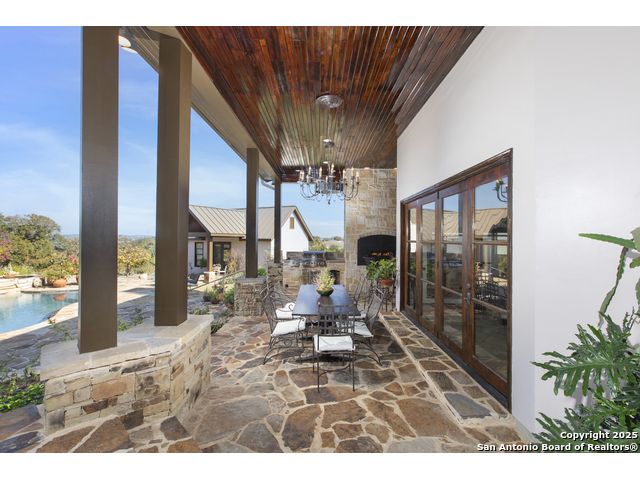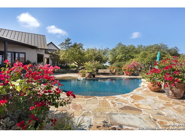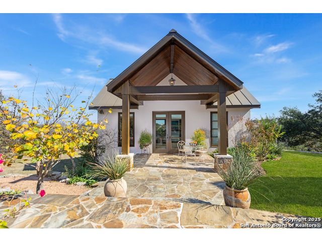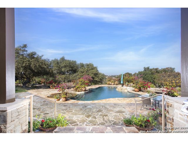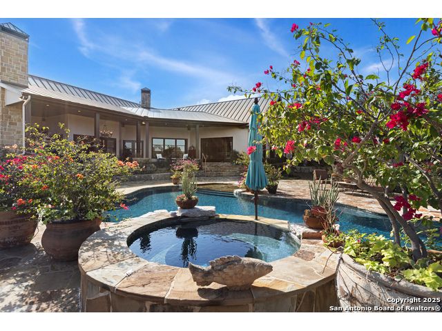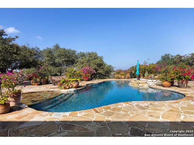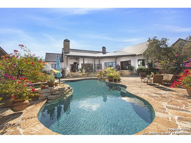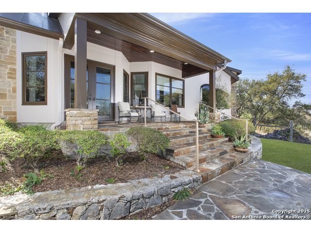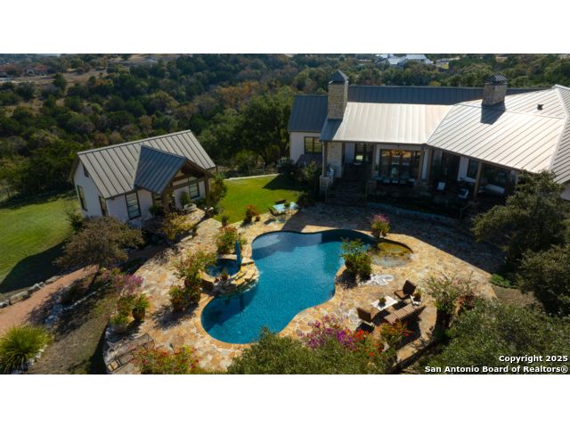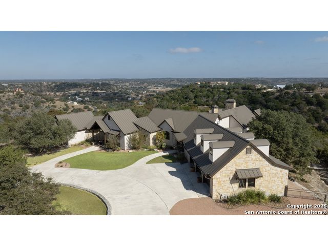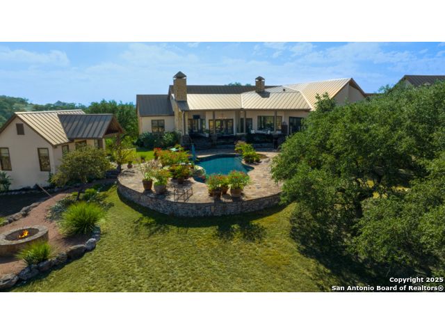 165 Painted Sky is an Incredible Hill Country Custom Home with jaw dropping views from every window located in The Reserve at Falling Water, an exclusive private gated neighborhood between Comfort and Fredericksburg. This majestic home features a massive outdoor entertaining area overlooking 12+ acres with panoramic views in every direction. You'll enjoy the refreshing beach entry pool and hot tub, deep covered gallery porches and stone decking for entertaining, The home offers 4 Bedrooms in the Main Dwelling with an additional one bedroom Casita. The Casita is fully functional w/Kitchen, Living Area, Separate Bed & Bath + laundry. The custom Home was built by Buffalo Homes featuring detailed finishes such as Masonry fireplaces, wood & tile floors, soaring ceilings, abundant stonework, solid wood doors and countless other custom detailing. Built for entertaining in the classic Hill Country style, the Great Room & Dining area are some of the perfect areas for gatherings. The chef-inspired Kitchen is open w/custom granite countertops, gorgeous views, plentiful cabinets, stone-clad center island & high end appliances such as Subzero and Wolf. The commanding Primary Bedroom suite is a spacious restful retreat w/fireplace and doors opening to a covered patio to enjoy the views. The luxe spa-inspired bath offers dual sinks overlooking the views, soak tub and expansive closets w/built-ins. 3 additional comfortable bedrooms round out the Main House. You'll have plenty of room to hike and explore this estate w/trails and spectacular view vantage points. The neighborhood offers a Wildlife Exemption and a community water system that is conveniently located w/close proximity to world famous Fredericksburg, Boerne and Comfort. This timeless Hill Country Estate is the epitome of luxury living.