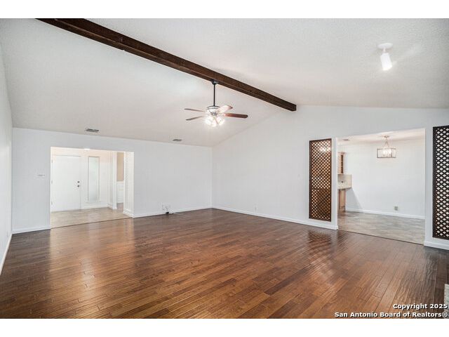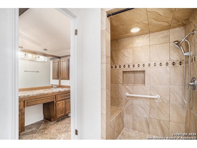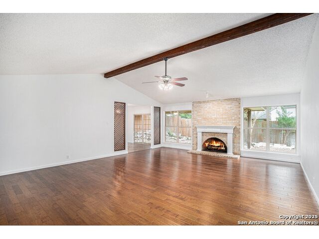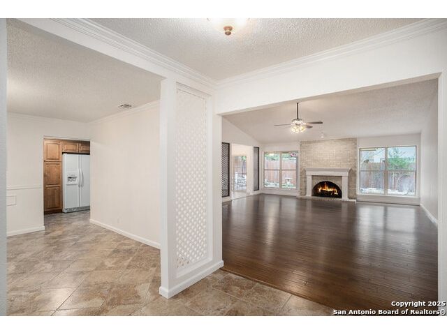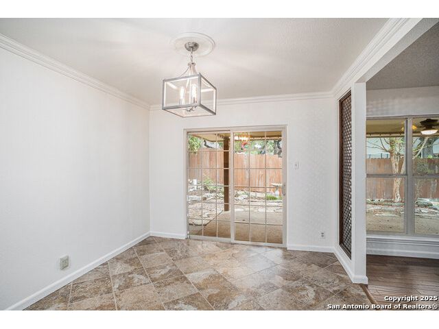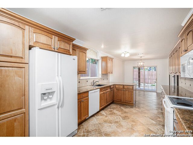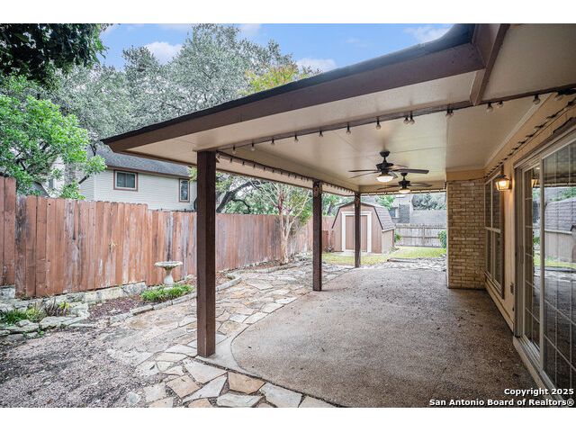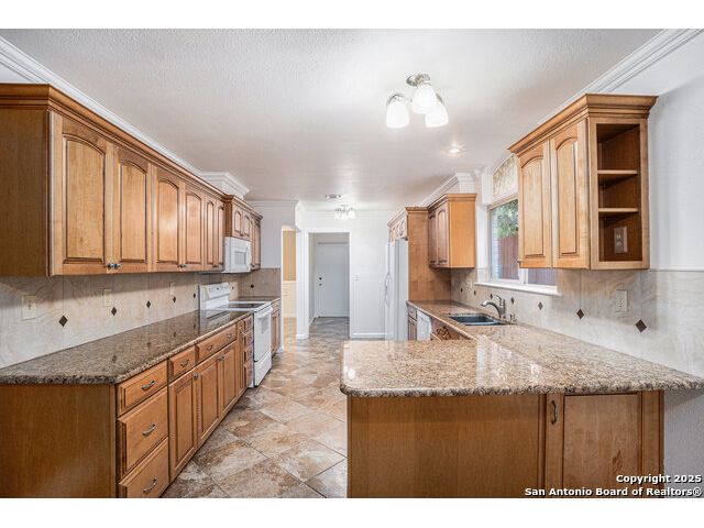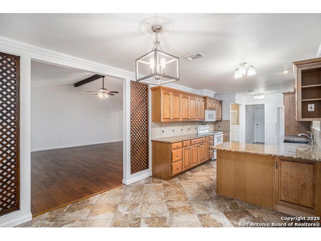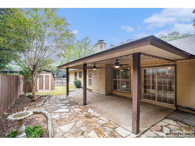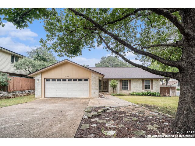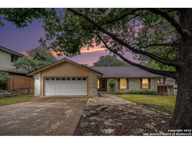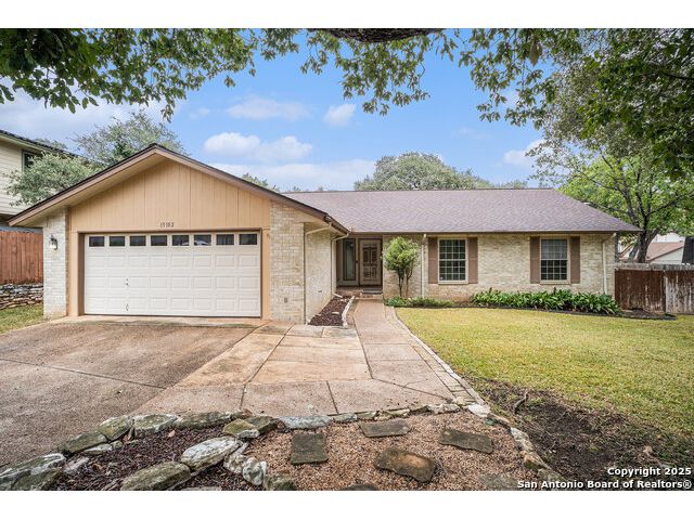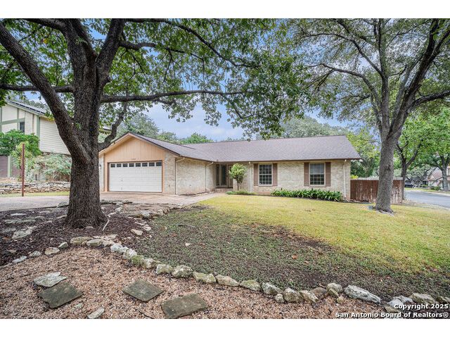 Located in the sought-after Oak Hollow Estates subdivision, this beautifully maintained and updated 4-bedroom, 2-bath home offers exceptional style, comfort, and convenience on a premium corner lot. Thoughtful exterior enhancements-including unique hardscaping, a rock wall, xeriscaping, and a striking glass front door-set an inviting tone before you even step inside. Double-pane windows enhance both efficiency and quiet enjoyment. A warm foyer leads to a stunning formal dining room accented with custom lattice wood slat walls that frame the entry with architectural character. The expansive living room impresses with vaulted ceilings, exposed wood beams, a cozy fireplace, and matching custom lattice wood slat wall inserts that define the transition into the oversized kitchen. This upgraded culinary space features granite counters, custom Kraftmaid cabinetry, modern lighting, high ceilings, and abundant crown molding for a refined touch. Above the sink, a charming custom stained-glass window serves as a striking focal point, filtering in soft, colorful light that elevates the kitchen's ambiance. This timeless feature adds refined character while welcoming natural light and serene views into the space. The primary suite is privately positioned away from the secondary bedrooms and includes an ensuite bath with granite countertops and a wheelchair-accessible shower. The home offers true ease of living with hardwood and 18" ceramic tile floors throughout-no carpet-and thoughtful handicap-accessible features. Additional highlights include an epoxy-coated garage floor and an updated electric circuit breaker box for peace of mind. The spacious backyard is perfect for outdoor living with a large, covered patio equipped with ceiling fans, plus a storage shed for tools and gear. Located near great schools and Hwy 281, inside Loop 1604, McAllister Park, shopping, entertainment, and the local library, this home combines style, accessibility, and an unbeatable location.