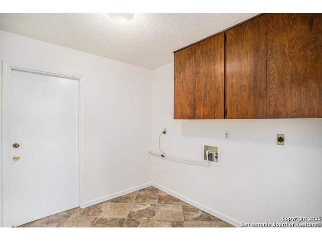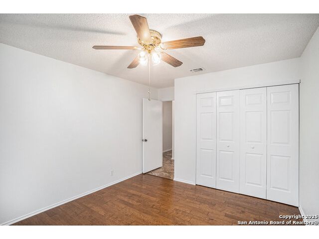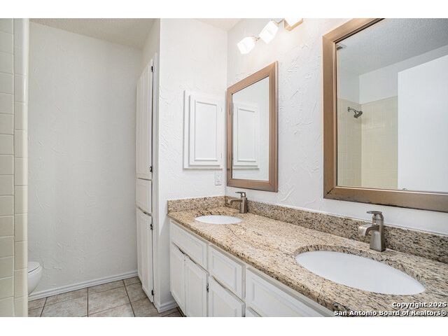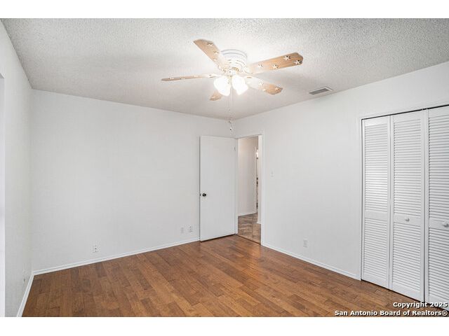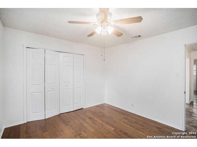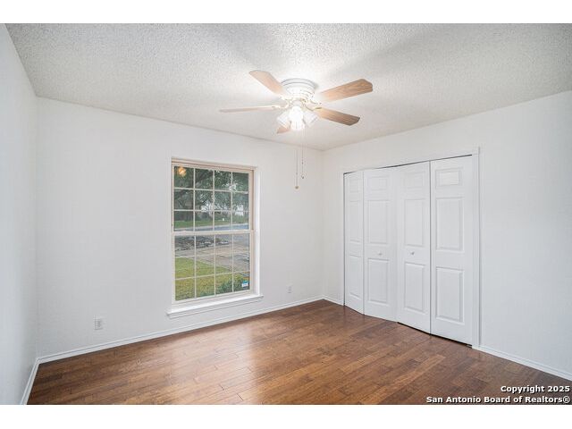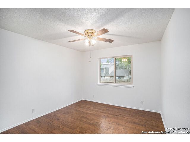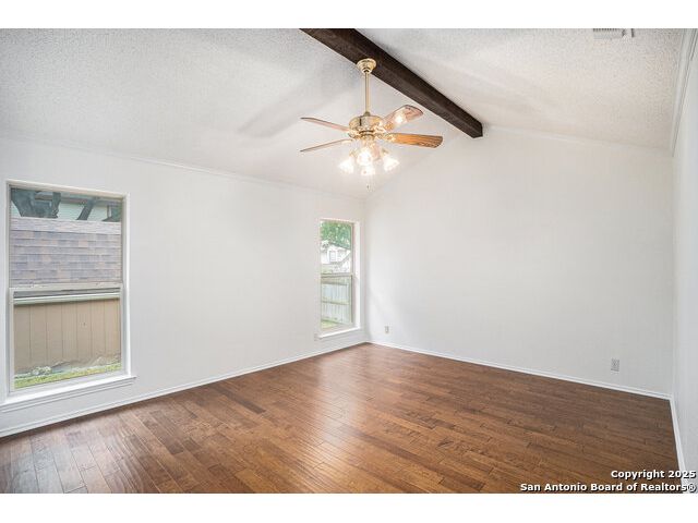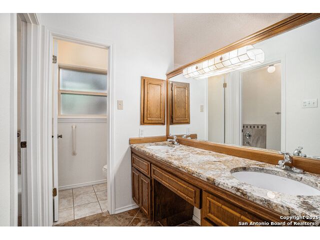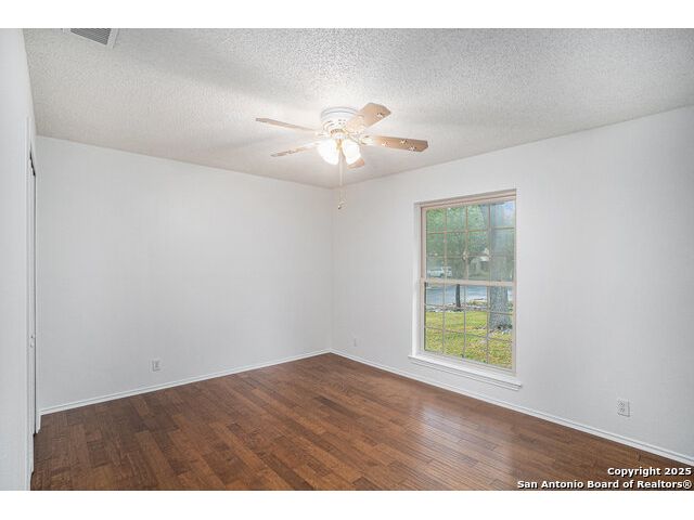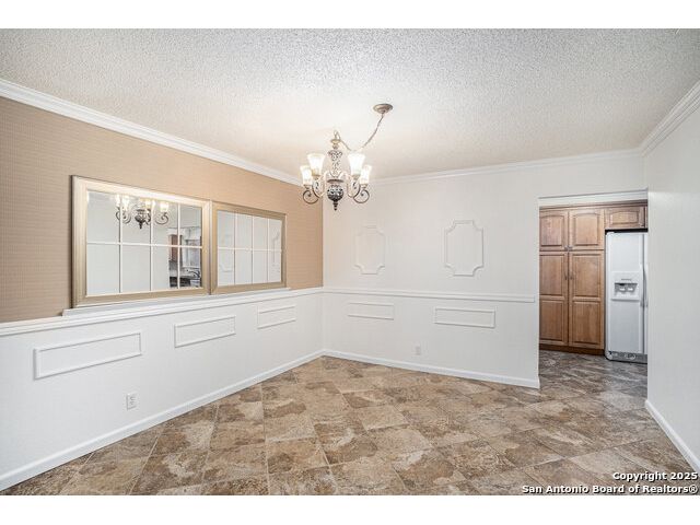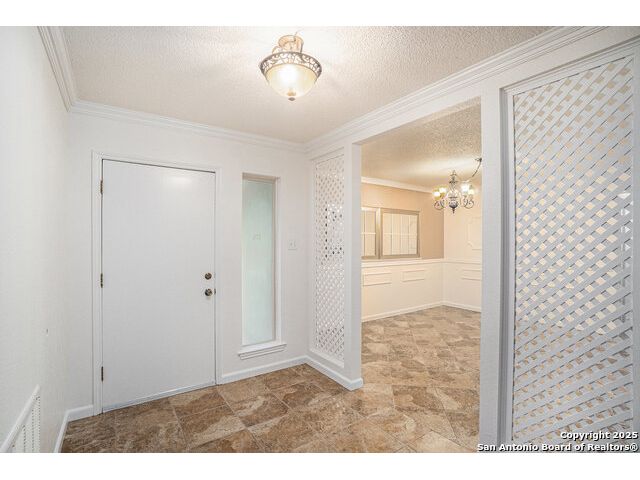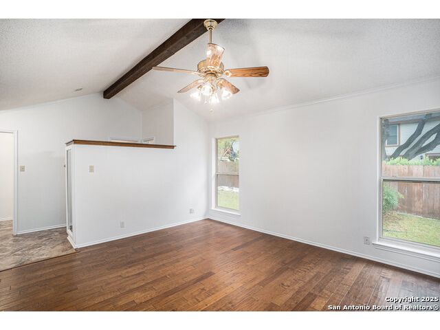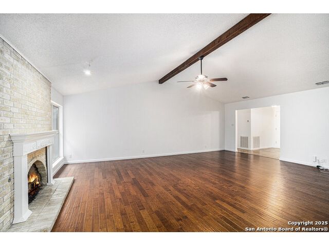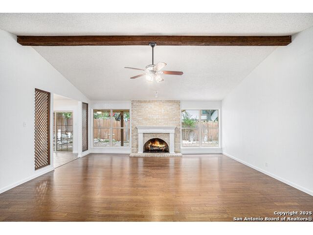 Located in the sought-after Oak Hollow Estates subdivision, this beautifully maintained and updated 4-bedroom, 2-bath home offers exceptional style, comfort, and convenience on a premium corner lot. Thoughtful exterior enhancements-including unique hardscaping, a rock wall, xeriscaping, and a striking glass front door-set an inviting tone before you even step inside. Double-pane windows enhance both efficiency and quiet enjoyment. A warm foyer leads to a stunning formal dining room accented with custom lattice wood slat walls that frame the entry with architectural character. The expansive living room impresses with vaulted ceilings, exposed wood beams, a cozy fireplace, and matching custom lattice wood slat wall inserts that define the transition into the oversized kitchen. This upgraded culinary space features granite counters, custom Kraftmaid cabinetry, modern lighting, high ceilings, and abundant crown molding for a refined touch. Above the sink, a charming custom stained-glass window serves as a striking focal point, filtering in soft, colorful light that elevates the kitchen's ambiance. This timeless feature adds refined character while welcoming natural light and serene views into the space. The primary suite is privately positioned away from the secondary bedrooms and includes an ensuite bath with granite countertops and a wheelchair-accessible shower. The home offers true ease of living with hardwood and 18" ceramic tile floors throughout-no carpet-and thoughtful handicap-accessible features. Additional highlights include an epoxy-coated garage floor and an updated electric circuit breaker box for peace of mind. The spacious backyard is perfect for outdoor living with a large, covered patio equipped with ceiling fans, plus a storage shed for tools and gear. Located near great schools and Hwy 281, inside Loop 1604, McAllister Park, shopping, entertainment, and the local library, this home combines style, accessibility, and an unbeatable location.