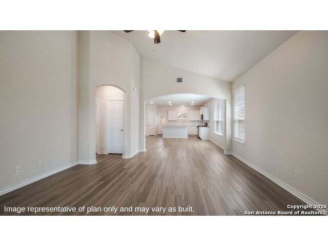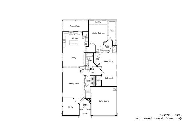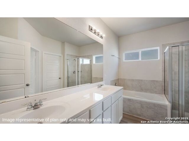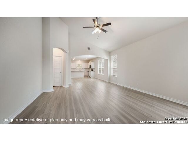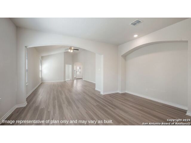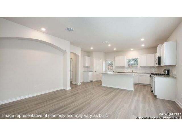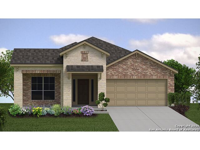 The Driftwood plan is our largest one-story home offered in Brookstone Creek in San Antonio, TX. Featuring 3 classic front exterior, 3 bedrooms, 2 bathrooms, a 2-car garage and 2050 square feet of functional living space, this floor plan is sure to turn heads. As you come inside The Driftwood, you will first see a stunning office area with double doors facing a grand living room, complete with tall ceilings, a ceiling fan and plenty of windows, creating a light and bright space for entertaining. The living room opens to a large dining area and an eat-in kitchen with beautiful quartz countertops, stainless steel appliances, stylish shaker cabinetry and a large island workspace. A standout feature of the kitchen is the deep single basin sink that overlooks a covered back patio (per plan) and backyard with full landscaping and irrigation. A private hallway off the kitchen leads to the main bedroom which includes quality carpet, large windows, a ceiling fan and a spacious ensuite bathroom. Your ensuite comes complete with dual vanity sinks, a tiled walk-in shower, separate water closet and an oversized walk-in closet. All secondary bedrooms offer quality carpeted floors and walk-in closet. These rooms are versatile. Use them as bedrooms, offices, work out rooms or other bonus spaces. Additional features of The Driftwood floor plan include white marble countertops in all bathrooms, elevated hard surface flooring in all wet areas, pre-plumb for water softener loop and window blinds throughoutt the home and our HOME IS CONNECTED base package. Using one central hub that talks to all the devices in your home, you can control the lights, thermostat and locks, all from your cellular device.