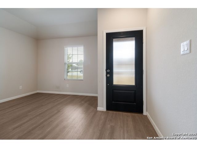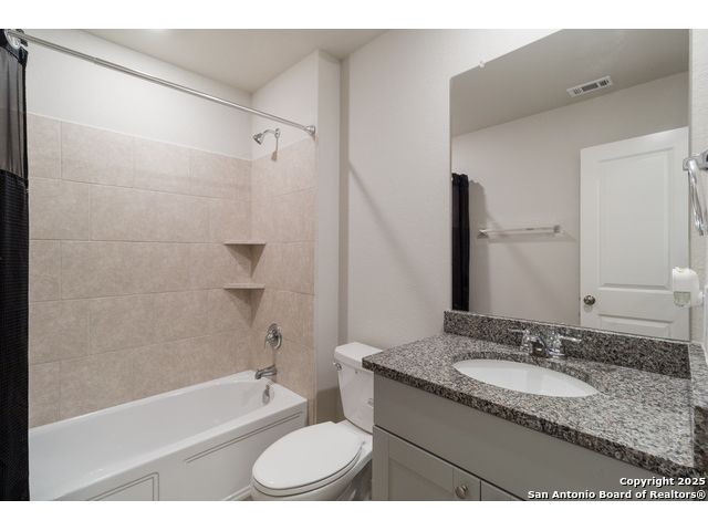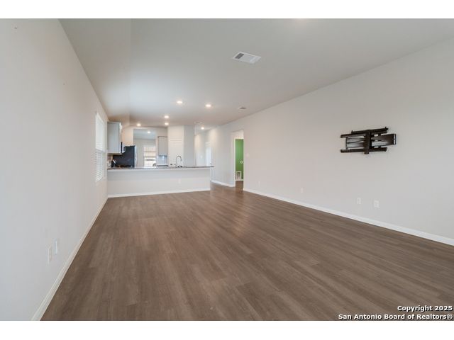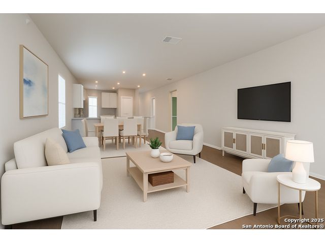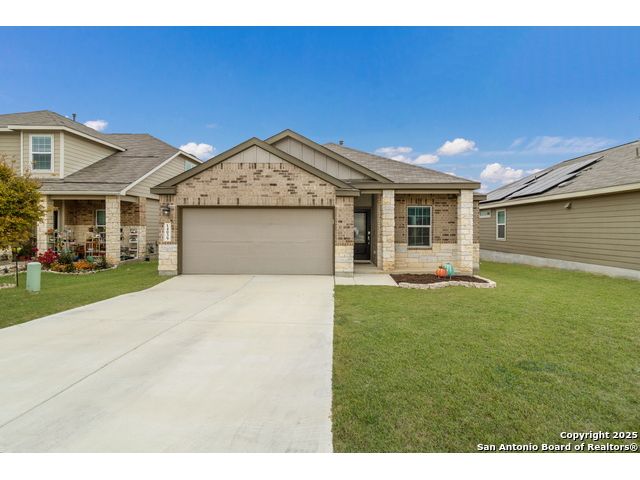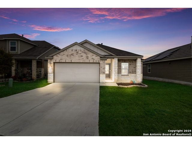 Welcome home to this beautifully maintained 1,645 sq ft single-story featuring an open-concept layout with 3 spacious bedrooms, 2 baths, and a versatile flex room perfect for a home office, playroom, or formal dining. The gorgeous kitchen offers granite countertops and overlooks the bright and inviting living area, creating the perfect space for gatherings. The private primary suite includes a double vanity with granite, a generous walk-in closet, and a stunning oversized tiled walk-in shower. This home also includes thoughtful upgrades such as a water softener (only 2 years old), sprinkler system, newer microwave (2025), new garbage disposal (2025), and a newer refrigerator (2023). With its charming brick-and-stone exterior, large covered patio, and incredible backyard view, this home provides both comfort and style. Located in a community known for amazing amenities, scenic trails, over five beautiful lakes, and just 11 miles from Lackland AFB, this home truly has it all-come see this gorgeous home today!