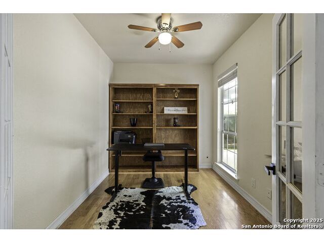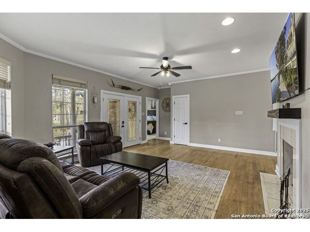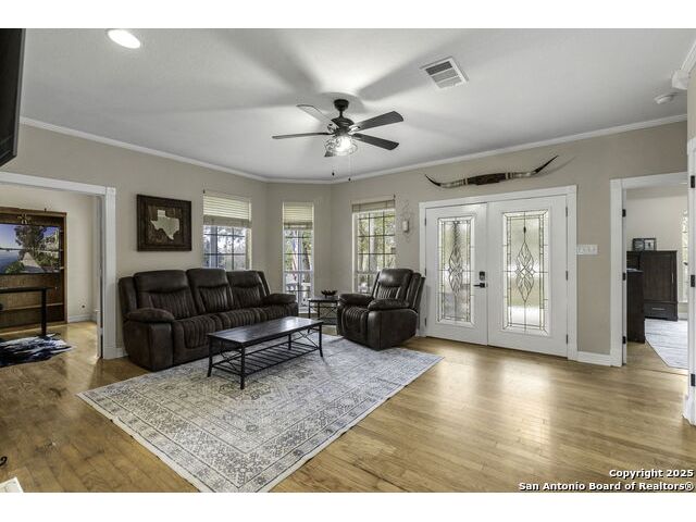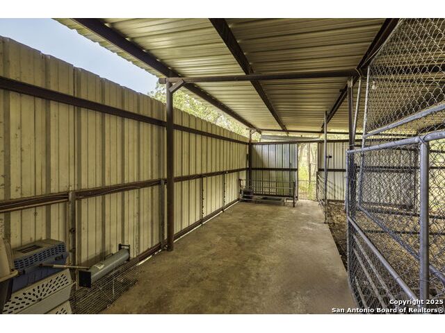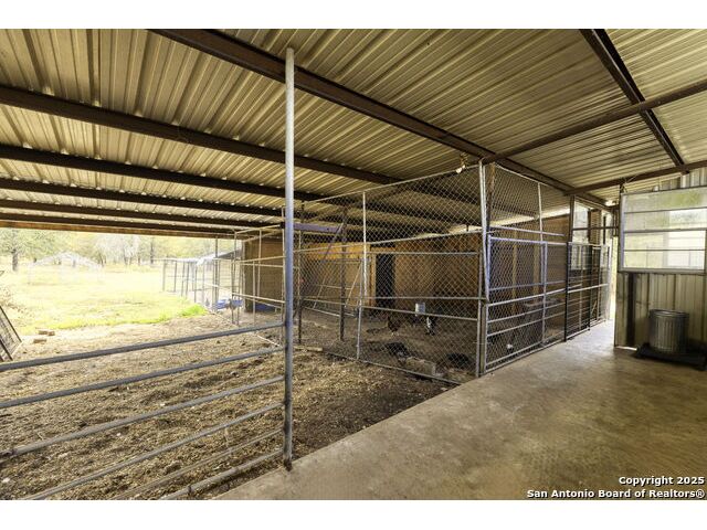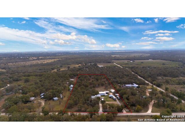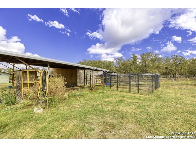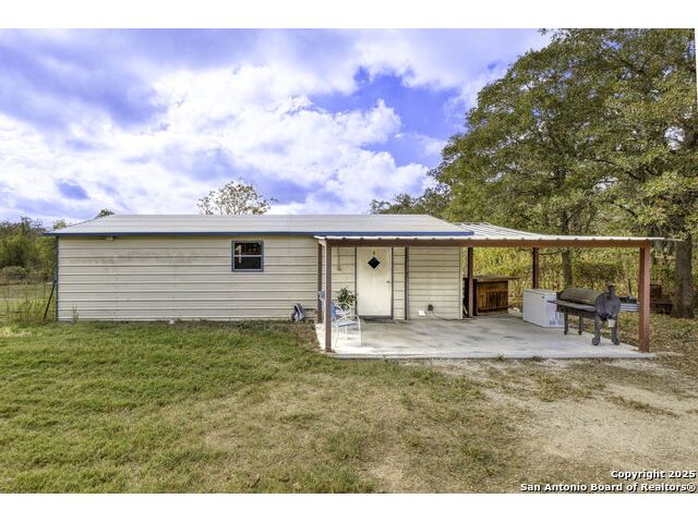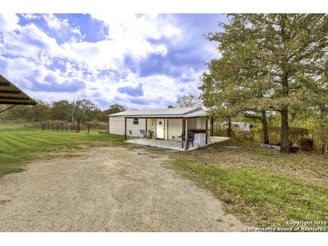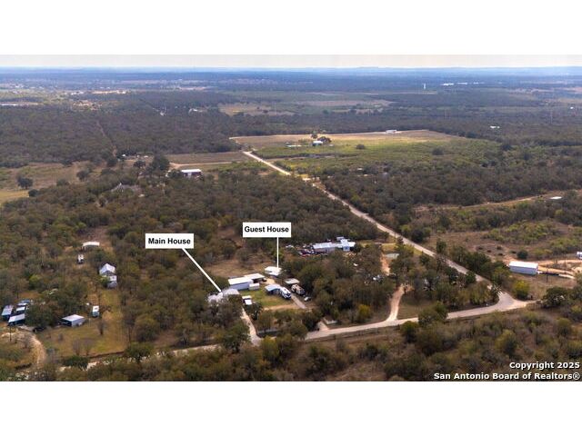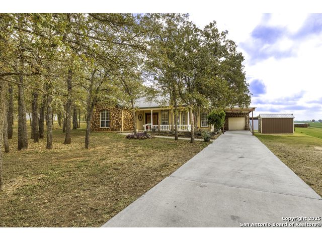 Two Homes on 5 acres! Discover country living on this beautifully maintained 5-acre property just outside Seguin, complete with two homes, mature trees, level land, and full fencing. The main home(1684 sq ft) offers 3 bedrooms, 2 bathrooms, and an office behind French doors. Features include hardwood flooring in the living room and office, a two-sided fireplace with mantle that opens to both the living room and kitchen, new tile flooring in the kitchen and dining area, a new tile backsplash, white cabinets, a built-in butcher-block coffee bar, and a huge walk-in pantry. The spacious mud/laundry room has exterior access and a direct connection to the attached garage/workshop. The primary bedroom includes a walk-in closet and an ensuite bath with separate tub and shower, while the two secondary bedrooms offer large closets and share a hall bathroom. Split floor plan for added privacy. The separate guest home (483 sq ft), located in a barndominium structure, includes 1 bedroom, 1 bathroom, a full kitchen, and a large living room, along with a wrap-around porch. It also has a separate entrance off the road making it a great opportunity for income or multi gen living! The barn is ready for horses, chickens, or other livestock, featuring a slab washing area and covered spaces for additional stalls. Additional amenities include two 50-amp RV hookups, multiple storage sheds, and covered storage. Convenient access to SH-130 and I-10 provides an easy commute to San Antonio and Austin.