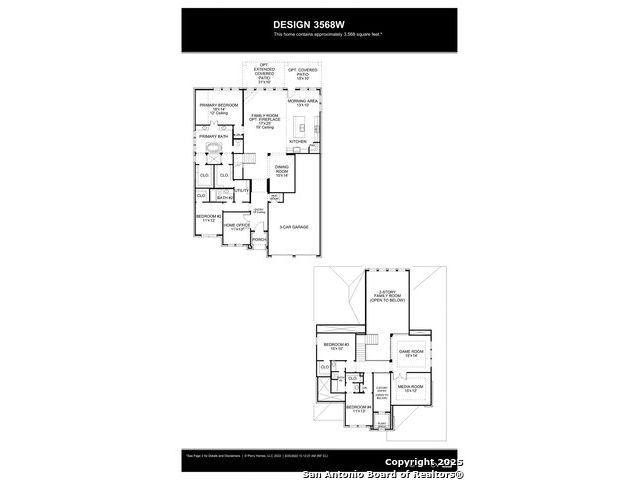 Home office with French doors framing the entry with 19-foot ceiling. Formal dining room flows into the family room and kitchen. Family room hosts a wall of windows, wood mantel fireplace and a 19-foot ceiling. Island kitchen with built-in seating space, a 5-burner gas cooktop and a walk-in pantry flows into the morning area. Primary bedroom with a wall of windows. Primary bathroom hosts a French door entry, dual vanities, freestanding tub, separate glass enclosed shower and two walk-in closets that offer private access to the utility room. Additional bedroom with walk-in closet on first level. Second level hosts secondary bedrooms, a Hollywood bathroom, game room and a media room with French doors. Extended covered backyard patio and a 5-zone sprinkler system. Mud room just off the three-car garage.
