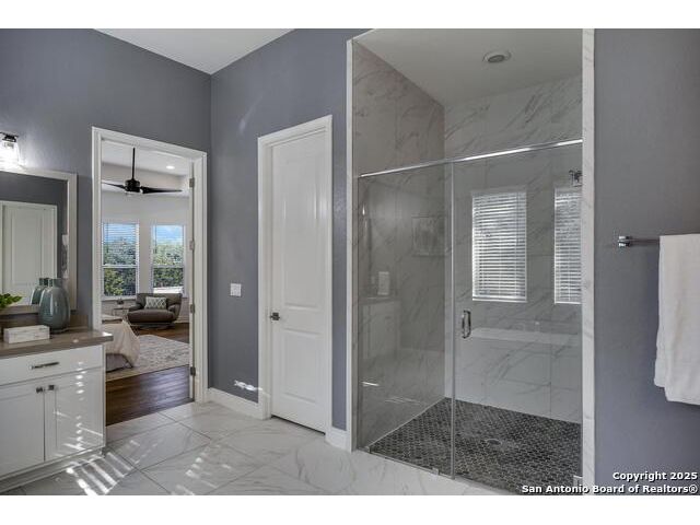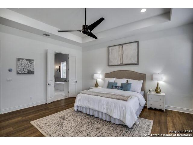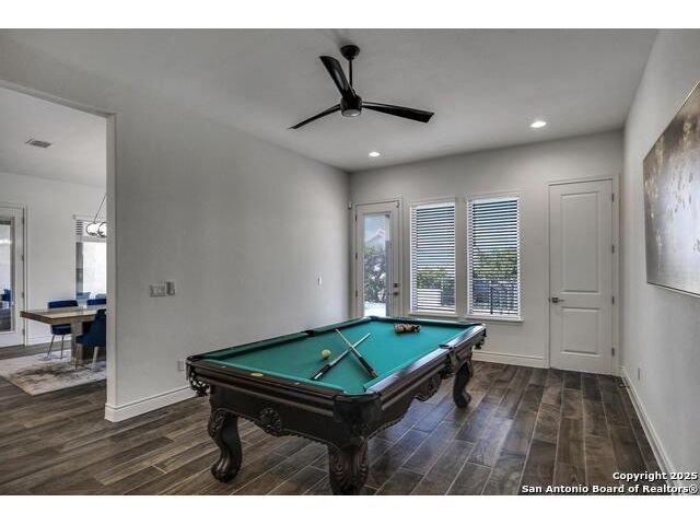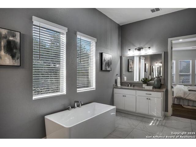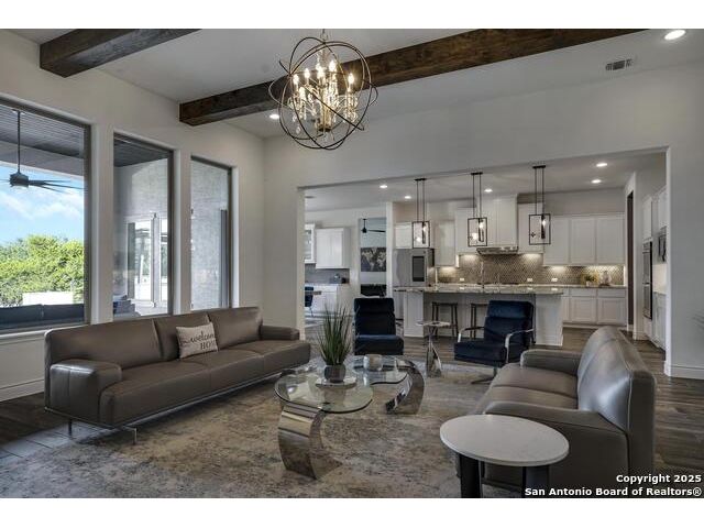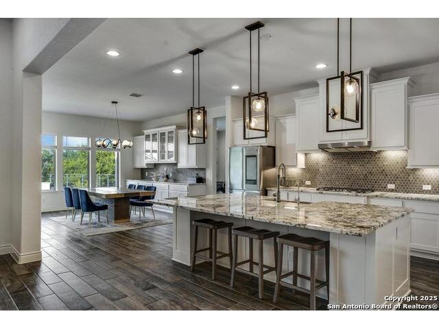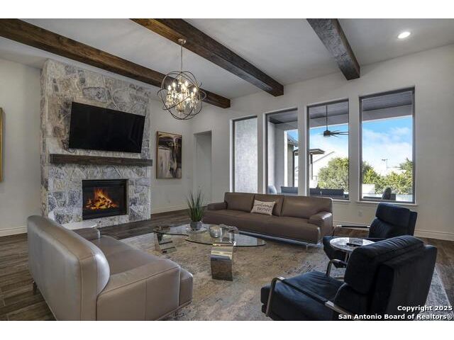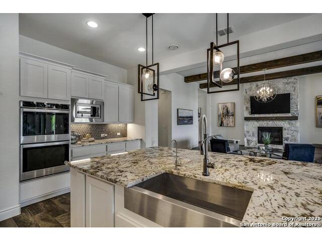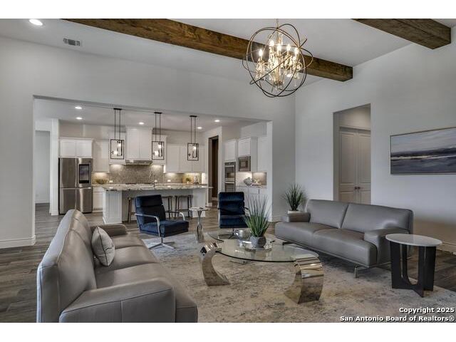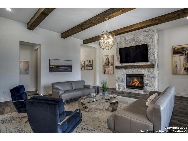 VA Assumable loan 3.1%. Luxury one-story home in the exclusive gated community of Belle Oaks. Set on a one-acre lot, this exquisite residence offers refined living with modern amenities, an open layout, and seamless indoor-outdoor flow. Enjoy a resort-style pool and spa, generous living areas, and an oversized 3-car garage with custom epoxy flooring and stainless-steel cabinetry. Inside, 12-foot ceilings, abundant natural light, and large picture windows create an inviting atmosphere. The beautiful family room centers around a floor-to-ceiling stone fireplace and opens to a spacious dining area and chef's kitchen, complete with a large granite island, ample cabinet storage, upgraded lighting, Monogram gas cooktop and dishwasher, double ovens, microwave, French door smart refrigerator, upgraded pantry, and a butler's pantry with a wine refrigerator and plumbing for a sink. Throughout the home, you'll find stylish wood-look tile flooring in the main living areas and warm engineered wood in the bedrooms. The home features 4 bedrooms and 4.5 baths, including a primary suite with a spa-like bath, his-and-her vanities, walk-in shower, stand-alone tub, and a gorgeous walk-in closet. A large secondary ensuite and the remaining bedrooms each include private baths and walk-in closets. Additional spaces include a dedicated office with glass French doors, media room, and a game room with half bath and outdoor access. Outdoor living is exceptional, with a large sundeck, built-in grill and refrigerator, and a sparkling pool and spa-perfect for entertaining or relaxing. Belle Oaks provides resort-style amenities including a pool, clubhouse, sports courts, playground, and nature trails.