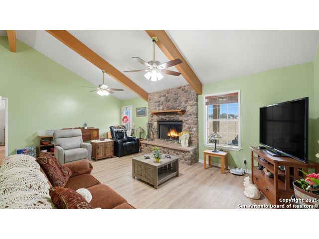 Welcome to 142 Chaparral Drive in Floresville, Texas. Built in 2005 by Real People Homes, this beautiful property sits on five spacious acres and offers a comfortable three bedroom, two bath layout with scratch resistant, water-resistant flooring throughout the home, installed in 2024 designed for durability and easy country living. As you enter, you're greeted by an inviting open floor plan where the living room, dining area, and kitchen flow seamlessly together. The living room features a charming fireplace accented with River Rock stone, adding warmth and character to the space. The laundry area is conveniently located just off the kitchen. The primary suite is privately situated on the left side of the home and includes its own secondary thermostat and AC unit, allowing you to set the temperature to your personal comfort. The suite features high ceilings, a walk-in closet, and an attached bathroom with a stand up shower. On the opposite side of the home are two additional bedrooms, along with a full bathroom located in the hallway, plus a convenient coat closet. The kitchen and dining area offer an open concept design ideal for gatherings. Towards the back of the home, a screened in porch provides the perfect spot to enjoy the fall and winter breeze while relaxing with your morning coffee and taking in the peaceful surroundings. Step outside to the backyard and you'll find a slab-foundation patio with a covered carport perfect for barbecues and outdoor entertainment. The home features stucco exterior, a durable metal roof, concrete sidewalk surrounding the property, Rain gutters, and two AC units. This property also includes multiple outbuildings: A 40' x 24' metal workshop with a remote-controlled garage door with electricity and concrete slab An additional 18' x 24' workshop or garage A 10' x 8' carport for extra covered parking 142 Chaparral Drive is the perfect blend of comfort, functionality, and serene country living.