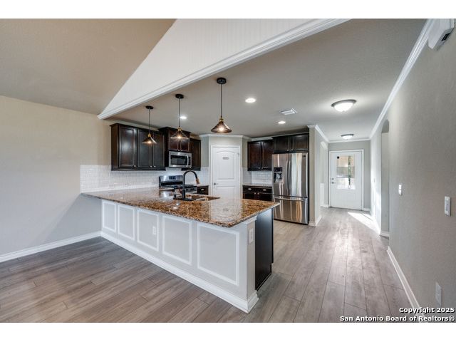 Stunning 4-bedroom, 3-bath, 2,323 sq ft two-story home built in 2018 and located on the South Side of San Antonio with exceptional upgrades throughout! This beautifully maintained property features upgraded laminate flooring, crown molding on the main level, decorative trim, window casings, stairwell trim, dining room chair rail, and elegant custom finishes that truly set it apart. The open-concept kitchen is loaded with upgrades including upgraded tile backsplash, extended cabinetry over the refrigerator, under-cabinet LED lighting, lower cabinet light valance, island pendant lighting, decorative island trim, and an externally vented kitchen exhaust fan. The spacious living and dining areas are perfect for entertaining. Primary suite offers a private retreat with added over-toilet cabinetry. Secondary bathrooms also include upgraded over-toilet storage. Laundry room includes added cabinetry for extra organization. The garage is a dream workspace with insulated garage door, mini-split AC/heat pump, LED lighting, additional electrical outlets, jumper panel, 240-volt plugs, and a 30-amp RV plug. Added walk-in garage door trim enhances the custom feel. Exterior features include a deck extension off the rear patio, smart irrigation controller, and protective screens on golf course-exposed windows for added comfort and efficiency. Energy-efficient construction helps keep utility costs low. Conveniently located near major highways, schools, shopping, dining, and military bases. Priced at $299,000, this home offers rare upgrades, space, and move-in-ready condition. Schedule your private showing today!