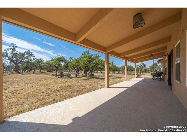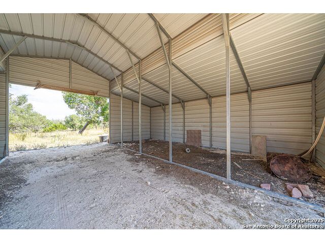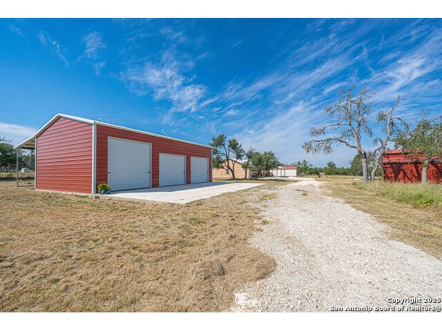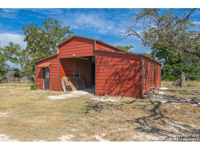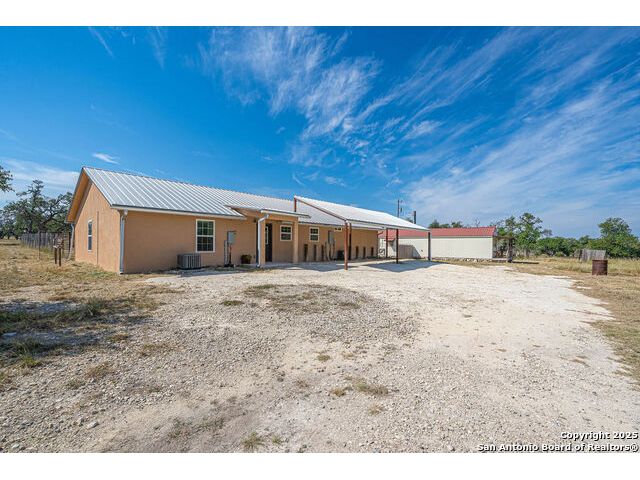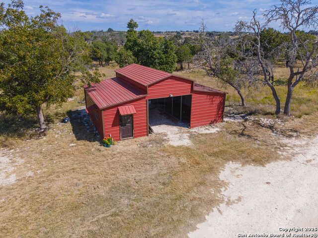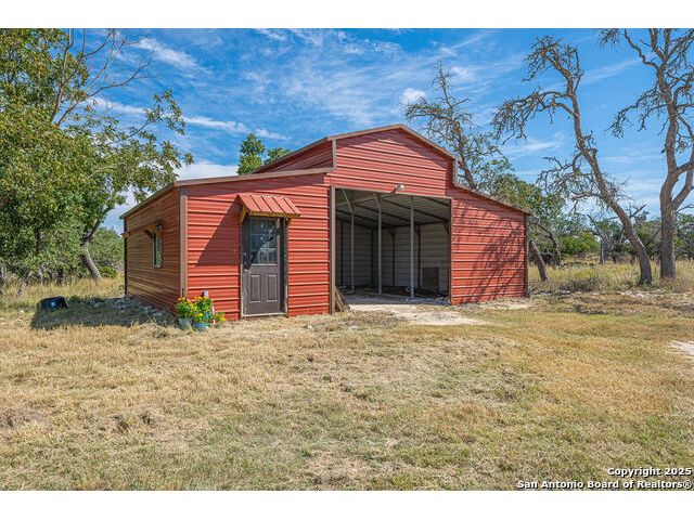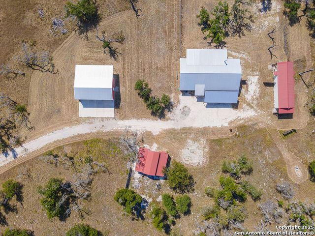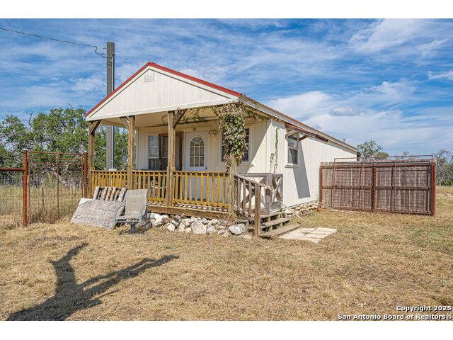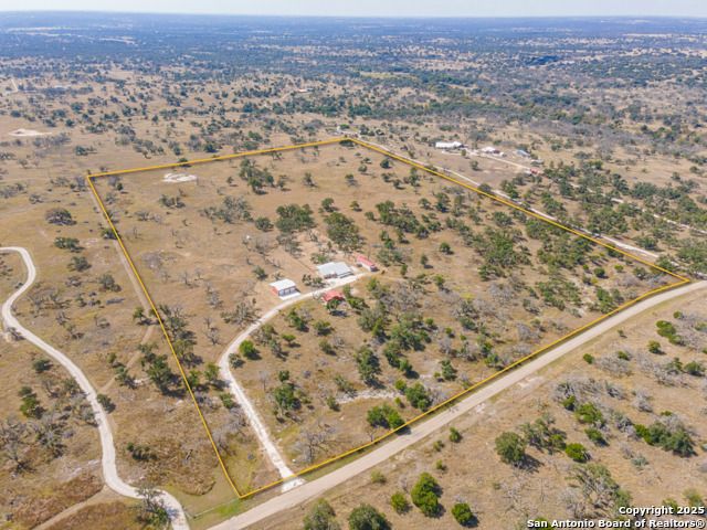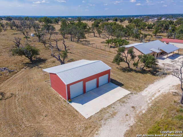 The property at 6415 Old Harper Rd. Fredericksburg, Tx 78624 is a 35.3-acre, ag-exempt Hill Country property featuring four structures. Located approximately 20 minutes from Fredericksburg and 30 miles from Kerrville in Gillespie County, Texas. It is in the Harper ISD school district. The property spans 35.3 acres of gently rolling, tree-studded land with views of the Hill Country. It is agricultural exempt for tax purposes. The property is equipped with a registered well and septic system. It features perimeter fencing, including a mix of peeled cedar ranch fencing with gates and low barbed wire. There are four existing structures on the property: a main home, a cabin, and a modular barn, and a large 3 bay garage with RV covered parking behind the garage. The main house is a newly constructed home completed around 2020, featuring a stucco exterior and metal roof. Size & Rooms: 2,016 square feet with 3 bedrooms and 2.5 bathrooms. The primary bedroom is on the main level. Interior Features: It has an open floor plan, high vaulted ceilings, concrete flooring, a large living area with a wood-burning stone fireplace, and solid wood kitchen cabinets. Comfort: The home features central electric heating and cooling (two HVAC systems), ceiling fans throughout, and large covered front and back porches designed to catch consistent breezes. The primary bath includes a soaking/claw foot tub. There is a half-bath in the mudroom with a utility sink, and the yard is high-fenced. Cabin The separate cabin is climate-controlled and features its own amenities. Size: 704 square feet. Features: It includes a galley kitchen, 1.5 baths, and both front and back porches. It is described as ideal for an office, studio, guest lodging, or B&B. Modular Barn The property also includes a modular barn with a dedicated storage room and open areas suitable for pens.