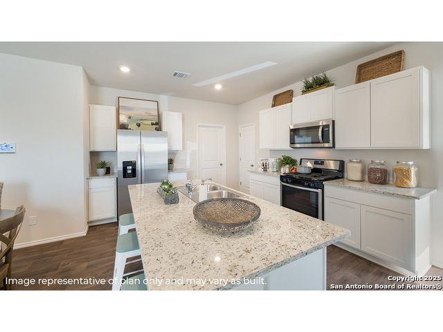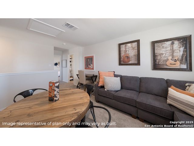 Introducing The Hanna, a two-story home featuring 4 bedrooms, 2.5 baths, and a 2-car garage in Riverstone at Westpointe, a new home community in San Antonio, TX. Here you will find a beautiful open-concept layout with 2042 square feet of functional living space. Your kitchen, dining area and family room blend together seamlessly with plenty of room for everyday living as well as plenty of natural light from the large windows. The gourmet kitchen includes quartz counter tops, stainless steel appliances, shaker style cabinetry and a kitchen island overlooking the living area. The main bedroom suite is downstairs and features quality carpet flooring and an attached bathroom complete with separate water closet, quartz vanity counter top, tiled walk-in shower and a large walk-in closet. The second story includes a full bathroom, a game room, and all secondary bedrooms. Whether these rooms become bedrooms or other bonus spaces, there is sure to be comfort. Additional features of The Hanna floor plan include sheet vinyl flooring in entry, living room, and all wet areas, quartz bathroom counter tops throughout the home, and rear covered patio (per plan) over looking full yard landscaping and irrigation. This home includes our HOME IS CONNECTED base package. Using one central hub that talks to all the devices in your home, you can control the lights, thermostat and locks, all from your cellular device.