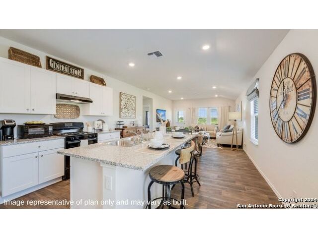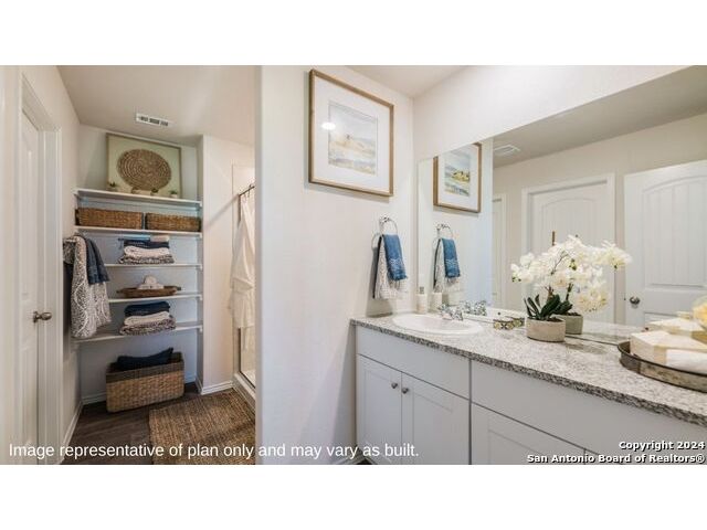 Introducing The Caroline plan, a stunning one-story home featured in Riverstone at Westpointe in San Antonio, TX. The Caroline is sure to impress with its classic front exteriors, 3 bedrooms, 2 baths, and 2-car garage. An elongated foyer welcomes you into an open concept kitchen, dining area, and living room, perfect for entertaining. This home's kitchen includes shaker style cabinetry, quartz counter tops, stainless steel appliances and a spacious kitchen island with a deep farmhouse style single basin sink. The main bedroom is located right off the living room and features a semi-vaulted ceiling and an attractive ensuite bathroom. You'll enjoy getting ready every day with plenty of bathroom space and modern bathroom features including quartz countertops, shaker style cabinets, a tiled walk-in shower and spacious walk-in closet. If privacy is your top priority, this ensuite bathroom comes standard with a separate water closet. Every bedroom has quality carpet, a closet, and windows for plenty of natural lighting. Whether these rooms become bedrooms or other bonus spaces, there is sure to be comfort and functionality. Additional features include a back patio that overlooks a fully landscaped and irrigated yard, sheet vinyl flooring in entry, living room, and all wet areas, and quartz countertops and tiled flooring in all secondary bathrooms. This home also comes equipped with our HOME IS CONNECTED base package. Using one central hub that talks to all the devices in your home, you can control the lights, thermostat and locks, all from your cellular device.