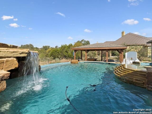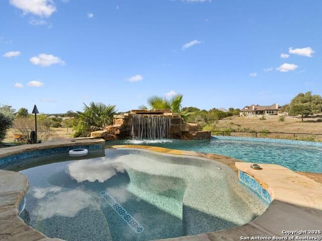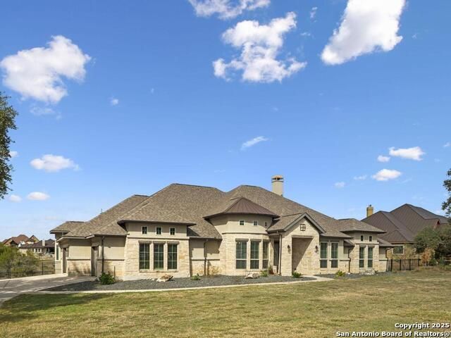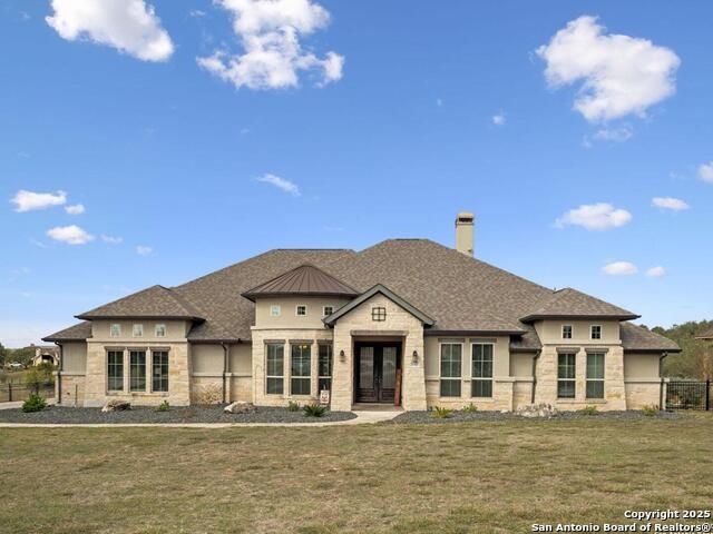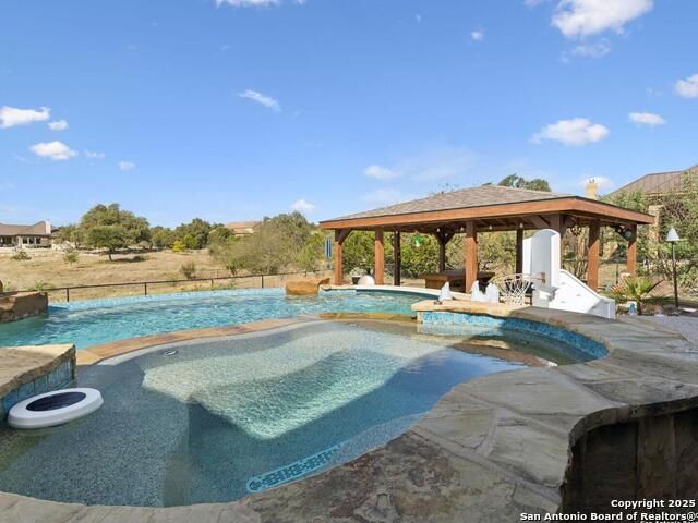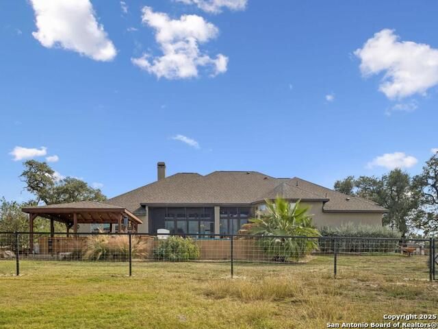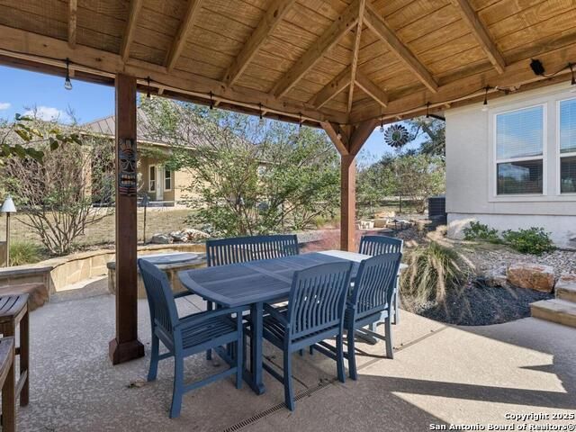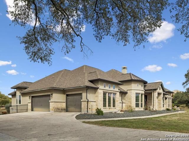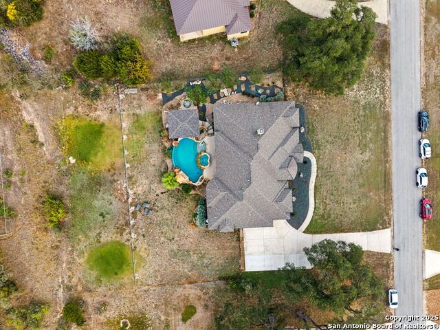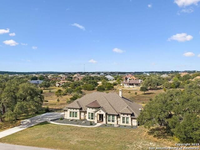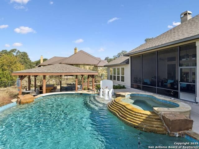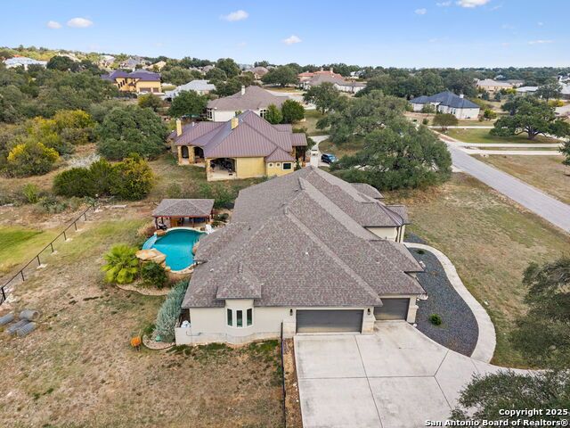 Experience exceptional Hill Country living in this spacious single-story home offering 3,494 sq. ft., 4 bedrooms, and 3.5 bathrooms. Designed with comfort, style, and functionality in mind, this property delivers an ideal blend of modern amenities and serene surroundings. Step inside to an inviting open floor plan featuring a cozy living-room fireplace, recessed lighting, and seamless flow between the main living areas. The island kitchen is a chef's dream, complete with gas cooking, double ovens, granite counters, a walk-in pantry, and energy-efficient appliances and windows. A dedicated game room provides the perfect space for entertainment, while the private office supports productivity and quiet focus. The luxurious primary suite offers a peaceful retreat with a separate garden tub and shower, dual vanities, and ample storage. Enjoy Texas indoor-outdoor living with a custom enclosed patio, ideal for dining or relaxing year-round. Step outside to the resort-style Keith Zars in-ground pool and spa, offering a refreshing escape during warm summer days. Additional conveniences include electric car charging in the attached garage, underground utilities, a smart home system, and a smart thermostat. Located in the desirable Vintage Oaks community, residents enjoy beautifully maintained common areas, stunning hill and wooded views, and the tranquility of the Hill Country-paired with the benefits of a low 1.49 tax rate and fee-simple ownership.