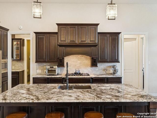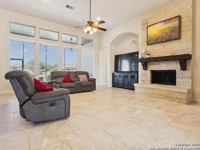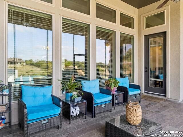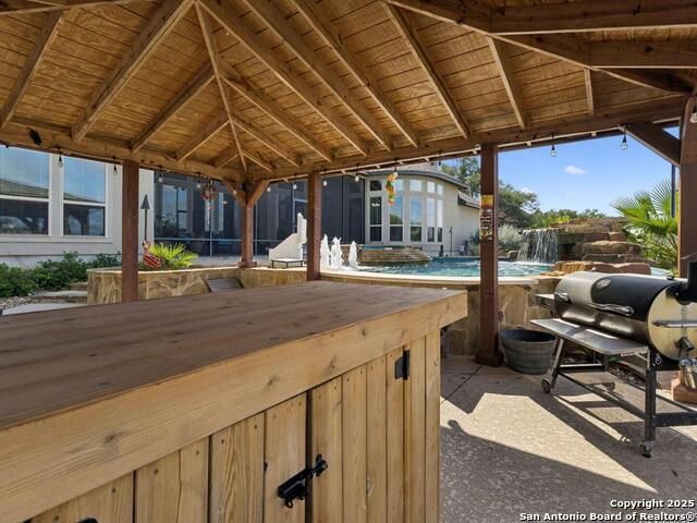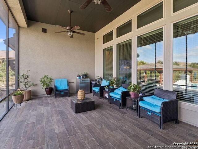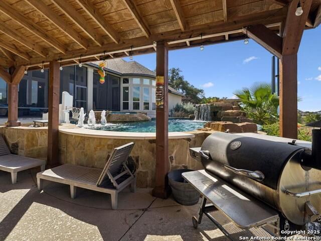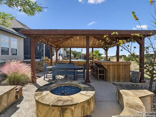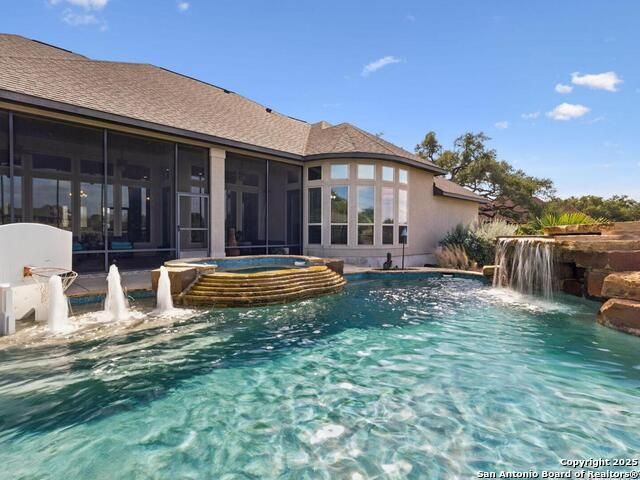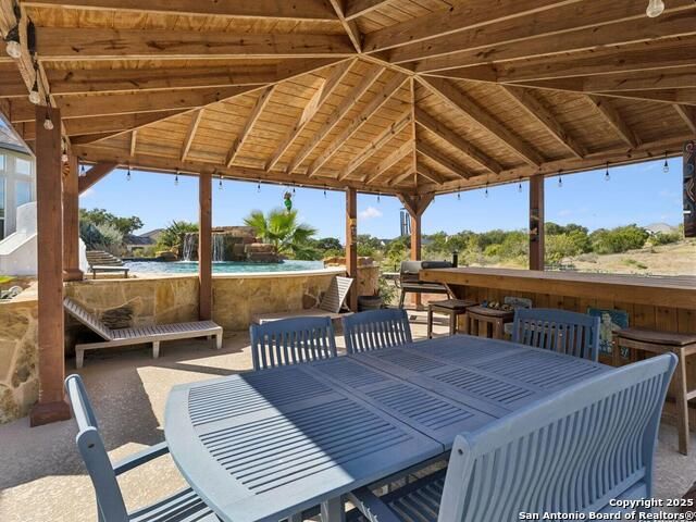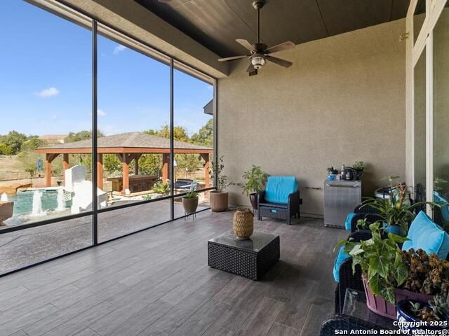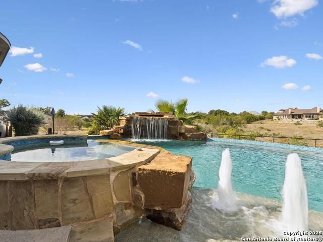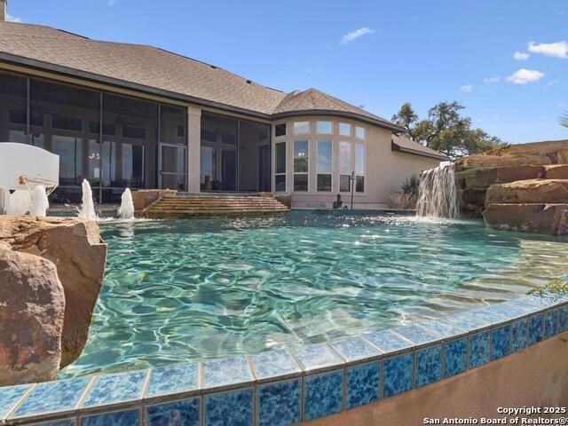 Experience exceptional Hill Country living in this spacious single-story home offering 3,494 sq. ft., 4 bedrooms, and 3.5 bathrooms. Designed with comfort, style, and functionality in mind, this property delivers an ideal blend of modern amenities and serene surroundings. Step inside to an inviting open floor plan featuring a cozy living-room fireplace, recessed lighting, and seamless flow between the main living areas. The island kitchen is a chef's dream, complete with gas cooking, double ovens, granite counters, a walk-in pantry, and energy-efficient appliances and windows. A dedicated game room provides the perfect space for entertainment, while the private office supports productivity and quiet focus. The luxurious primary suite offers a peaceful retreat with a separate garden tub and shower, dual vanities, and ample storage. Enjoy Texas indoor-outdoor living with a custom enclosed patio, ideal for dining or relaxing year-round. Step outside to the resort-style Keith Zars in-ground pool and spa, offering a refreshing escape during warm summer days. Additional conveniences include electric car charging in the attached garage, underground utilities, a smart home system, and a smart thermostat. Located in the desirable Vintage Oaks community, residents enjoy beautifully maintained common areas, stunning hill and wooded views, and the tranquility of the Hill Country-paired with the benefits of a low 1.49 tax rate and fee-simple ownership.