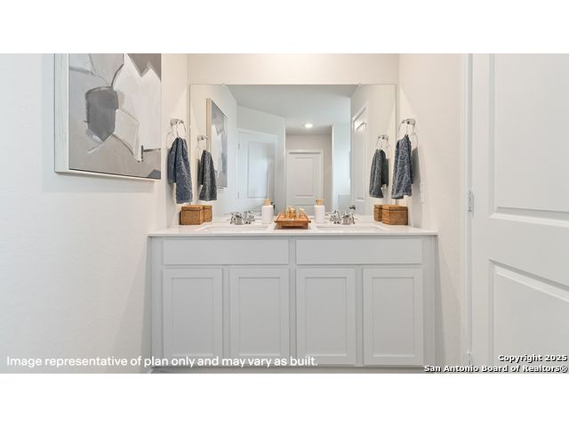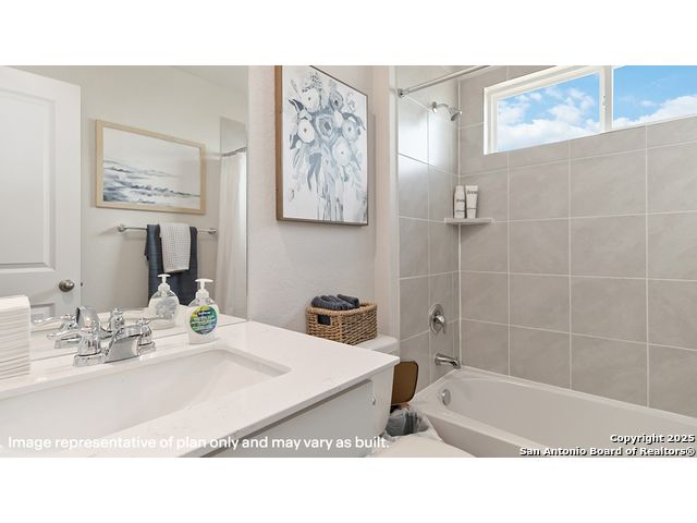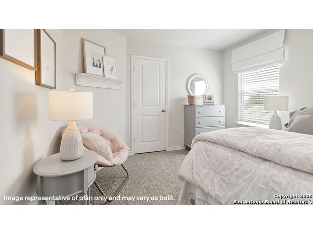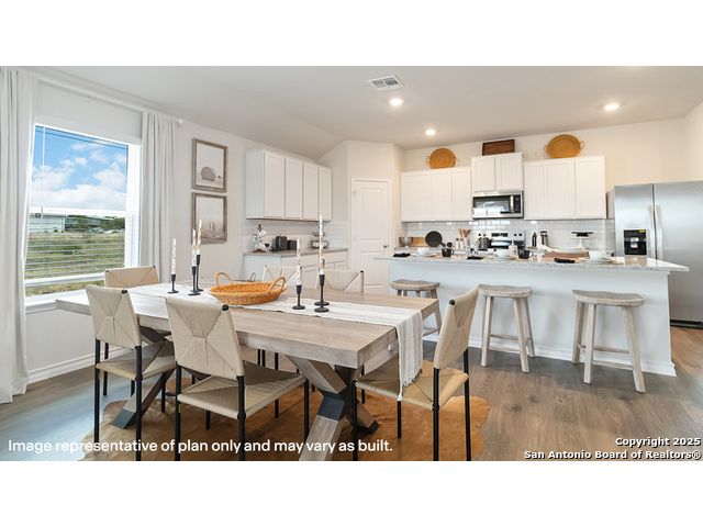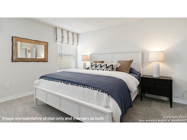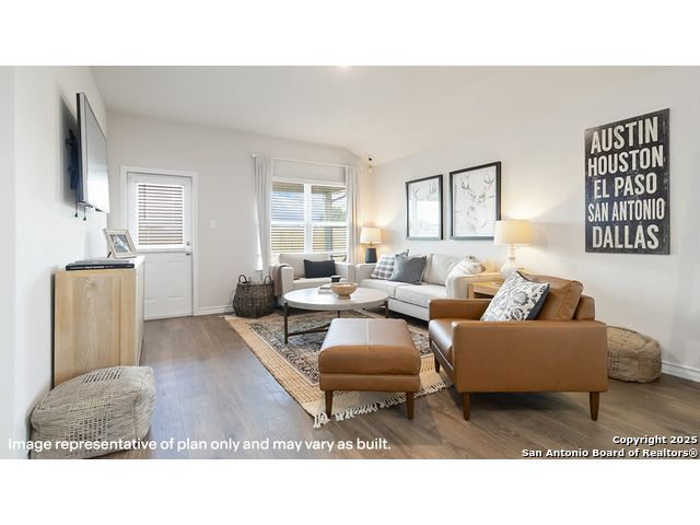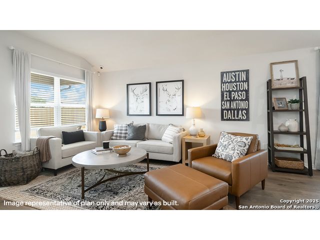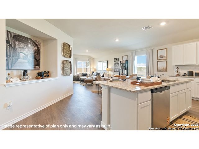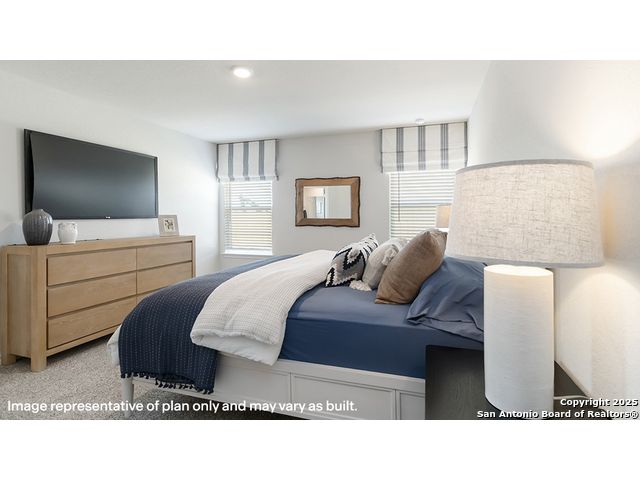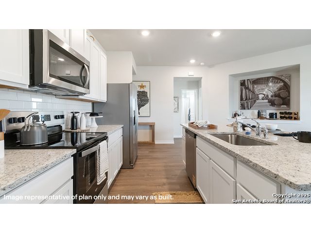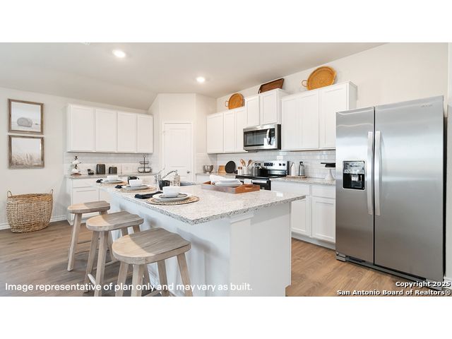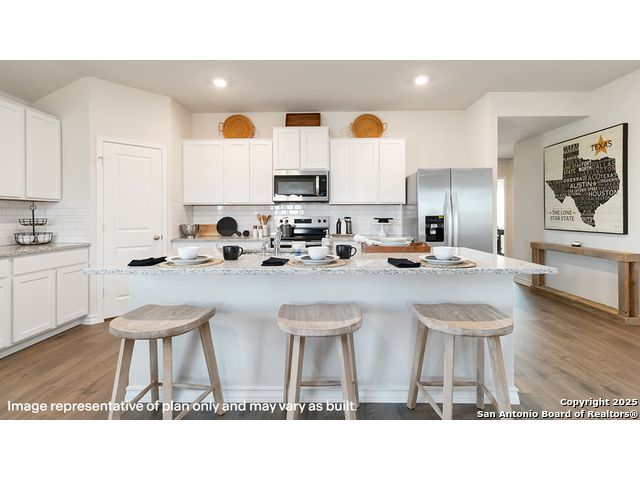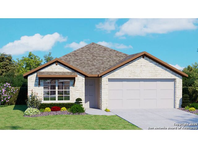 The Bryant is a stunning single-story home featured at Riverstone at Westpointe in San Antonio, TX. The Bryant is sure to impress with its selection of 3 front exteriors, 4 bedrooms, 2 bathrooms and 2-car garage. Welcome guests as they walk through the elongated foyer with a decorative nook wall feature to the spacious eat-in kitchen. Facing the blended dining area and living room, the kitchen includes an oversized island, corner pantry with shelving, plenty of cabinet storage, quartz countertops, stylish subway tile backsplash, stainless steel appliances, and a gas cooking range. The private main bedroom is located at the back of the house and features a relaxing ensuite bathroom complete with double vanities, a garden tub, walk-in shower, and a spacious walk-in closet. If privacy is your top priority, this bathroom comes standard with a separate water closet. Two secondary bedrooms are located off the entry and the other is centrally located off the kitchen. All have quality carpet, spacious closets and windows for plenty of natural lighting. Whether these rooms become bedrooms or other bonus spaces, there is sure to be comfort and functionality. Additional features include tall 9-foot ceilings, 2-inch faux wood blinds throughout the home, luxury vinyl plank flooring in the entry, family room, kitchen, and dining area, ceramic tile in the bathrooms and utility room, and pre-plumb for water softener loop. Relax outside on a covered patio (per plan) located off the family room and enjoy full yard landscaping and full yard irrigation. You'll enjoy added security in your new home with our Home is Connected features. Using one central hub that talks to all the devices in your home, you can control the lights, thermostat and locks, all from your cellular device.