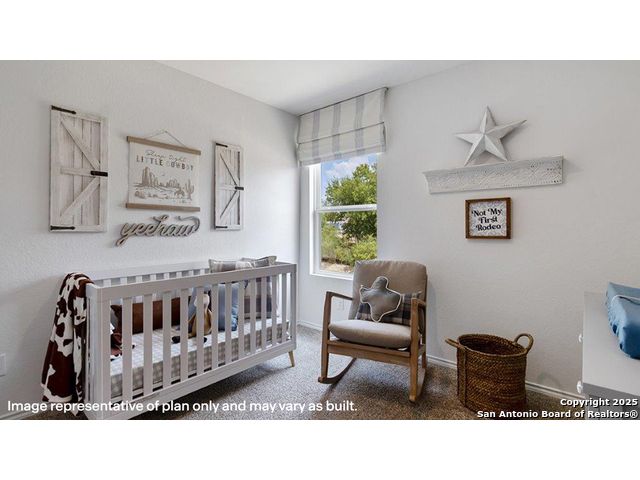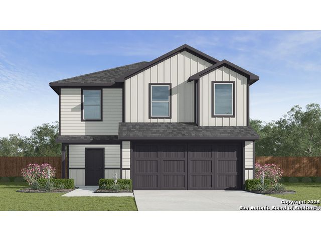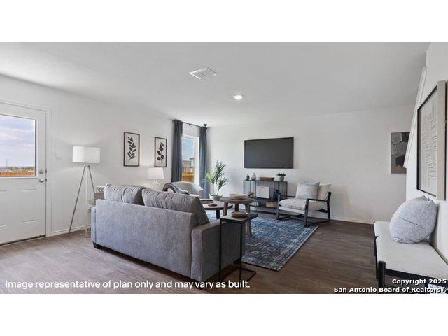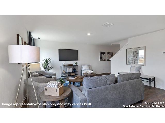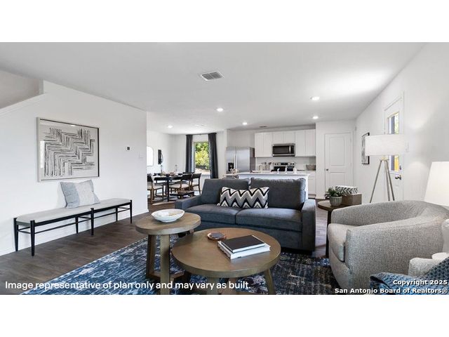 The Franklin plan is one of our two-story homes featured in Riverstone at Westpointe in San Antonio, TX. This new home layout offers 2 classic front exteriors, 5 bedrooms, 2.5 baths, 2 car-garage and 1891 square feet of comfortable living. Step inside The Franklin to find an elongated foyer opening to an open concept living room, kitchen, and dining area. The gourmet kitchen faces the living area so you don't miss a thing while cooking and includes quartz counter tops, stainless steel appliances and shaker style cabinetry. The main bedroom is located toward the front of the home on the second story and features an attractive attached bathroom with a walk-in shower, quartz countertops, a grand walk-in closet and plenty of storage space. The second story includes all secondary bedrooms, and two full bathrooms. You'll have carpeted floors in every bedroom and sheet vinyl flooring in your bathrooms and utility room. Additional features include sheet vinyl flooring in entry, living room, and all wet areas, quartz counter tops in all bathrooms and HOME IS CONNECTED base package. Using one central hub that talks to all the devices in your home, you can control the lights, thermostat and locks, all from your cellular device.