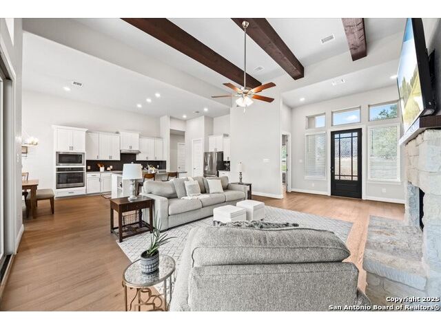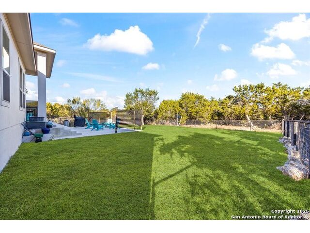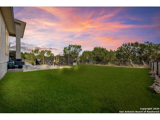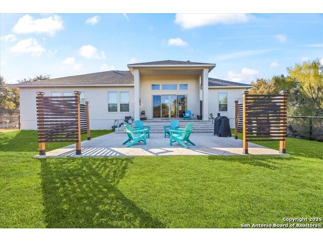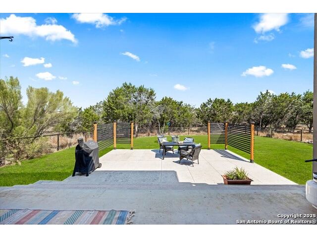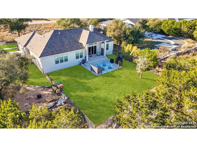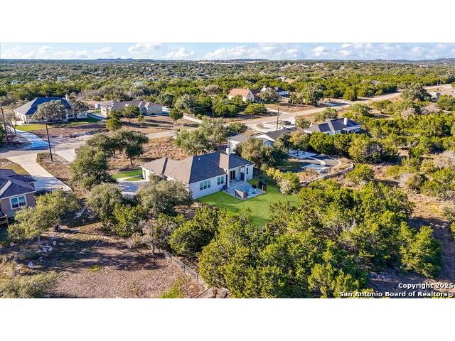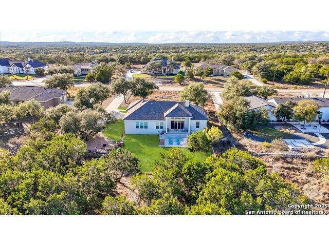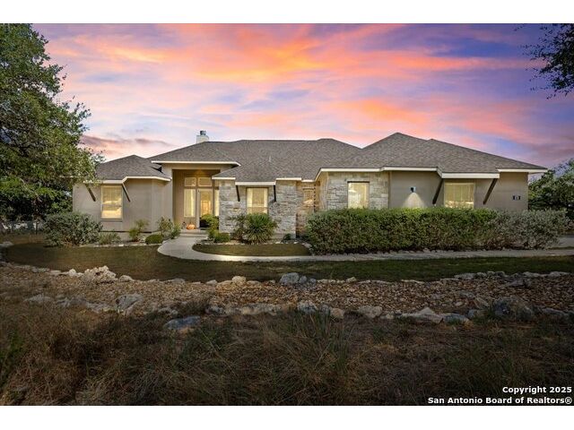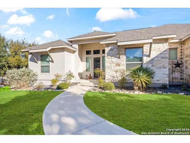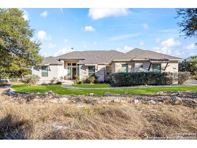 Built in 2020 by Journey Homes, this one-story property offers both comfort and practicality on a true one-acre lot in Mystic Shores. Recently enhanced, the entire exterior has been freshly painted making it even more contemporary and pleasant, and all stucco surfaces have been professionally sealed-providing exceptional durability and peace of mind for the new owner. The home features three spacious bedrooms and two and a half bathrooms, offering convenience and privacy for everyone. Inside, high-quality contemporary wood floors run throughout, with no carpet at all. The family room is highlighted by wood beam accents, a fireplace ideal for cool days, and large-format windows that frame views of the oversized covered patio, creating a seamless connection between indoor and outdoor living. A dedicated office or studio offers the perfect space for work, study, or creative projects, while 14-foot ceilings enhance the sense of openness in the main living areas. The lot is fully usable, allowing space for recreation, gardening, or future plans, and ensures a true one-acre lifestyle. Residents of Mystic Shores enjoy a variety of community amenities including multiple pools, sport courts, playgrounds, a clubhouse, and more. The neighborhood blends Hill Country beauty with modern convenience, located just minutes from Highway 281 along FM 306. From here, commuting to San Antonio, New Braunfels, and even Austin is simple, making it an ideal location for both work and leisure. This home combines modern construction with thoughtful enhancements, offering both practicality and flexibility in one of the most desirable communities in the area.