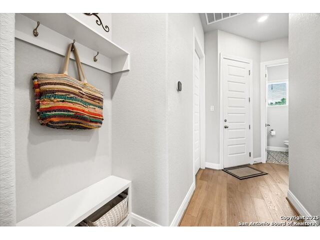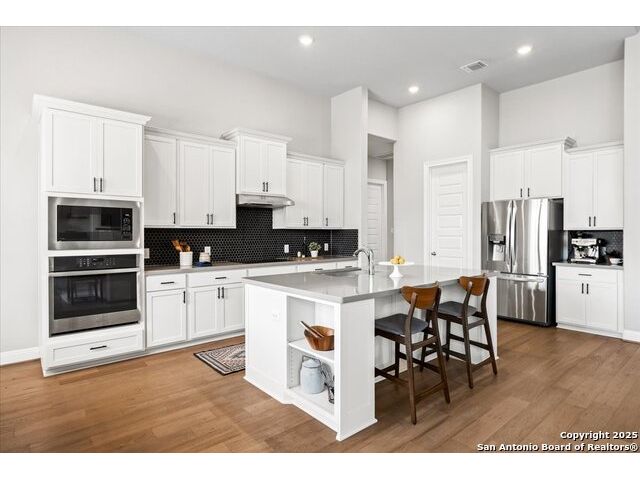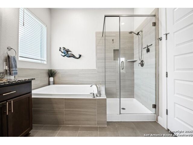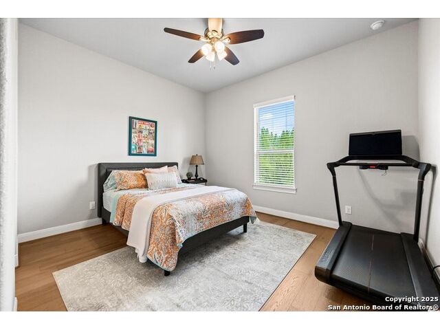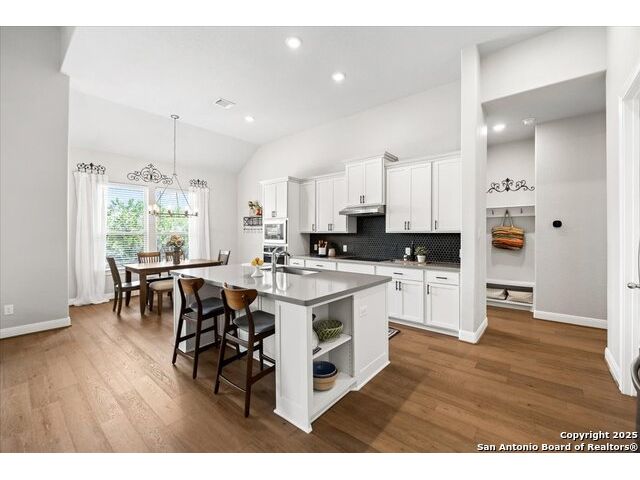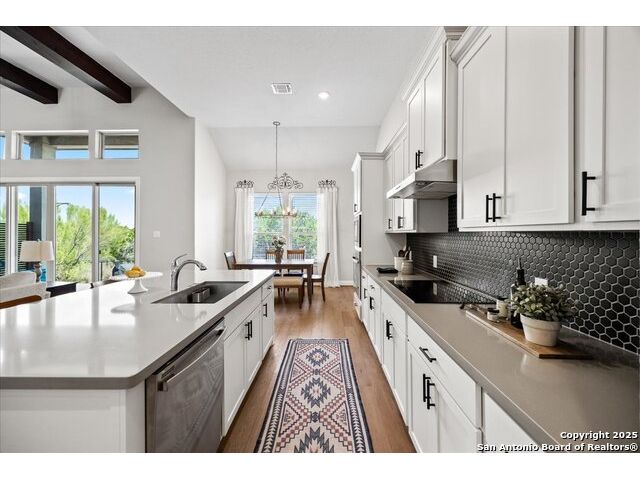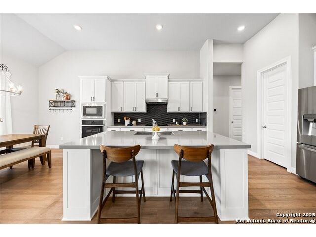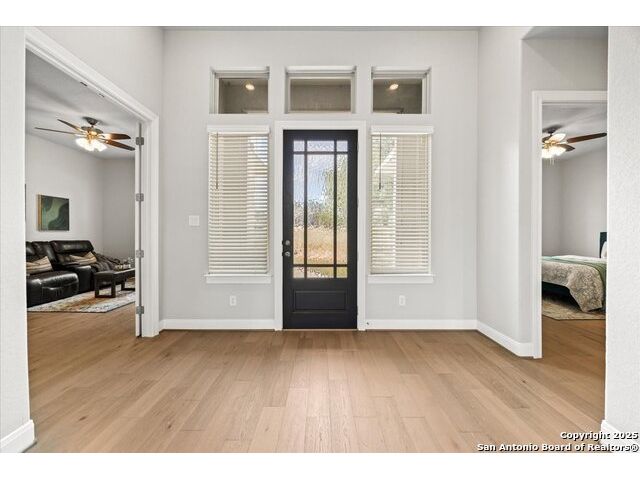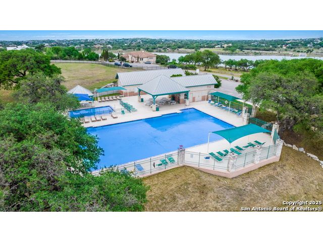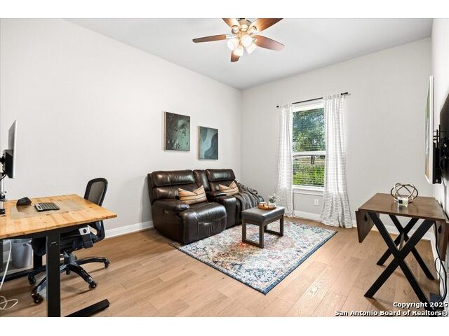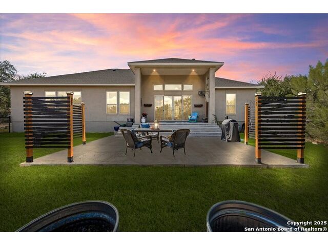 Built in 2020 by Journey Homes, this one-story property offers both comfort and practicality on a true one-acre lot in Mystic Shores. Recently enhanced, the entire exterior has been freshly painted making it even more contemporary and pleasant, and all stucco surfaces have been professionally sealed-providing exceptional durability and peace of mind for the new owner. The home features three spacious bedrooms and two and a half bathrooms, offering convenience and privacy for everyone. Inside, high-quality contemporary wood floors run throughout, with no carpet at all. The family room is highlighted by wood beam accents, a fireplace ideal for cool days, and large-format windows that frame views of the oversized covered patio, creating a seamless connection between indoor and outdoor living. A dedicated office or studio offers the perfect space for work, study, or creative projects, while 14-foot ceilings enhance the sense of openness in the main living areas. The lot is fully usable, allowing space for recreation, gardening, or future plans, and ensures a true one-acre lifestyle. Residents of Mystic Shores enjoy a variety of community amenities including multiple pools, sport courts, playgrounds, a clubhouse, and more. The neighborhood blends Hill Country beauty with modern convenience, located just minutes from Highway 281 along FM 306. From here, commuting to San Antonio, New Braunfels, and even Austin is simple, making it an ideal location for both work and leisure. This home combines modern construction with thoughtful enhancements, offering both practicality and flexibility in one of the most desirable communities in the area.
