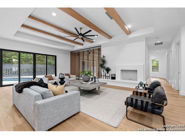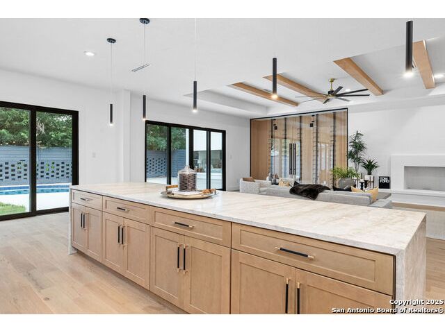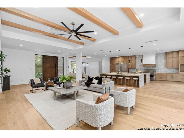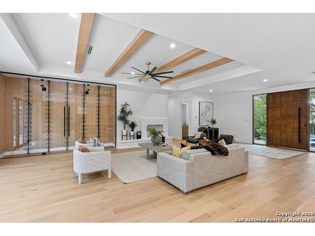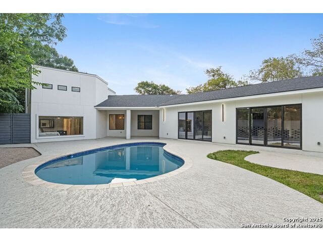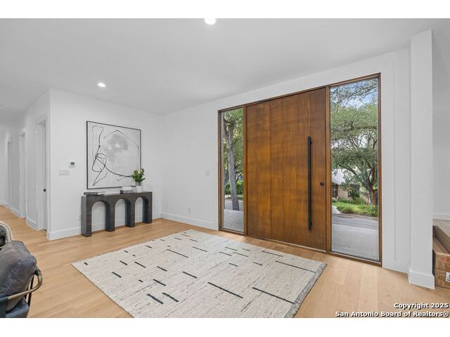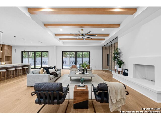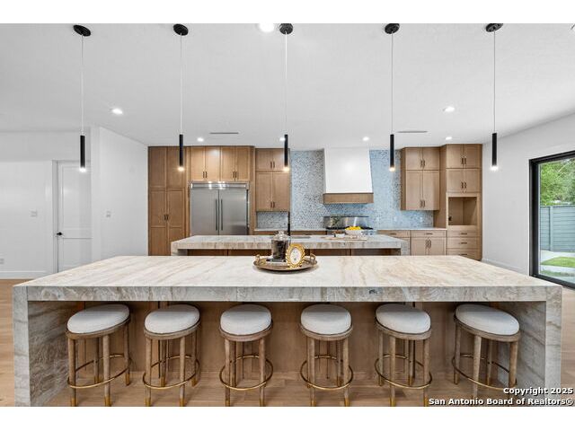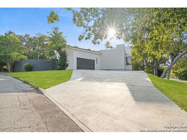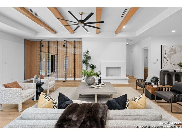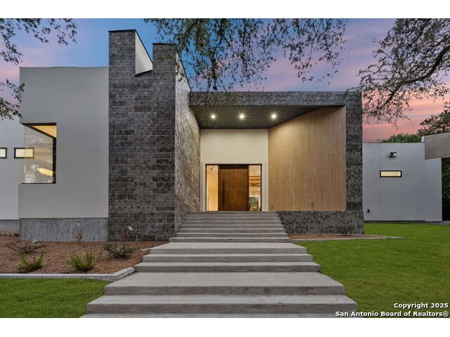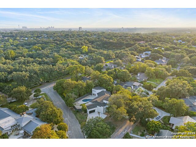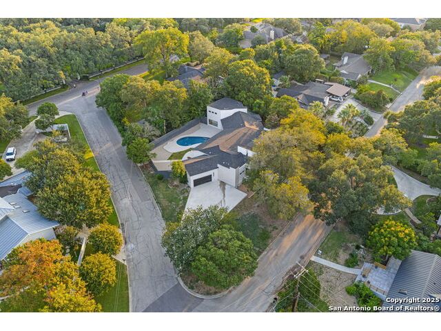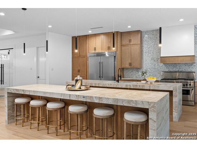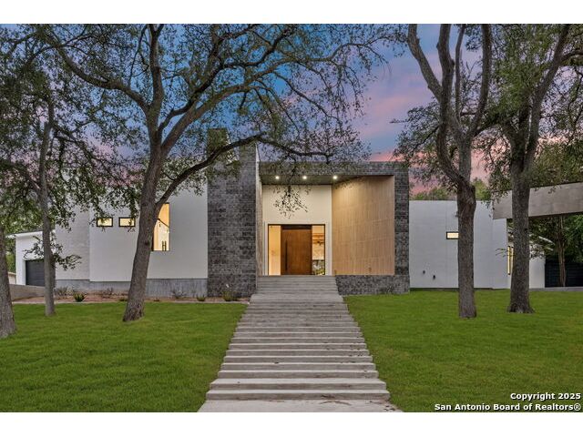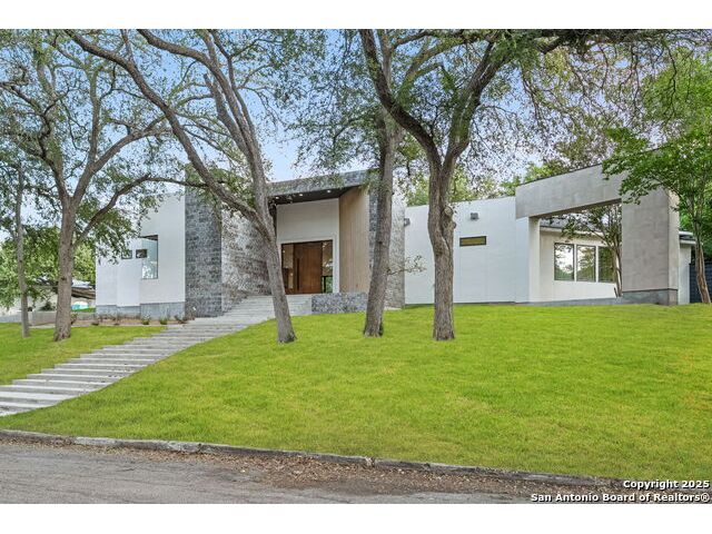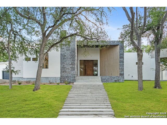 Introducing a residence where modern artistry and everyday luxury converge. 718 Ridgemont rises from its elevated lot with an unforgettable architectural presence-a bold, sculpted facade of stone, wood, and glass framed by mature trees and a dramatic entry staircase. This is modern design at its most refined. Step inside to a world of clean lines and curated textures. Wide-plank white oak floors flow through expansive living spaces bathed in natural light. An open-concept great room anchors the home, enhanced by architectural ceiling beams, a sleek fireplace, and an exquisite glass-front wine installation that serves as both art and entertainer's dream. The chef's kitchen is a showpiece unto itself-double sided waterfall islands, designer pendant lighting, custom cabinetry, commercial-grade appliances, an oversized built-in refrigerator, AND walk in pantry. Whether hosting intimate dinners or large gatherings, the seamless connection to the dining room, office, and backyard creates unmatched flow. Just off the dining room, the glass-enclosed office offers a dramatic work-from-home environment with views of the front grounds. The thoughtfully designed floorplan places three bedrooms on the main level, including the primary suite-an airy retreat with a full glass wall overlooking the pool and backyard. The spa bath brings resort living home with a freestanding soaking tub, an oversized shower with gold fixtures, dual vanities, and a boutique-style dressing room featuring custom built-ins and a chandelier centerpiece. Upstairs, a private bedroom suite + loft offers limitless flexibility-ideal for multigenerational living, an artist studio, game room, gym, or secondary living area. In the backyard, clean contemporary lines frame a sparkling pool surrounded by a wrap-around patio, lounge areas, and total privacy-turning the outdoor space into a true modern oasis. Perfectly located in prestigious Terrell Hills, this nearly new residence embodies luxury craftsmanship, forward-thinking design, and a lifestyle of elevated simplicity.