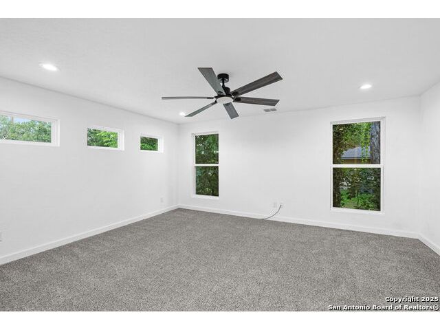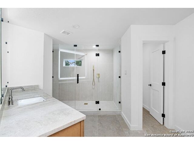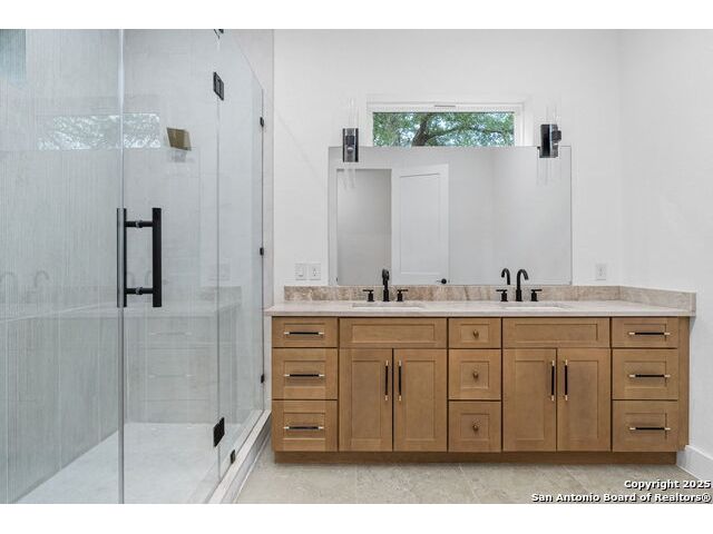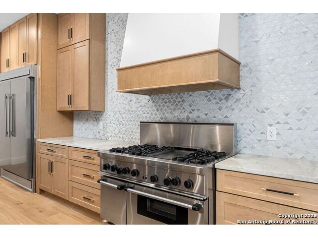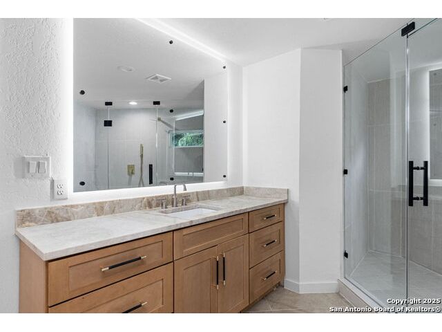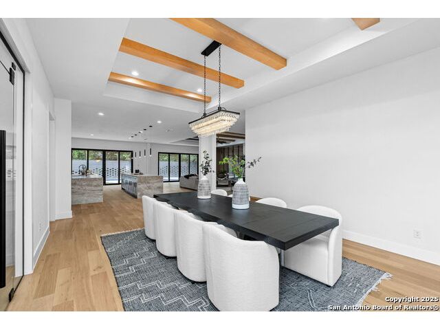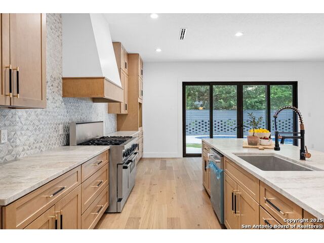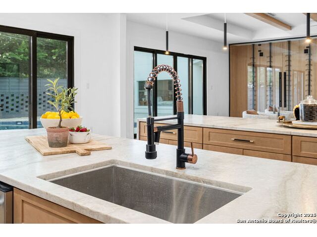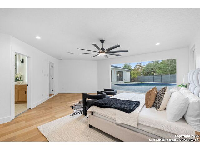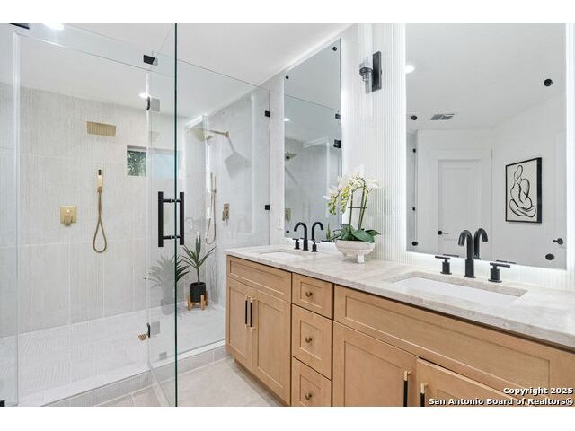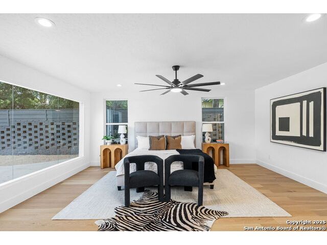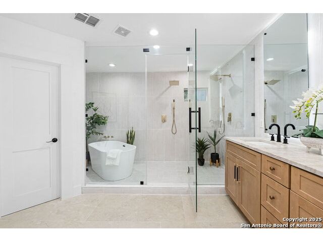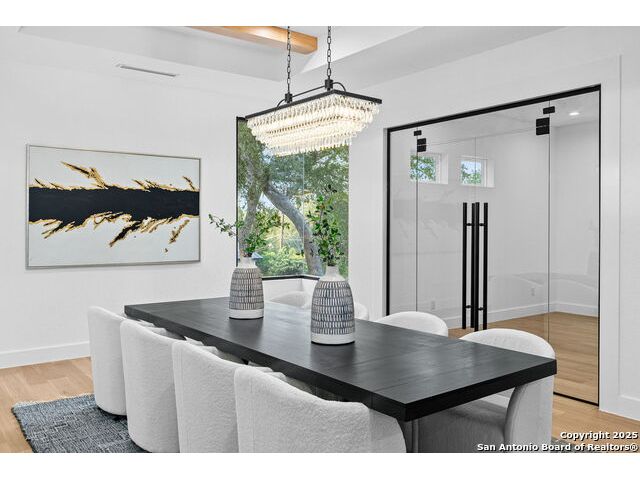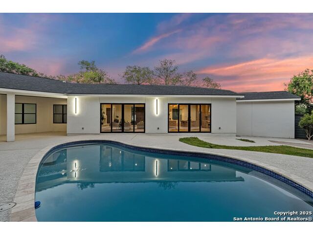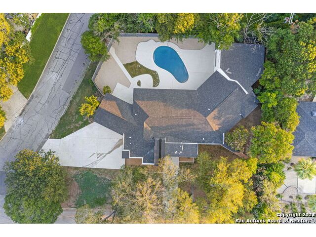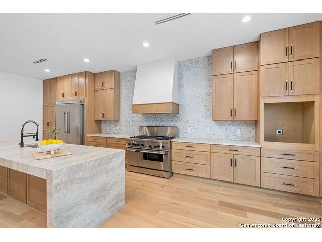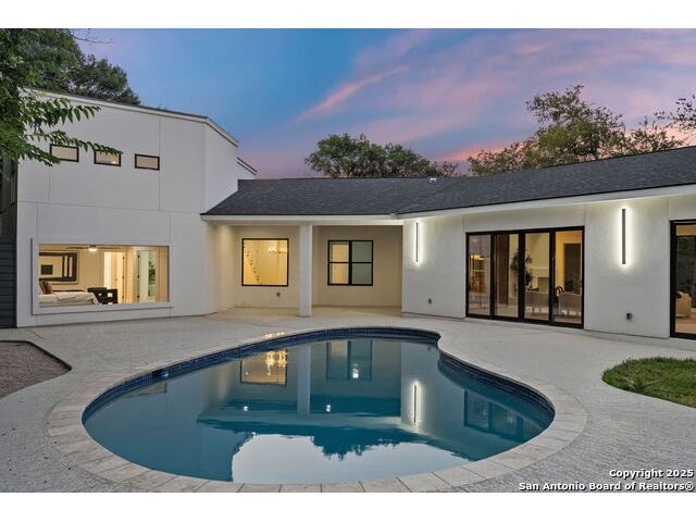 Introducing a residence where modern artistry and everyday luxury converge. 718 Ridgemont rises from its elevated lot with an unforgettable architectural presence-a bold, sculpted facade of stone, wood, and glass framed by mature trees and a dramatic entry staircase. This is modern design at its most refined. Step inside to a world of clean lines and curated textures. Wide-plank white oak floors flow through expansive living spaces bathed in natural light. An open-concept great room anchors the home, enhanced by architectural ceiling beams, a sleek fireplace, and an exquisite glass-front wine installation that serves as both art and entertainer's dream. The chef's kitchen is a showpiece unto itself-double sided waterfall islands, designer pendant lighting, custom cabinetry, commercial-grade appliances, an oversized built-in refrigerator, AND walk in pantry. Whether hosting intimate dinners or large gatherings, the seamless connection to the dining room, office, and backyard creates unmatched flow. Just off the dining room, the glass-enclosed office offers a dramatic work-from-home environment with views of the front grounds. The thoughtfully designed floorplan places three bedrooms on the main level, including the primary suite-an airy retreat with a full glass wall overlooking the pool and backyard. The spa bath brings resort living home with a freestanding soaking tub, an oversized shower with gold fixtures, dual vanities, and a boutique-style dressing room featuring custom built-ins and a chandelier centerpiece. Upstairs, a private bedroom suite + loft offers limitless flexibility-ideal for multigenerational living, an artist studio, game room, gym, or secondary living area. In the backyard, clean contemporary lines frame a sparkling pool surrounded by a wrap-around patio, lounge areas, and total privacy-turning the outdoor space into a true modern oasis. Perfectly located in prestigious Terrell Hills, this nearly new residence embodies luxury craftsmanship, forward-thinking design, and a lifestyle of elevated simplicity.