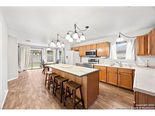 Welcome to this beautifully maintained single-story home featuring an open floorplan and wood-like tile flooring throughout. The spacious kitchen is a chef's dream, offering abundant cabinet and counter space, plus an added island with additional seating for family and guests. Meticulous owners have ensured peace of mind for the new buyers, with a 3-year-old HVAC system and water heater with Ionizer to breakaway lime in water, as well as a 2-year-old air-fryer stove and microwave. Recently, roof was replaced and along all siding and windows with a transferable warranty. Additional highlights include a quiet garage door opener, a Ring doorbell and Ring floodlight cameras. The outdoor spaces offer mature trees in both the front and backyard, a large concrete slab perfect for entertaining, and a generous storage shed. This home combines modern conveniences with thoughtful updates, making it move-in ready and perfect for comfortable living.