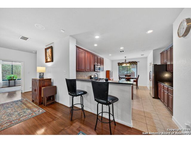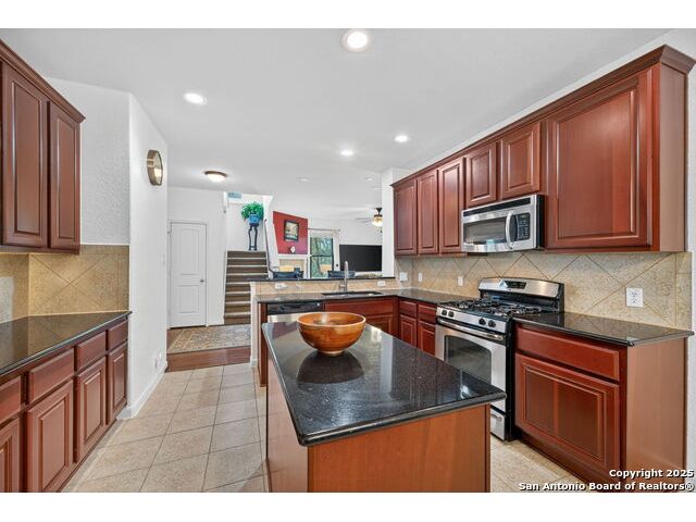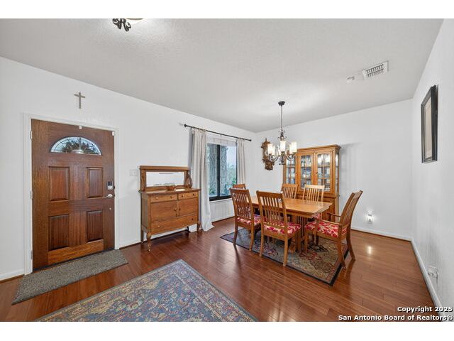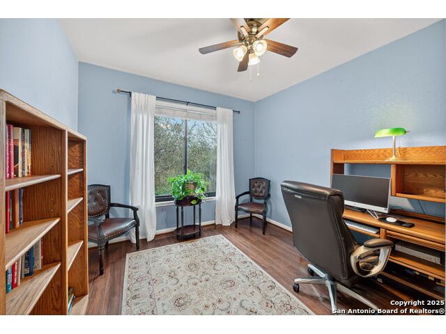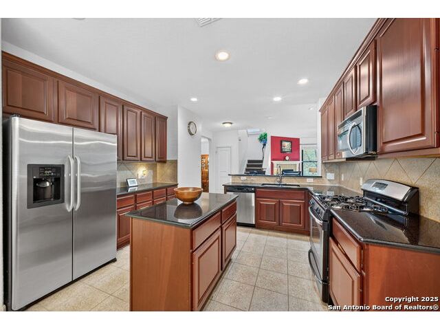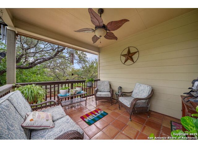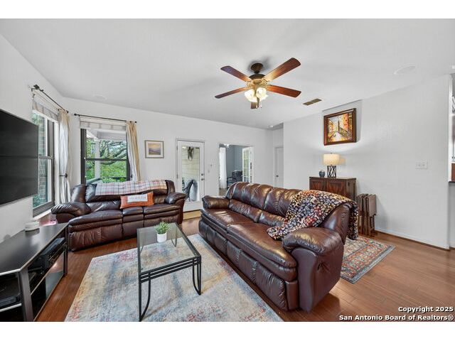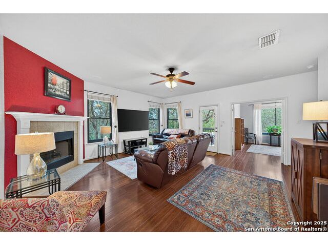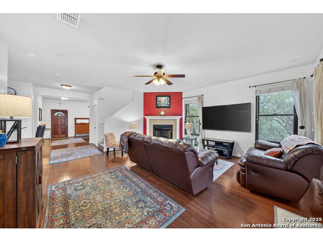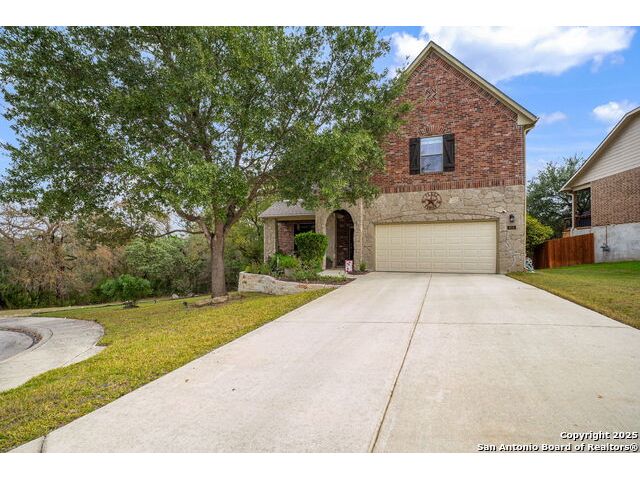 Welcome to 614 Colossus Way, a stunning 4-bedroom 2.5-bath home tucked away on a private cul-de-sac lot that backs to a serene greenbelt. From the moment you arrive, you'll feel the peaceful atmosphere as you step onto the inviting covered front porch. Inside, the bright open floor plan is filled with natural light and features rich wood flooring throughout. A formal dining room sits to your left, creating the perfect space for gatherings and holiday meals. The spacious living area offers a cozy fireplace and large windows that frame sweeping views of mature trees and the tranquil outdoors. The chef's kitchen blends style and function with gas cooking, granite counters, stainless steel appliances, a center island, breakfast bar, and abundant cabinet and counter space. A private study or flex room at the back of the home provides additional space to work or unwind while enjoying picturesque Hill Country views. The downstairs primary suite showcases peaceful greenbelt views and includes a private ensuite with dual vanities and a separate tub and shower. Upstairs, you'll find three generously sized secondary bedrooms and a large game room ideal for movie nights, hobbies, or indoor fun. Step outside and enjoy one of the home's true highlights. The covered patio opens to a tiered deck that offers plenty of space for entertaining or relaxing. With no neighbors behind you and a lush backdrop of trees, the setting feels like your own private retreat. Neighborhood amenities include a pool, park/playground, and basketball court, giving you even more to love. This home offers comfort, privacy, and a beautiful natural setting all in one. Come see why 614 Colossus Way is the perfect place to settle in and enjoy the San Antonio lifestyle. Schedule your showing today!