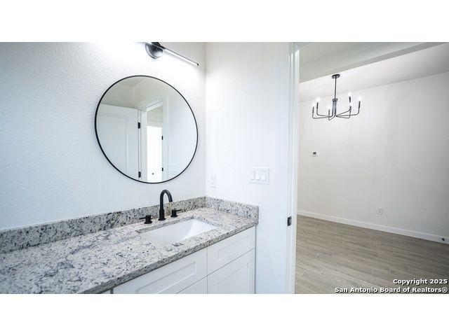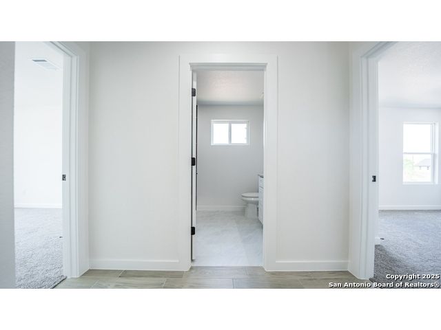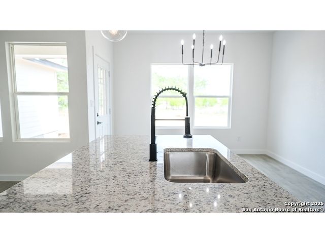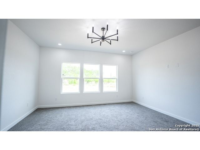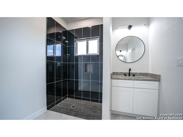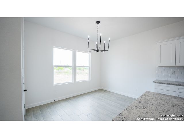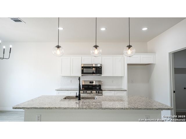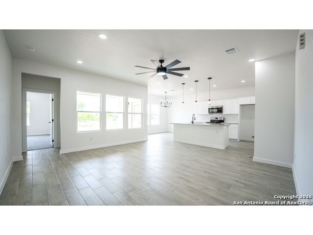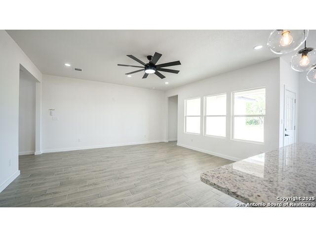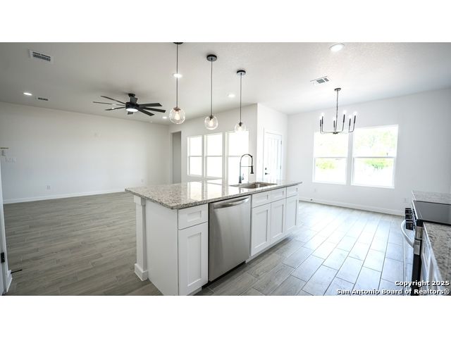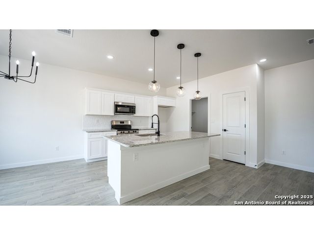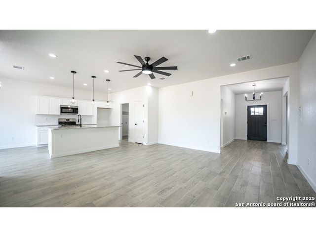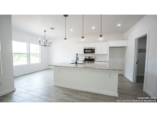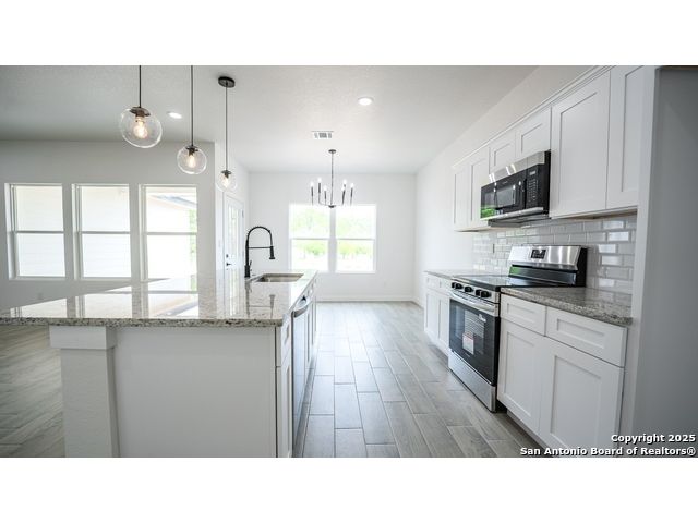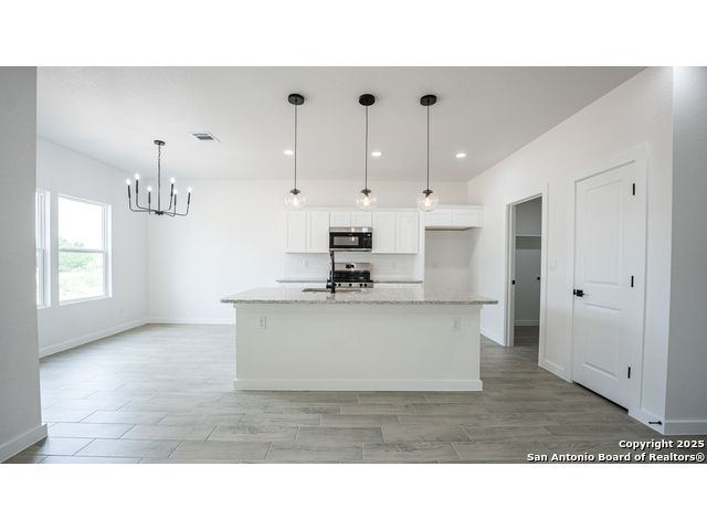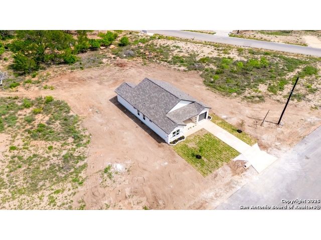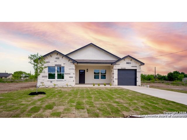Offering ALL CLOSING COSTS PAID!! A brand new, single-story stunner where modern farmhouse meets serene country charm. Perched on a spacious half-acre lot, this 4-bedroom, 2-bath home makes a bold first impression with its white and gray stone exterior, black trim accents, and matching raised garden beds. Accent exterior lighting sets the tone, while the oversized front covered patio with an extended slab creates a warm, inviting entrance. Step inside and feel the openness. You're greeted by a wide entryway and soaring 9-foot ceilings that lead into an airy, light-filled living space. Walls of windows on both sides-one in the dining area and one in the living room-flood the home with natural sunlight. Throughout the home, grey wood-look tile flooring adds durability. The striking kitchen is anchored by a large marble island that doubles as a breakfast bar for three. Sleek black globe pendant lights make an impressive statement above, while white cabinetry, stainless steel Frigidaire appliances, and a clean white tile backsplash tie everything together. A walk-in pantry keeps the space organized and clutter-free. Adjacent to the kitchen, the dining room brings extra flair with a bold black candlelight chandelier. The 17-by-16 living room is the heart of the home, effortlessly blending elegance and comfort. Recessed lighting and a modern black ceiling fan with remote complete the look. Tucked in its own private corner, the primary suite offers a true retreat. A soft glow from recessed lights and a Galea candlelight chandelier sets the mood, while a custom barn door leads into a spa-like bath. Inside, you'll find separate vanities, his and hers closets, and a walk-in shower wrapped in bold black tile with mosaic flooring and a built-in niche. Three additional bedrooms, each generously sized, sit in their own wing of the home. All feature spacious closets and modern farmhouse chandeliers. A shared soaking room offers style and function with a sleek black fixture, oversized vanity, and a tub-shower combo framed by rich black tile. Out back, a large covered patio with recessed lighting offers the perfect spot to relax, entertain, or dream up future backyard plans. With no HOA, 16720 Llano Estacado blends thoughtful design, modern finishes, and country tranquility-all in one move-in-ready package.