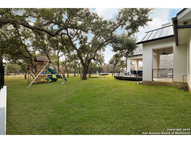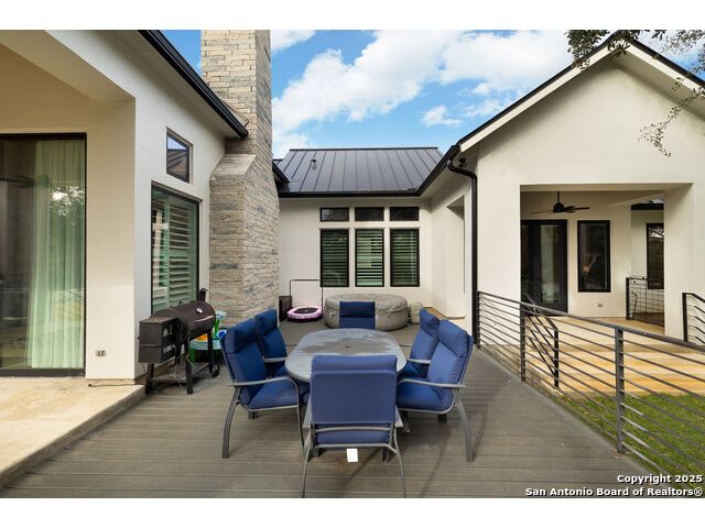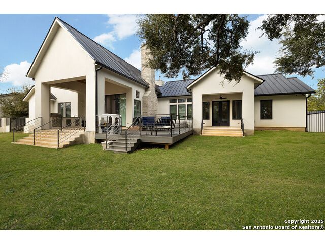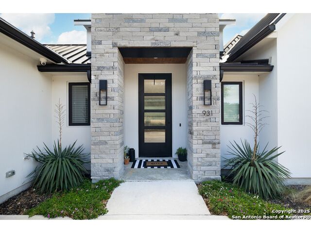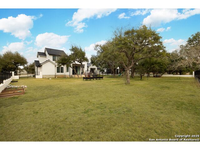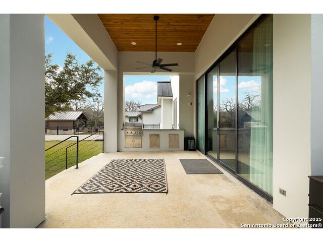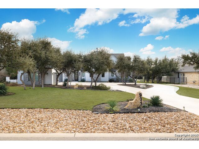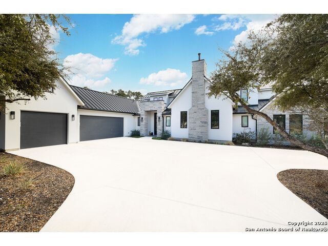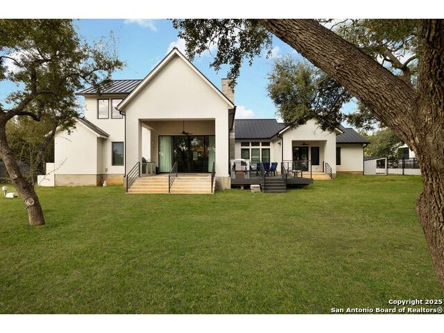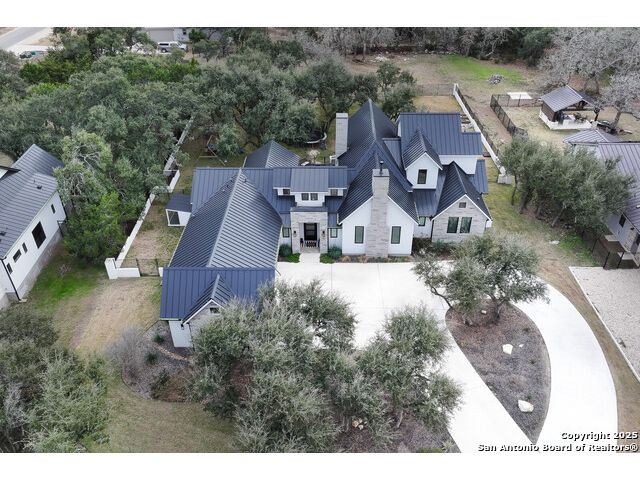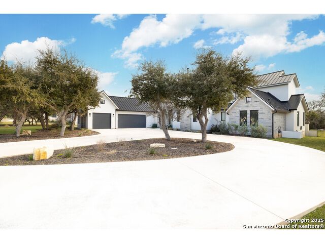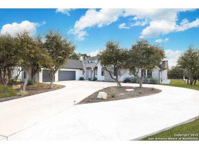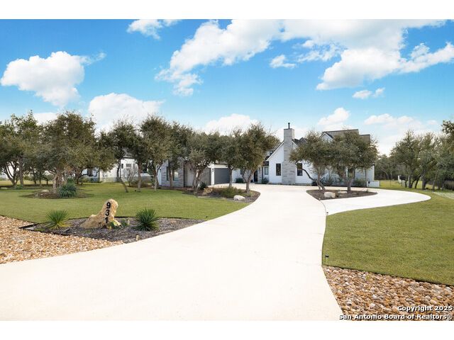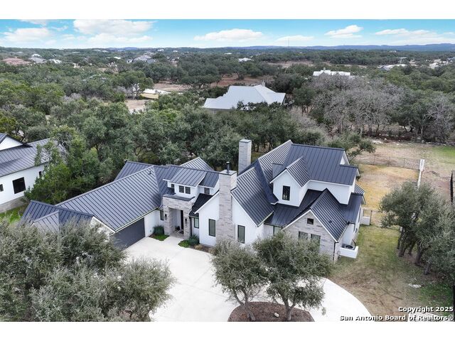 Discover this exceptional residence in Belle Oaks, perfectly situated in the tranquil Texas Hill Country. Built in 2021, this immaculate modern home offers 3,345 sq. ft. of meticulously designed living space and showcases custom craftsmanship throughout. Step inside to find 4 spacious bedrooms, each featuring its own en-suite bathroom, along with a dedicated office/study and a convenient powder bath, all located on the main level. Upstairs, a generous bonus room and an additional powder bath provide flexible space for entertainment, work, or relaxation. The chef-inspired kitchen is a true showpiece, boasting custom European-designed cabinetry, top-of-the-line appliances, a striking granite island with bar seating, a wet bar with wine refrigerator, and abundant storage. The grand living room impresses with soaring ceilings, an elegant fireplace, and dual sliding glass doors that open to a serene outdoor oasis. Enjoy the expansive patio with a fully equipped outdoor kitchen, surrounded by mature trees, ambient tree lighting, fully fenced and peaceful Hill Country views. The property also includes a custom dog run with a thoughtfully designed dog house, complete with a covered porch and dual doors. This home is truly turnkey and move-in ready. Don't miss your chance to make this stunning property your own!