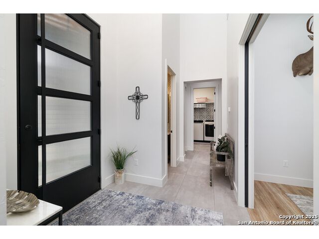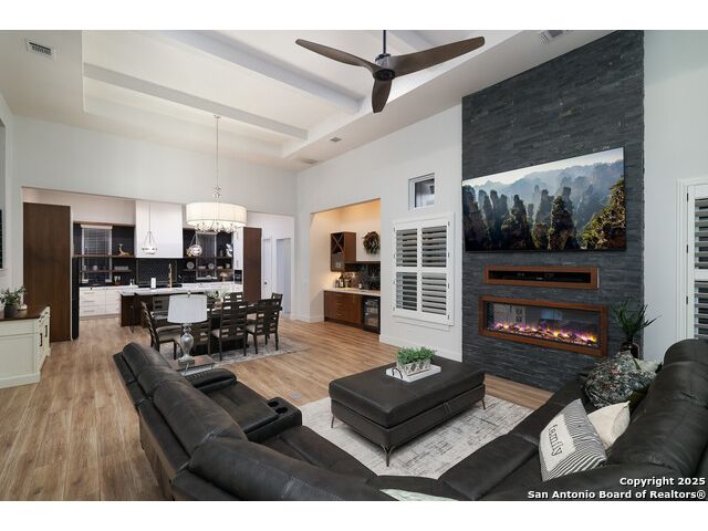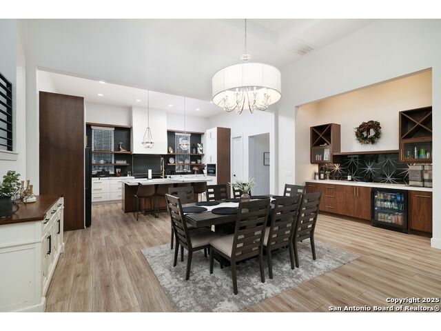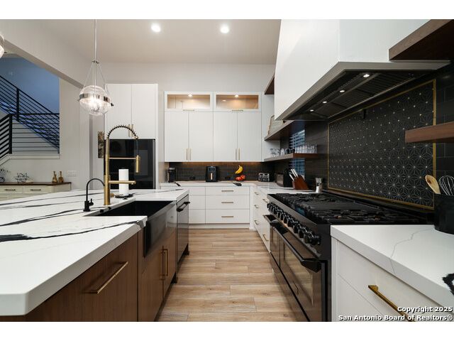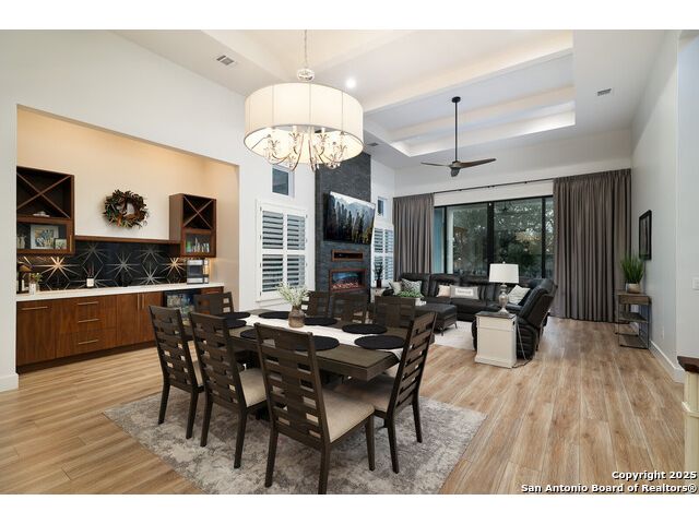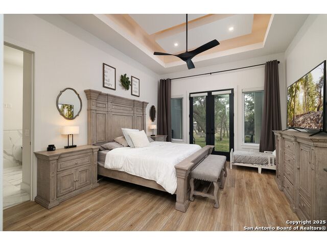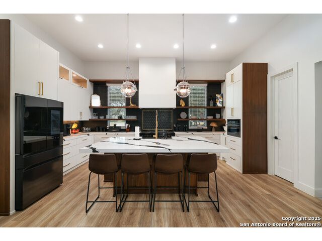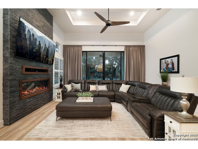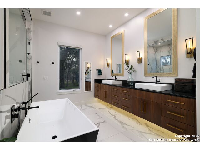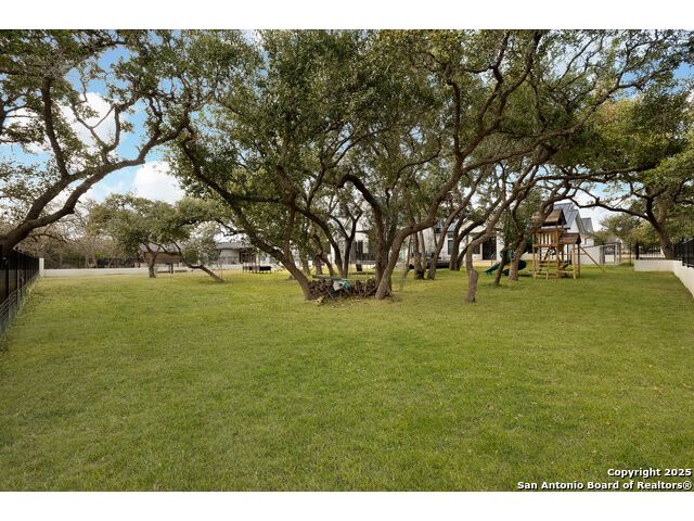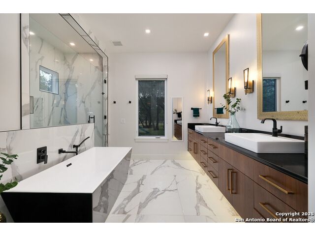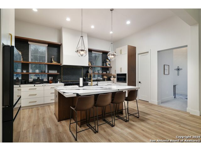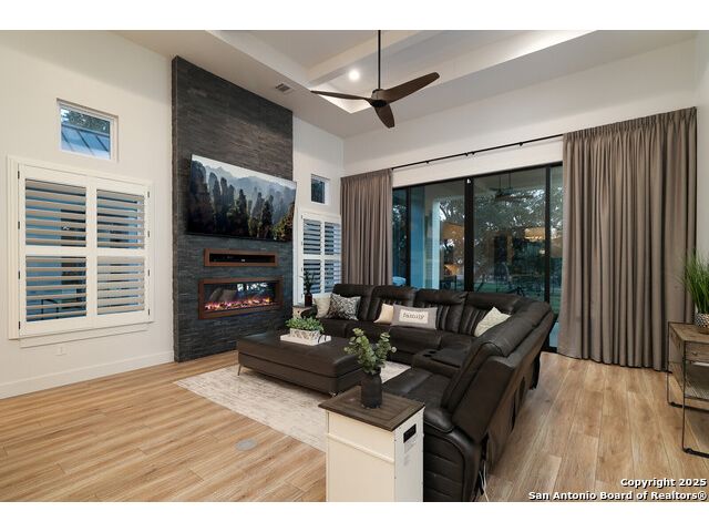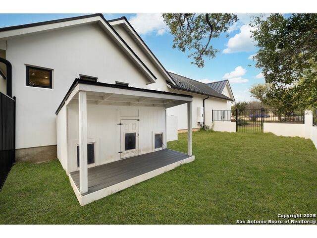 Discover this exceptional residence in Belle Oaks, perfectly situated in the tranquil Texas Hill Country. Built in 2021, this immaculate modern home offers 3,345 sq. ft. of meticulously designed living space and showcases custom craftsmanship throughout. Step inside to find 4 spacious bedrooms, each featuring its own en-suite bathroom, along with a dedicated office/study and a convenient powder bath, all located on the main level. Upstairs, a generous bonus room and an additional powder bath provide flexible space for entertainment, work, or relaxation. The chef-inspired kitchen is a true showpiece, boasting custom European-designed cabinetry, top-of-the-line appliances, a striking granite island with bar seating, a wet bar with wine refrigerator, and abundant storage. The grand living room impresses with soaring ceilings, an elegant fireplace, and dual sliding glass doors that open to a serene outdoor oasis. Enjoy the expansive patio with a fully equipped outdoor kitchen, surrounded by mature trees, ambient tree lighting, fully fenced and peaceful Hill Country views. The property also includes a custom dog run with a thoughtfully designed dog house, complete with a covered porch and dual doors. This home is truly turnkey and move-in ready. Don't miss your chance to make this stunning property your own!
