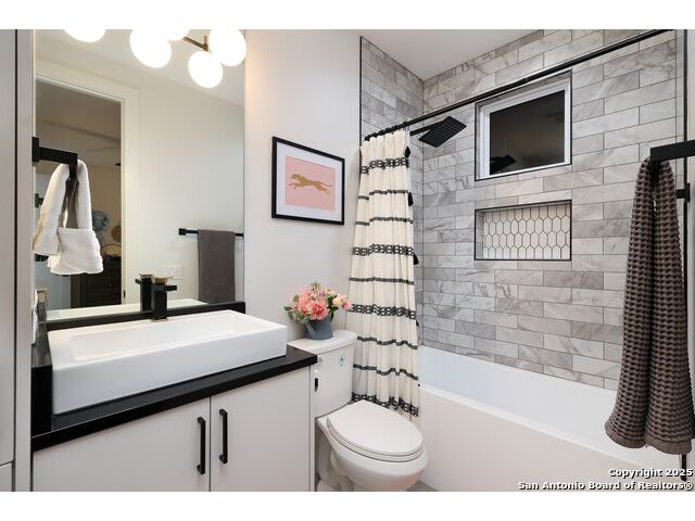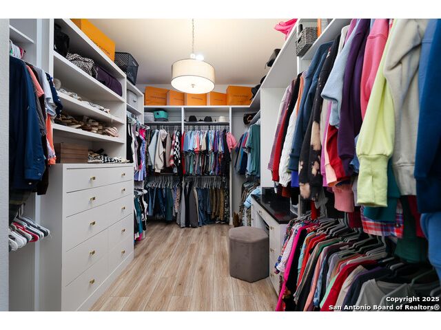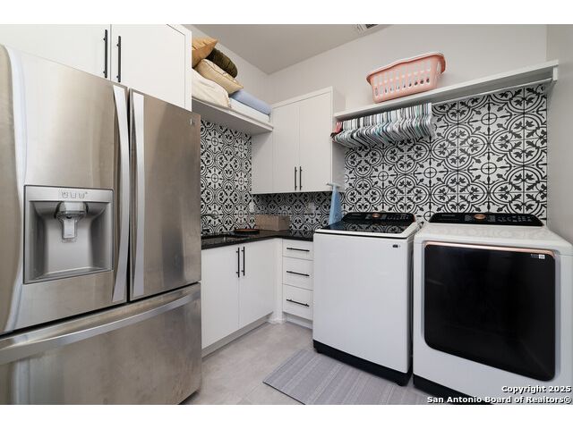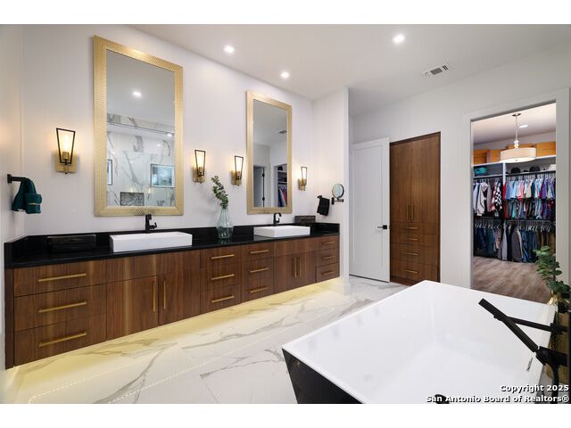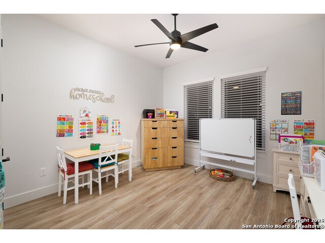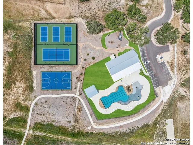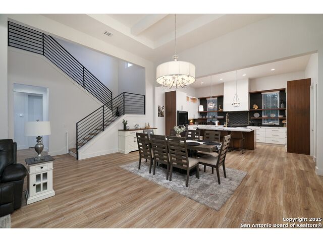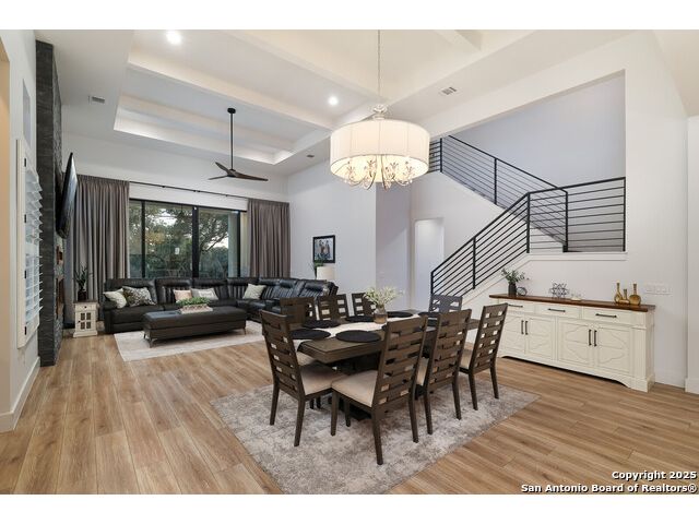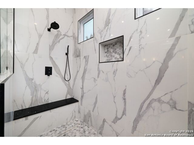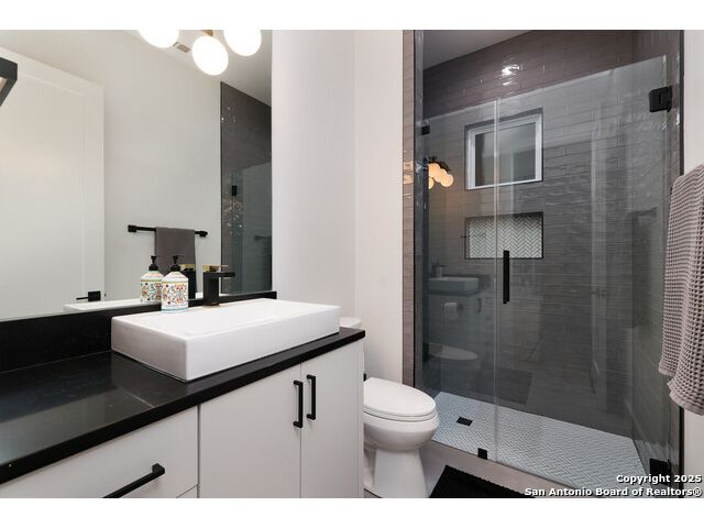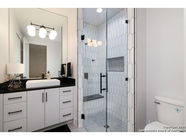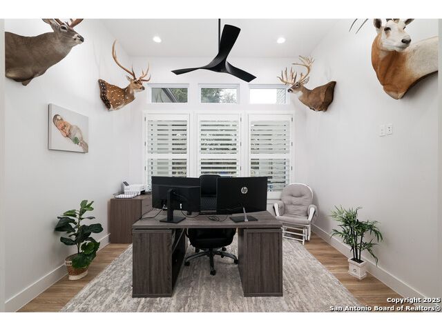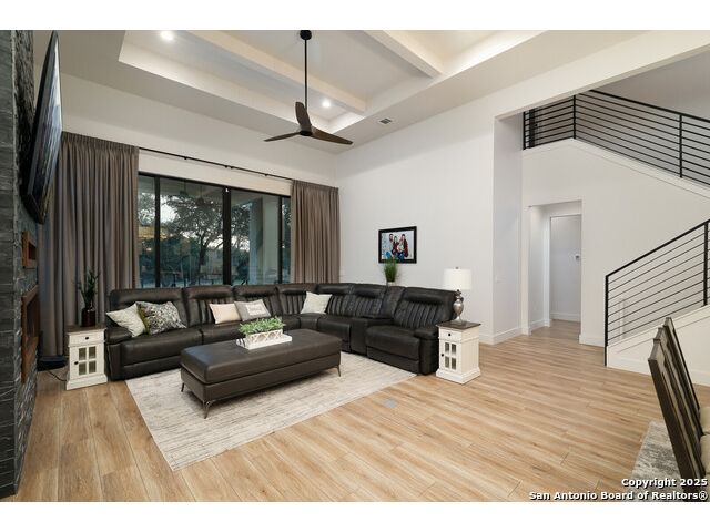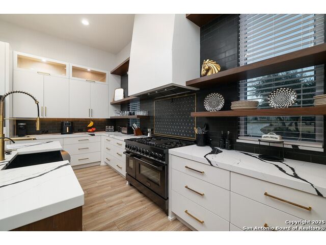 Discover this exceptional residence in Belle Oaks, perfectly situated in the tranquil Texas Hill Country. Built in 2021, this immaculate modern home offers 3,345 sq. ft. of meticulously designed living space and showcases custom craftsmanship throughout. Step inside to find 4 spacious bedrooms, each featuring its own en-suite bathroom, along with a dedicated office/study and a convenient powder bath, all located on the main level. Upstairs, a generous bonus room and an additional powder bath provide flexible space for entertainment, work, or relaxation. The chef-inspired kitchen is a true showpiece, boasting custom European-designed cabinetry, top-of-the-line appliances, a striking granite island with bar seating, a wet bar with wine refrigerator, and abundant storage. The grand living room impresses with soaring ceilings, an elegant fireplace, and dual sliding glass doors that open to a serene outdoor oasis. Enjoy the expansive patio with a fully equipped outdoor kitchen, surrounded by mature trees, ambient tree lighting, fully fenced and peaceful Hill Country views. The property also includes a custom dog run with a thoughtfully designed dog house, complete with a covered porch and dual doors. This home is truly turnkey and move-in ready. Don't miss your chance to make this stunning property your own!