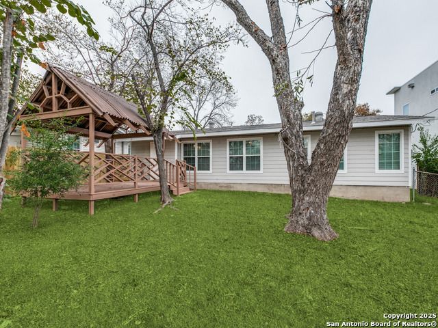 Welcome to this beautifully updated 3-bedroom home, ideally situated in a prime location. Step inside to find refinished wood floors that add warmth and charm to the living room, two bedrooms, and hallway. The kitchen features new ceramic tile flooring, a stylish tile backsplash, and fresh paint throughout the home creates a bright, move-in-ready feel. The spacious bathroom offers extensive tile work along the lower walls and countertops, providing both durability and character. The converted garage adds valuable versatility, creating a second living area perfect for a family room, playroom, or home office. Outside, enjoy entertaining on the oversized deck complete with a gazebo, surrounded by mature trees that offer shade and privacy. Updated in 2016: bathroom and kitchen, HVAC (2016) pergola, windows, siding, new roof, fresh paint, and privacy fence. A wonderful blend of comfort, updates, and location-this home is ready to welcome its next owners.