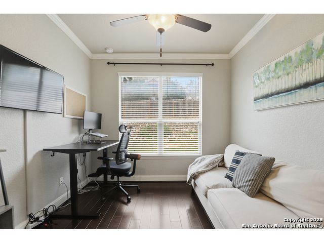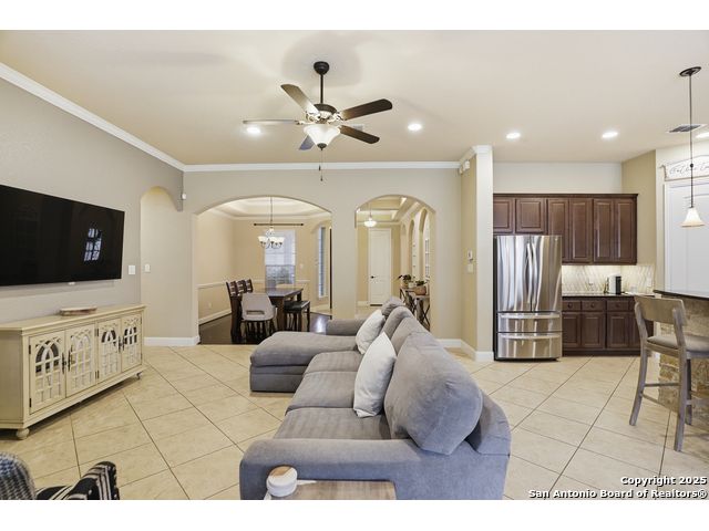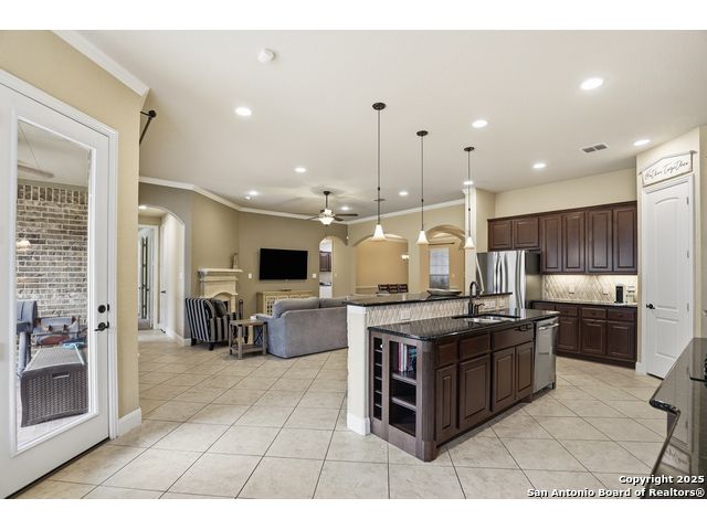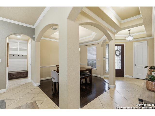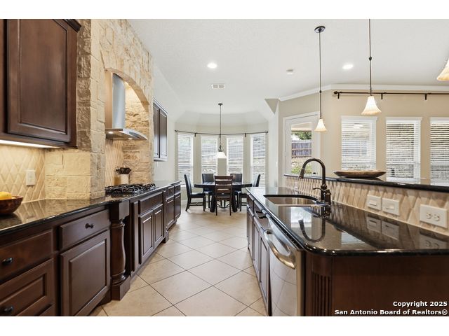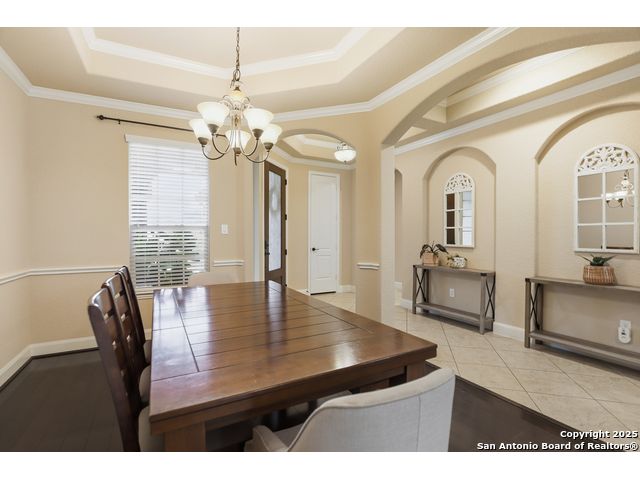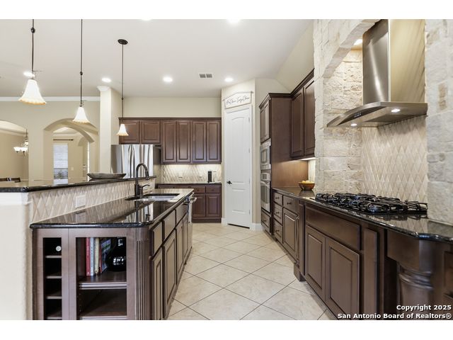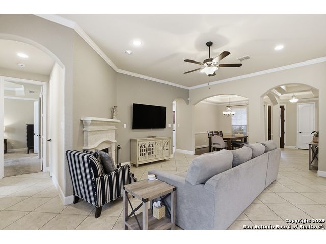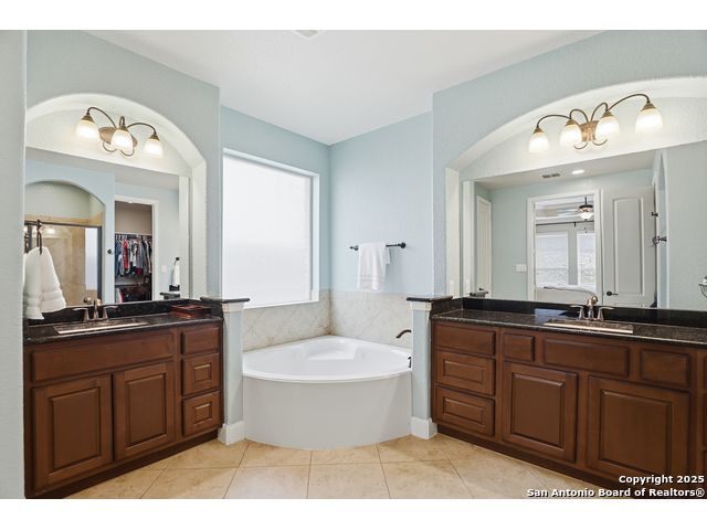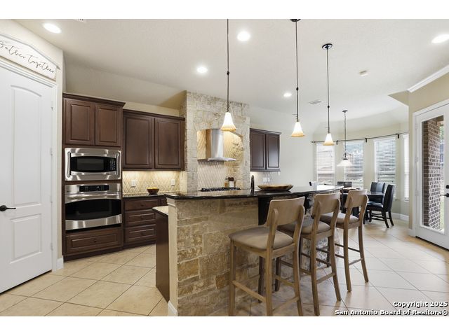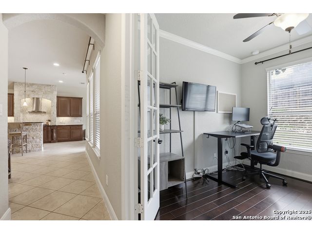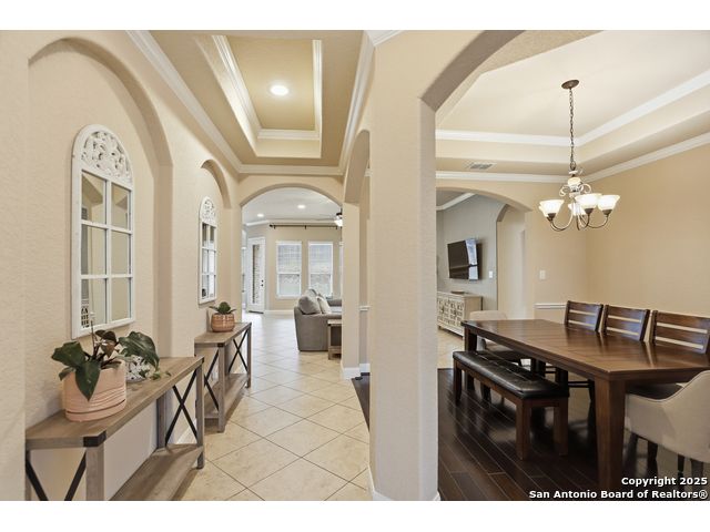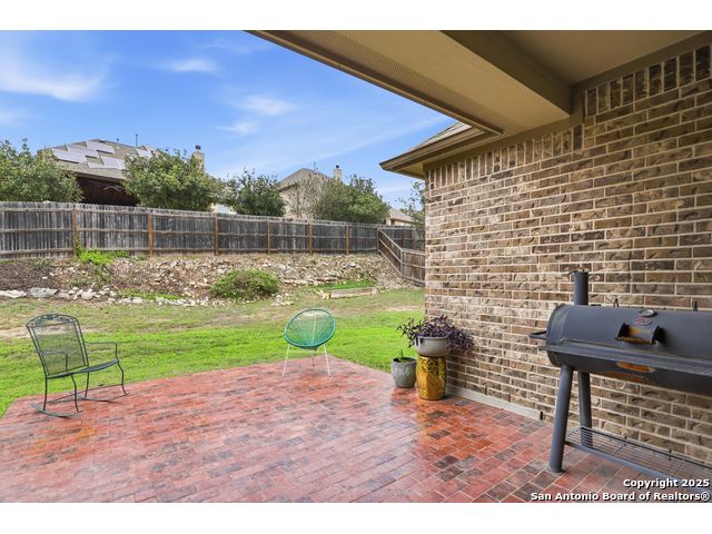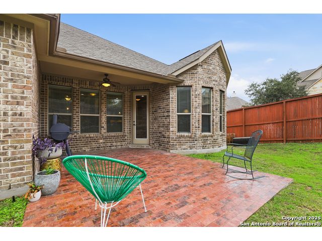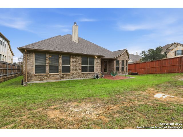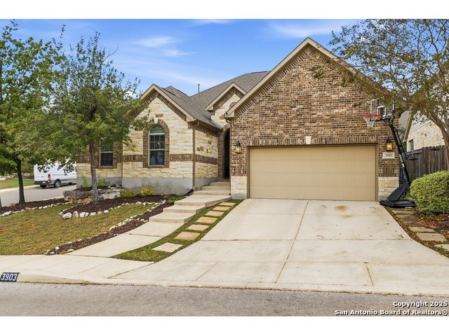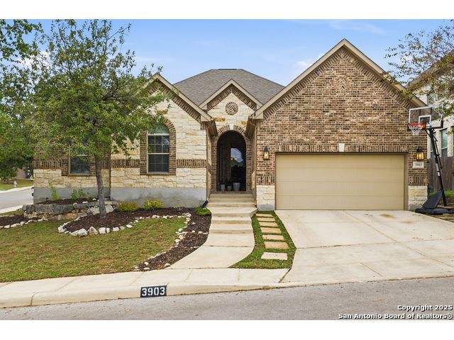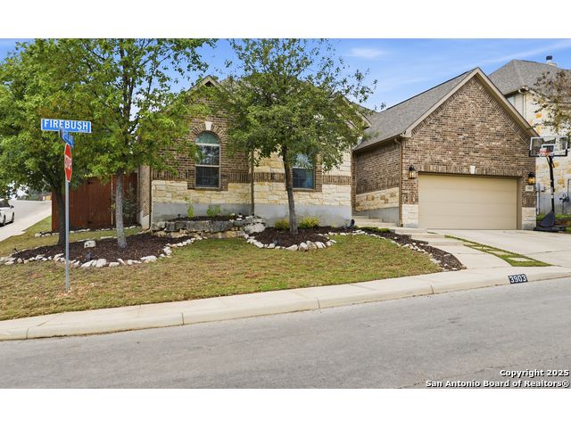Discover comfort and elegance in this beautifully appointed single-story home located in the highly desirable Indian Springs community. Situated on a spacious corner lot, this residence features an attractive stone-and-brick exterior and an inviting open floor plan and 8' interior doors. The gourmet kitchen stands out with its striking stone arches over the gas cooktop, perfect for both everyday meals and entertaining. Unwind in the luxurious primary suite, featuring a relaxing jetted garden tub and a separate walk-in shower. Hardwood floors enhance the dining room and study, while 18" ceramic tile flows throughout the main living areas. A cozy fireplace anchors the family room, creating a warm and welcoming gathering space. Step outside to a covered patio and a private backyard enclosed with high fencing-ideal for outdoor dining or quiet evenings. A gas connection is available for an optional built-in grill. The oversized garage offers hanging storage plus a third-car tandem bay that can serve as additional storage or a workshop. Just minutes from TPC Golf, the JW Marriott, parks, shopping, and popular restaurants, this home delivers both convenience and an exceptional lifestyle.