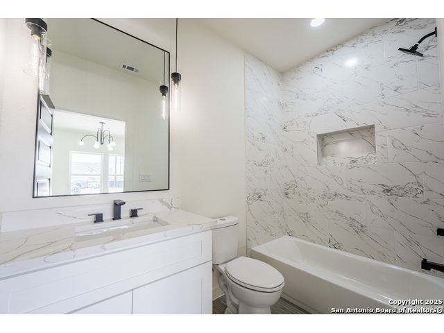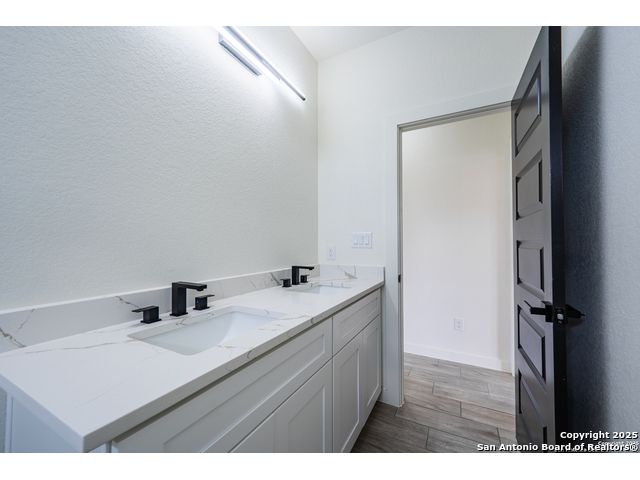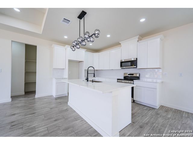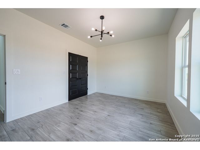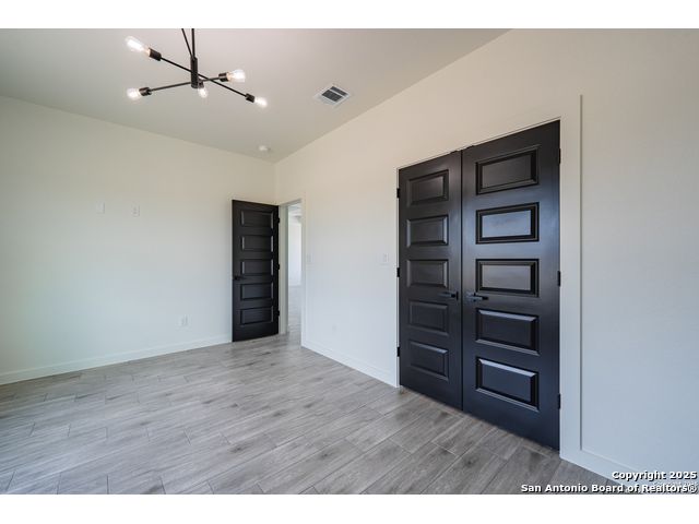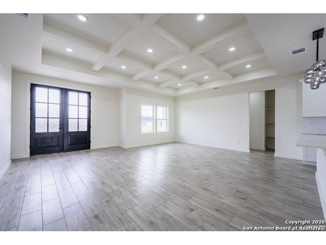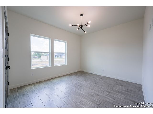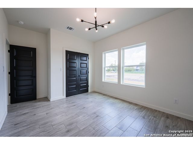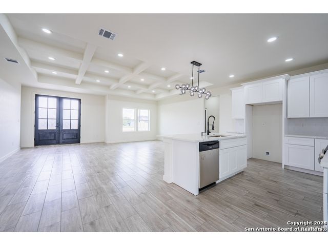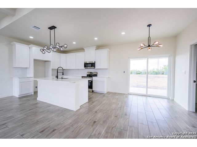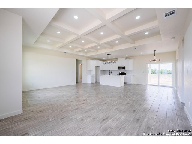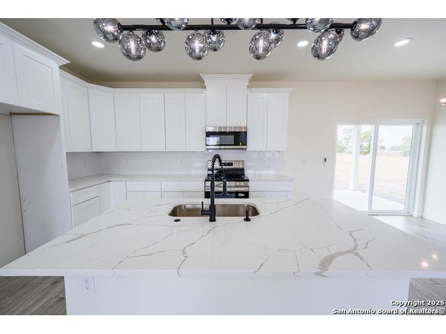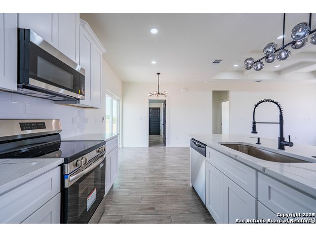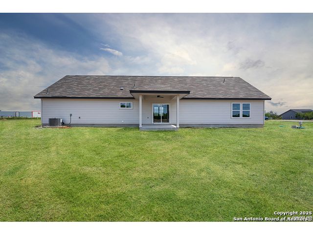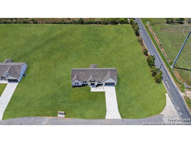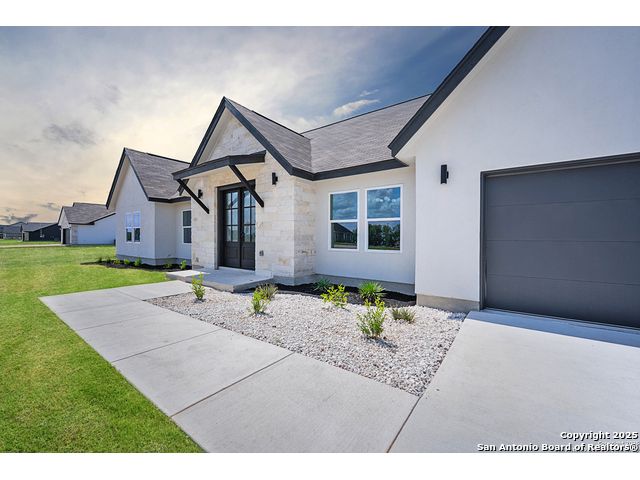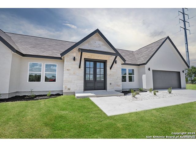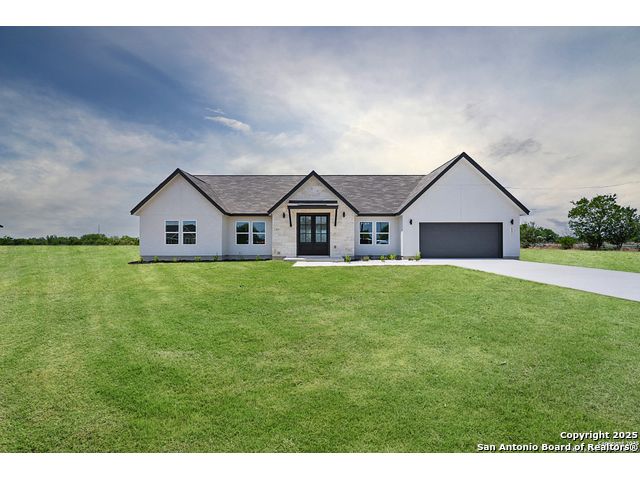 Nestled in the quiet charm of Natalia, Texas, discover 122 Ranchero Way - a stunning brand-new contemporary residence set upon a sweeping one-acre canvas. With its sophisticated stucco facade, striking stone entrance, and bold black trim, this home commands attention before you even step inside. Thoughtful landscaping frames the front, while a distinguished stone address plaque and elegant French doors with obscured glass set the tone for the refined spaces that await within. Inside, you're immediately greeted by an 11-foot coffered ceiling that spans the living area, accented with recessed lighting and large windows that flood the space with natural light. The open layout seamlessly connects the living, dining, and kitchen areas, creating a flow that feels both modern and inviting. The kitchen is a showstopper with its all-white cabinetry, glossy subway tile backsplash, and white marbled quartz countertops. A center island with barstool seating provides the perfect gathering spot, while a metallic glass globe chandelier mirrors the elegance of the dining light fixture. Stainless steel appliances and a walk-in pantry with built-in shelving complete the space. The primary suite is privately tucked away from the other bedrooms, featuring a stylish frosted-globe chandelier, six-panel closet doors, and plenty of room to unwind. The en suite bath is designed with spa-like detail - a soaking tub, single vanity with quartz countertop, pendant lighting, and a full-height marble tile backsplash with a built-in niche. The additional bedrooms each feature industrial pendant lights, natural light, and spacious closets with six-panel double doors. They share a full bathroom with a double vanity, quartz counters, a sleek modern black light fixture, and a shower-tub combo with marble tile to the ceiling. Throughout the home, luxury vinyl plank flooring in a gray wood-grain finish ties everything together with both durability and style. Step outside, and you'll find a covered patio with a remote controlled ceiling fan overlooking the full acre of open land - a blank canvas ready to be personalized. And then, there's the garage - a massive oversized 22 by 31-foot space, extra deep and ready to accommodate vehicles, storage, or even a workshop. This is a home that blends modern design with comfort, functionality, and room to grow - a truly remarkable new build here in Natalia.