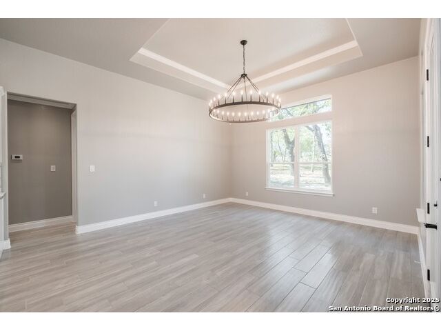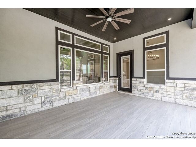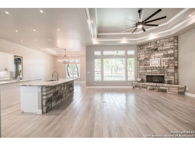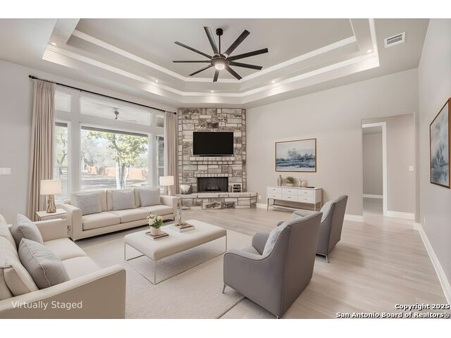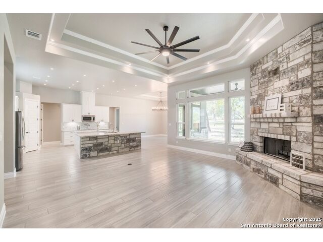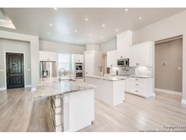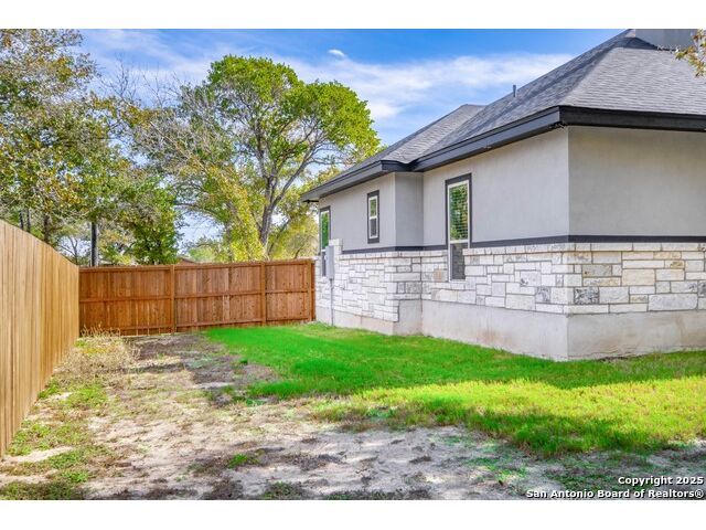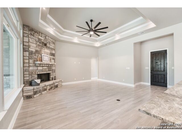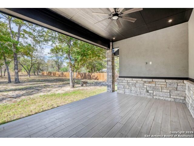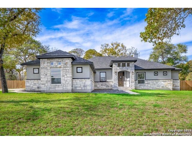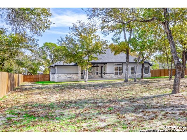Experience modern Hill Country living in this beautifully designed home, offering 4 bedrooms, 3.5 baths, and 2,515 sq ft of thoughtfully planned space on a full 1-acre lot. This vacant property is move-in ready and comes with a 1-year warranty for peace of mind. The floor plan is crafted for comfort and versatility, featuring two primary bedrooms located on opposite sides of the home, ideal for multigenerational living or extended-stay guests. At the center, an expansive open-concept layout connects the kitchen, dining, and living areas, creating a warm and welcoming hub for everyday living and entertaining. The living room features a fireplace and a tray ceiling, while the kitchen offers beautiful quartz countertops, a large center island, a pantry, and upscale light fixtures, combining style and function. Both primary suites feature tray ceilings. One primary suite includes an ensuite bath with dual vanities, a spacious shower, and two large closets. The second primary suite has an ensuite bath with a single vanity, a shower, and a walk-in closet. The secondary bedroom wing includes two additional bedrooms that share a full bath with a shower/tub combo and a dual vanity. A covered patio extends your living space outdoors, overlooking an open backyard with no houses behind and fencing along two sides of the property. Additional highlights include 8' garage doors and a 3-car garage with epoxy floors, a septic system, multiple storage closets throughout, and a spacious laundry room. With its modern finishes, smart layout, and beautiful setting, this home offers the perfect blend of style, space, and privacy.