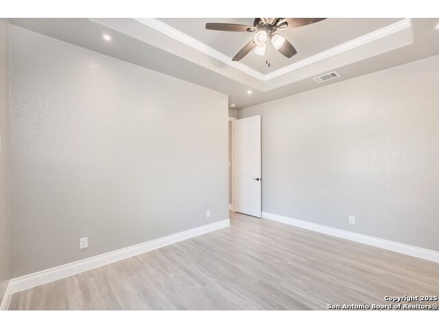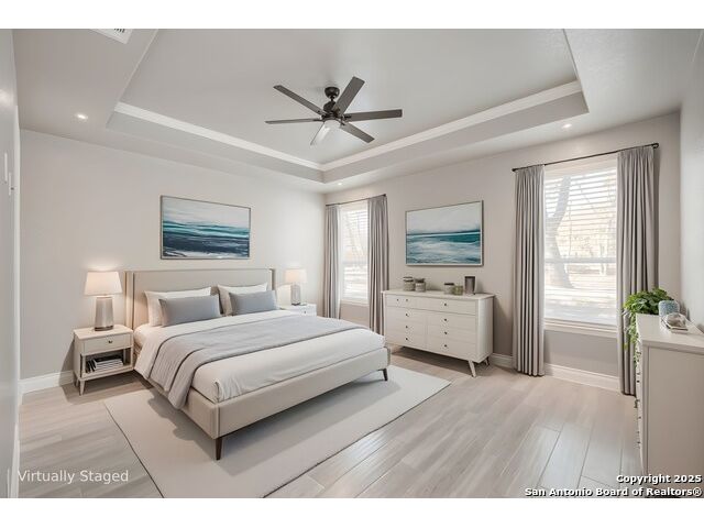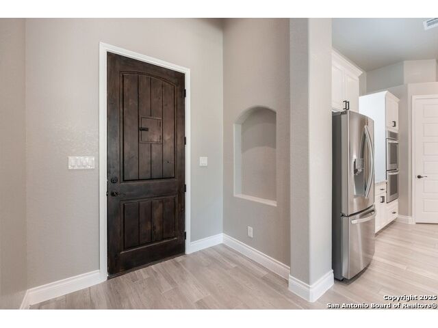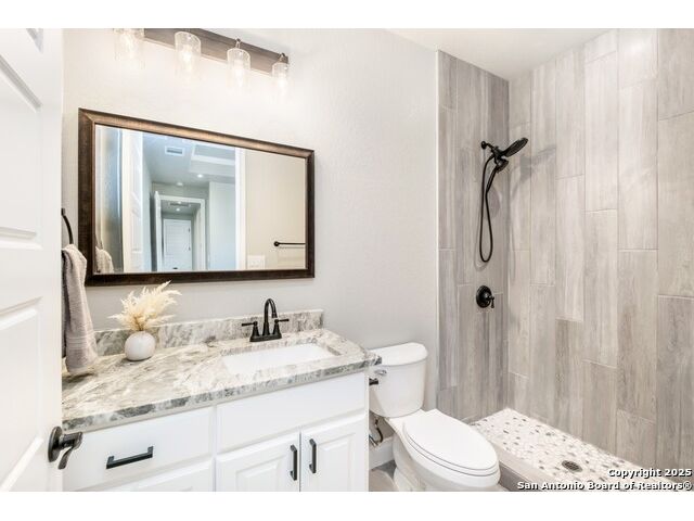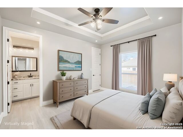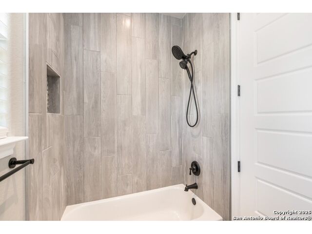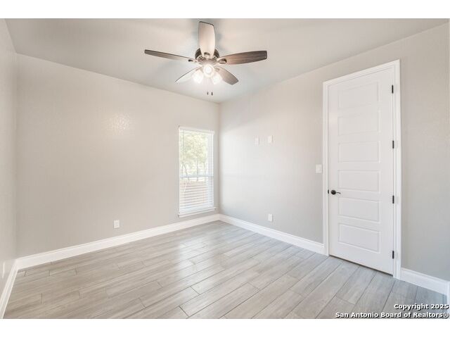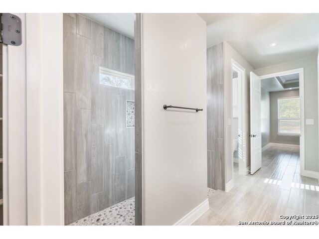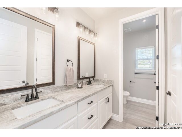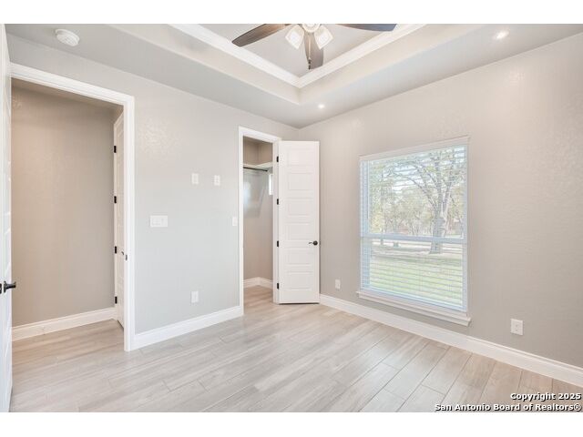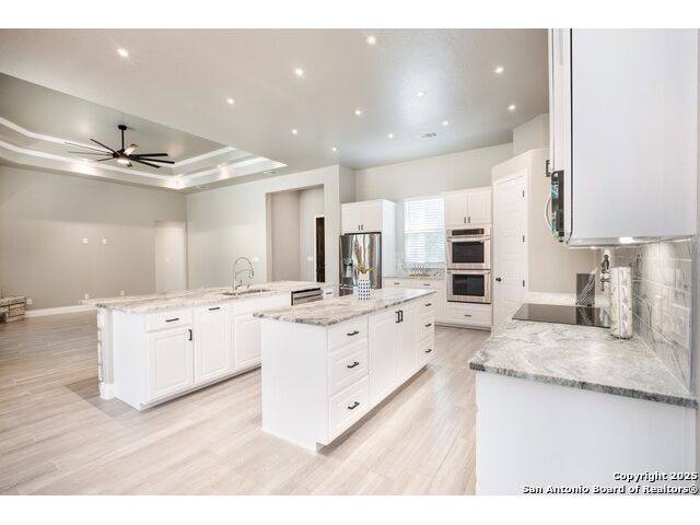 Experience modern Hill Country living in this beautifully designed home, offering 4 bedrooms, 3.5 baths, and 2,515 sq ft of thoughtfully planned space on a full 1-acre lot. This vacant property is move-in ready and comes with a 1-year warranty for peace of mind. The floor plan is crafted for comfort and versatility, featuring two primary bedrooms located on opposite sides of the home, ideal for multigenerational living or extended-stay guests. At the center, an expansive open-concept layout connects the kitchen, dining, and living areas, creating a warm and welcoming hub for everyday living and entertaining. The living room features a fireplace and a tray ceiling, while the kitchen offers beautiful quartz countertops, a large center island, a pantry, and upscale light fixtures, combining style and function. Both primary suites feature tray ceilings. One primary suite includes an ensuite bath with dual vanities, a spacious shower, and two large closets. The second primary suite has an ensuite bath with a single vanity, a shower, and a walk-in closet. The secondary bedroom wing includes two additional bedrooms that share a full bath with a shower/tub combo and a dual vanity. A covered patio extends your living space outdoors, overlooking an open backyard with no houses behind and fencing along two sides of the property. Additional highlights include 8' garage doors and a 3-car garage with epoxy floors, a septic system, multiple storage closets throughout, and a spacious laundry room. With its modern finishes, smart layout, and beautiful setting, this home offers the perfect blend of style, space, and privacy.