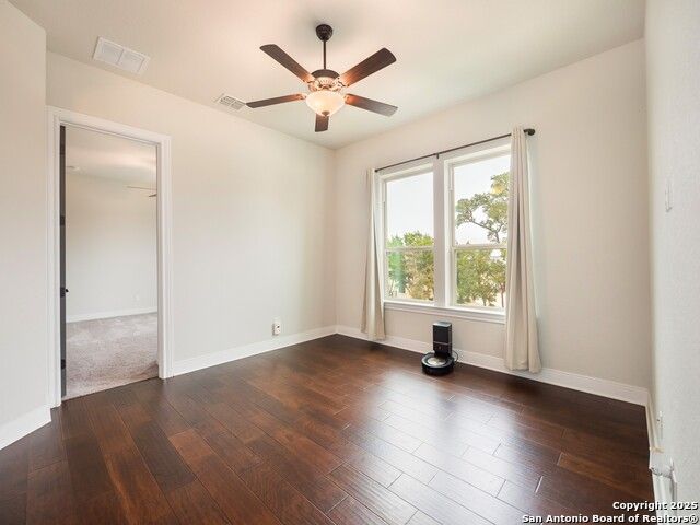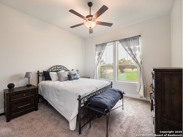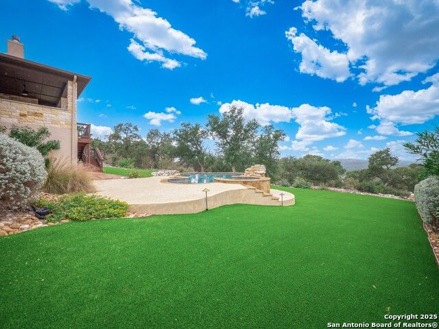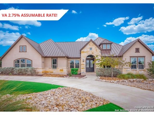 2.75% Assumable Loan! Impeccable Views! Impeccable Home! LOW utility bills! Come home to this breathtaking estate that's perfectly positioned on a private 1.1-acre cul-de-sac lot on top of the hill, and save yourself tens of thousands of dollars by assuming the 2.75% VA loan! This luxurious home combines timeless elegance with unrivaled panoramic views and a backyard resort oasis. Preparing for dinner parties is a breeze in this luxurious chef's kitchen, featuring Diamond Bianco granite countertops, double-stacked custom cabinetry with glass-front accents, a 36" Cafe gas cooktop, double ovens, and an Italian white apron sink. Retreat to the sanctuary of your primary suite admiring the sweeping views and a spa-worthy bathroom w/ a 71" cast iron soaking tub, a rain shower w/ body sprayers, and dual designer closets. The main level is thoughtfully designed to offer both privacy and connection. Admire the hickory hardwood flooring, hand-selected accent tile, soaring ceilings with wood beams, and a floor plan designed to impress and embrace that includes four serene bedrooms, a light-filled sunroom, a dedicated study, and a flexible bonus room. Upstairs, you will find the game room wired for surround sound, a media room, the 5th bedroom/or an office, and a half bath. Step out back to the fully equipped outdoor kitchen with stainless steel appliances and granite countertops. Take in the impeccable view while floating in the stunning Hill Savannah heated pool and spa with a cascading waterfall grotto. Don't like yard work? No problem! The custom-designed landscaping features native rock, lush greenery, and premium artificial turf, requiring minimal maintenance. This home is as smart as it is stunning, with energy-efficient solar panels (that reduces your water/electricity bills to an average of only $120/month and panels are paid off!), a painted standing seam metal roof, a grand circular drive, a 3-car garage, and a Whole-Home UV Water Filter System. The exclusive Copper Ridge community is a premier 24-hour gated and guarded community in New Braunfels. The resort-style amenities include a resort-style pool with both lap and play pool, pavilion with fireplace, barbecue and picnic tables, tennis, and basketball courts. Come tour this Hill Country Masterpiece today.