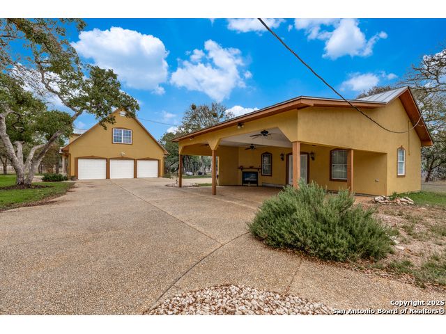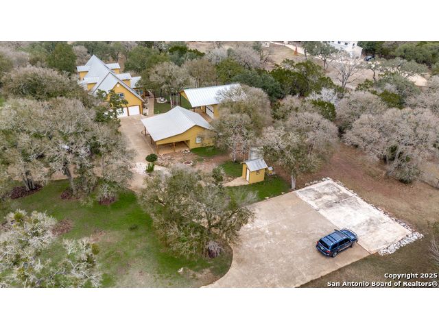 If you're looking for an exceptional hill country retreat at a fantastic price, this is it! This beautiful well-manicured 4.35 +-acre oak studded property welcomes you in through a private security gate with a concrete drive with plenty of extra open area for another workshop or parking. Fresh paint throughout the home. The inviting spacious living room welcomes you with great crown molding, accent lighting, wood floors and a gas fireplace. The spacious chef kitchen offers abundant counter and cabinet space, granite counter tops, double ovens, gas cooking, island, breakfast bar and opens to a bright breakfast/sunroom that fills the home with natural light. The spacious owner's suite boasts a gorgeous walk in shower and double vanities, while the downstairs guest suite provides a large closet and convenient access to a full bath-perfect for visitors. Upstairs you'll find two new generously sized bedrooms with new carpet, great game room and a full bathroom. Enjoy watching the wildlife from the large back deck. There is an attached side entry three car garage, an wonderful 30x30 workshop with a loft area for additional storage and 2 car carport for extra parking. Now, although needing some TLC, the guest house is an added value with kitchen, living room, bedroom and full bath. The property is completely fenced and cross fenced with a small generator to help during any outages! Come see this well-loved property before it's gone!