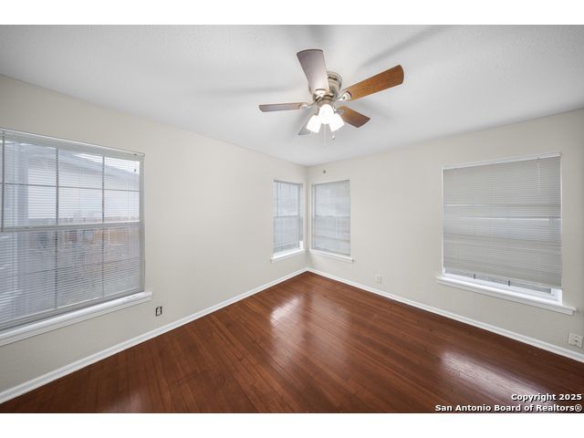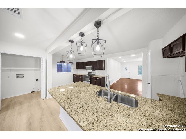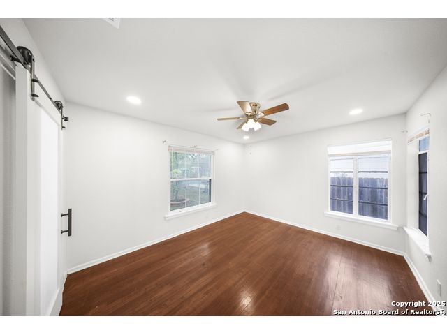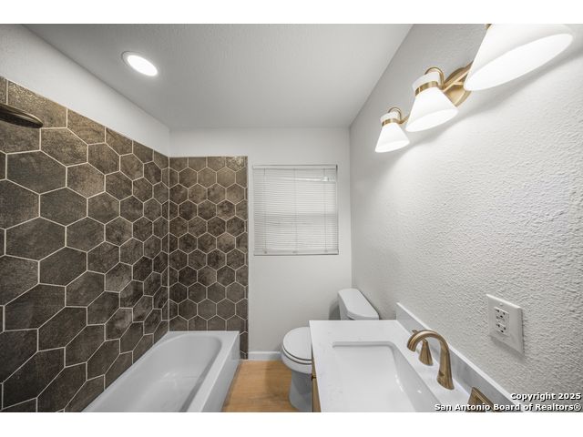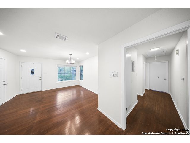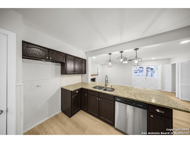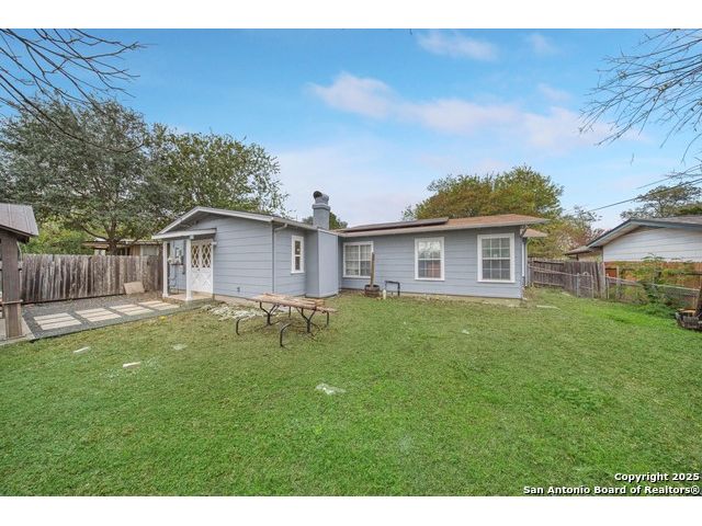 This charming single-story home at 126 Cresham Dr in San Antonio, TX 78218 offers welcoming curb appeal with iron fencing for added style and security, mature trees, decorative stonework, upgraded double-pane front-facing windows, and a single-car garage. As you step inside, the dining room unfolds beautifully, featuring a chandelier with timeless elegance, original hardwood flooring, and recessed LED lighting-creating an inviting, upscale atmosphere for everyday dining. Continue into the spacious dine-in kitchen, showcasing granite countertops, a breakfast bar, patterned backsplash, stainless steel appliances, and an open layout ideal for modern living. Adjacent to the kitchen are three comfortable bedrooms, all offering neutral-tone wood flooring and abundant natural light. The home features two upgraded bathrooms, including one with a stylish vessel sink and glass-enclosed shower, and another with a beautifully hexagon-tiled tub surround and champagne-toned fixtures. The large living room serves as the heart of the home, complete with luxury vinyl flooring, recessed lighting, and a wood-burning fireplace, perfect for relaxation and gatherings. A generous laundry room provides convenience and added storage. High-speed Google Fiber up to 1G, a Nest thermostat, and 5.27 kW solar panels enhance energy efficiency and reduce utility costs. Step into the backyard to enjoy a shaded area under a mature tree and a decorative metal-covered patio, ideal for outdoor entertaining. This move-in-ready property blends comfort, efficiency, and modern upgrades throughout. Additional details: roof approx. 8 years old; natural gas HVAC approx. 4 years old; natural gas water heater; 312 sq ft garage with side entry and automatic opener. Conveniently located near Fort Sam Houston, Randolph AFB, Loop 410, and I-35, offering excellent access across Northeast San Antonio.