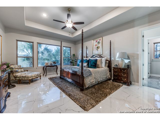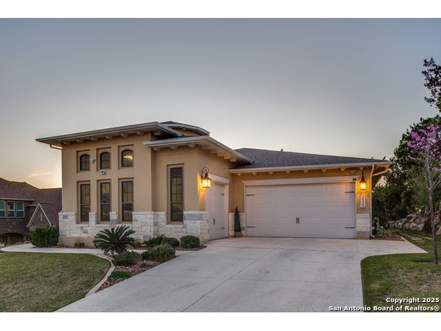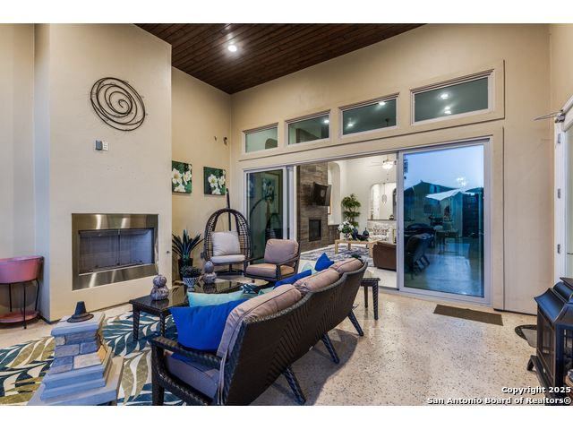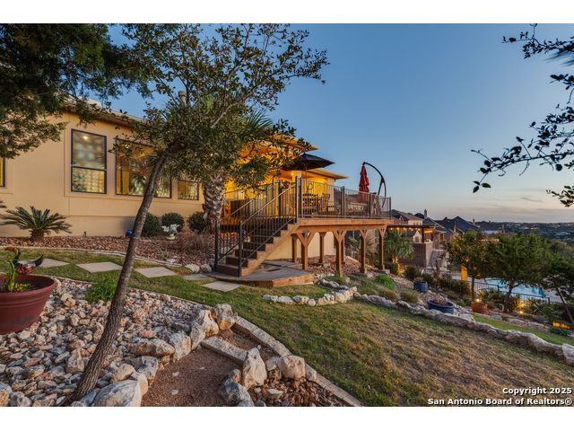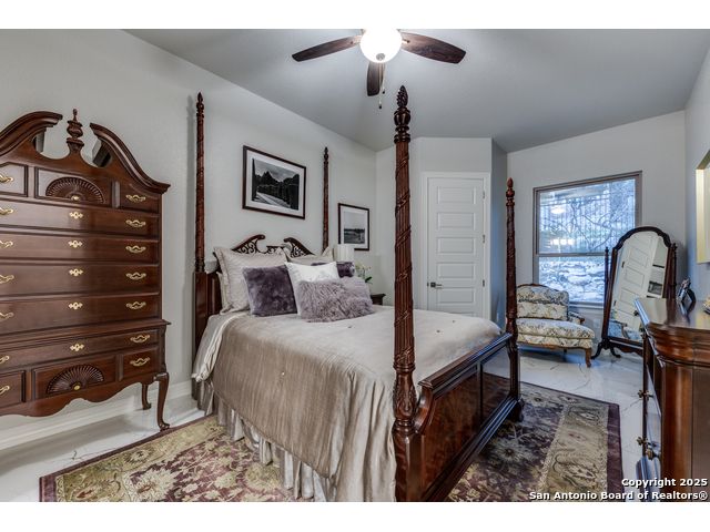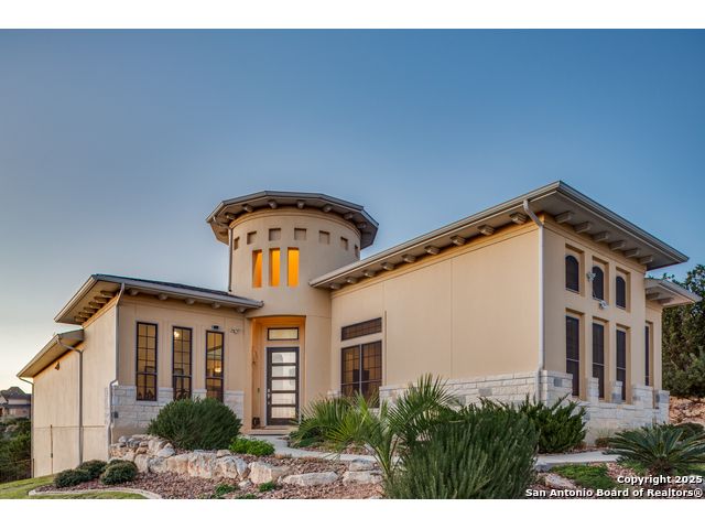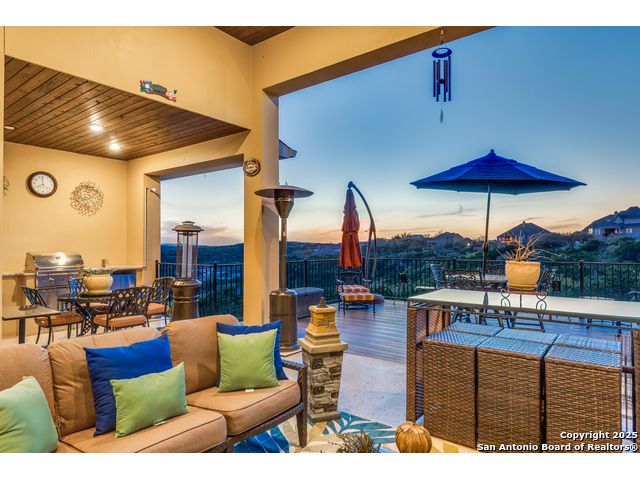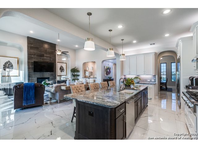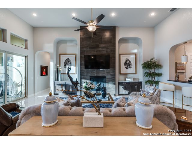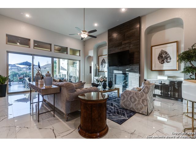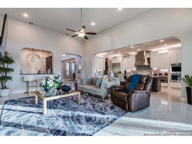 Exquisitely set on over 0.6 acres of 'The Overlook at Stonewall Estates', the serenity of the greenbelt/conservation space welcomes stunning, expansive views of San Antonio. Allow the natural flow of porcelain floors in this single level home to help you discover your favorite features - many are subtle, some overtly impressive, and others required for a property of this caliber. The gleaming kitchen is properly outfitted with a Thermador appliance suite coordinated to blend with the aesthetic of the cabine