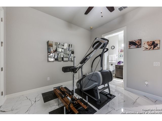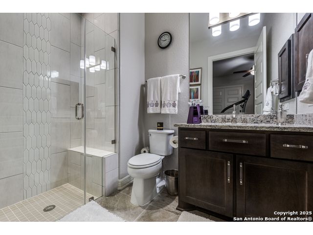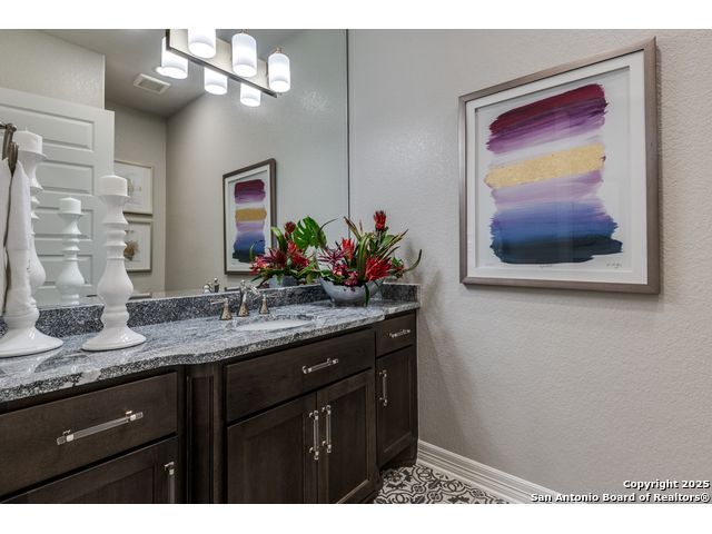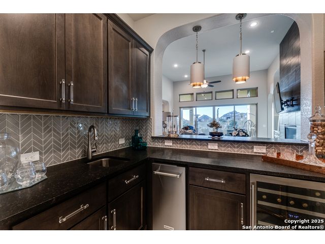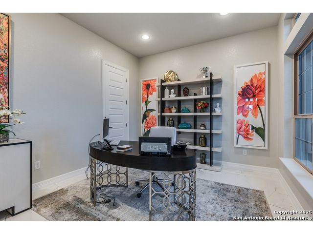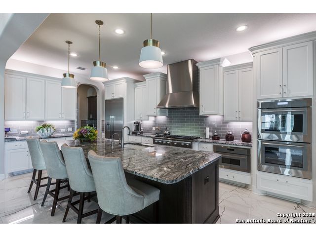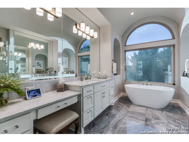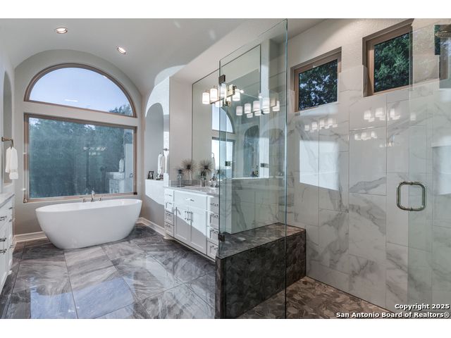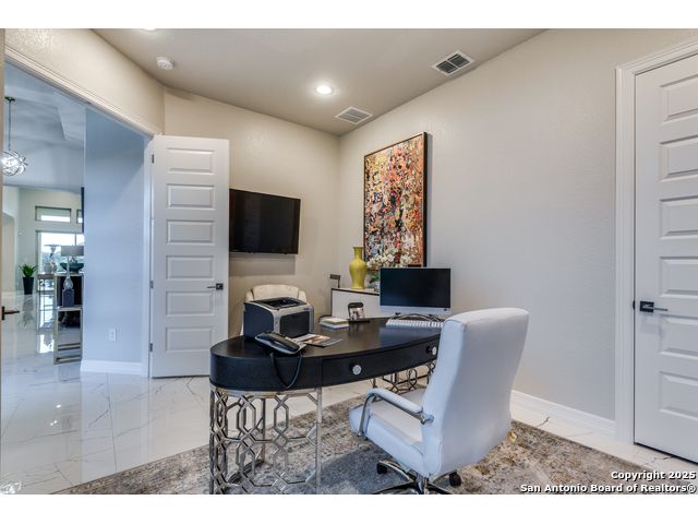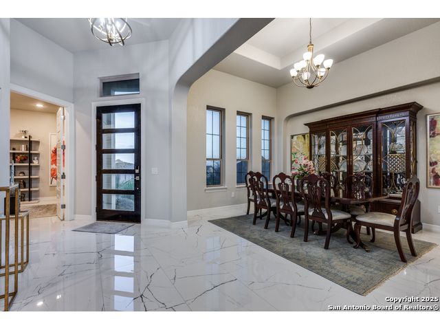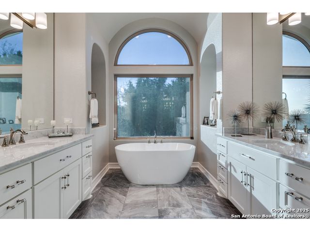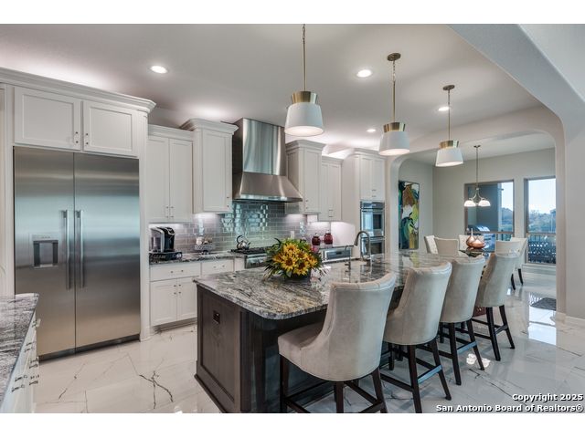 Exquisitely set on over 0.6 acres of 'The Overlook at Stonewall Estates', the serenity of the greenbelt/conservation space welcomes stunning, expansive views of San Antonio. Allow the natural flow of porcelain floors in this single level home to help you discover your favorite features - many are subtle, some overtly impressive, and others required for a property of this caliber. The gleaming kitchen is properly outfitted with a Thermador appliance suite coordinated to blend with the aesthetic of the cabine