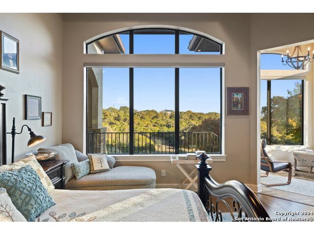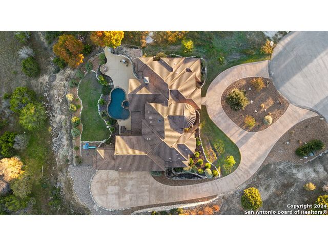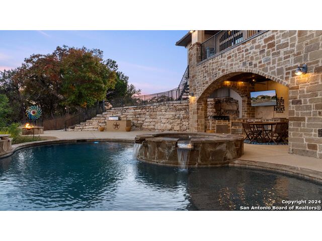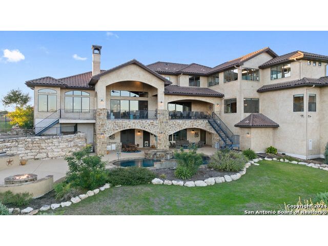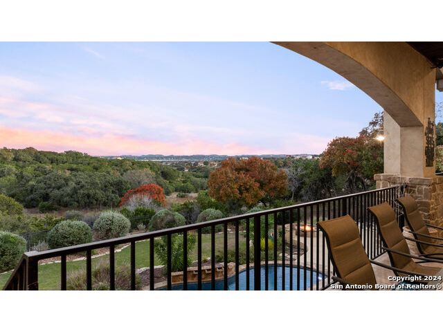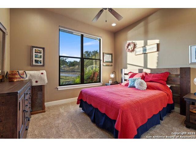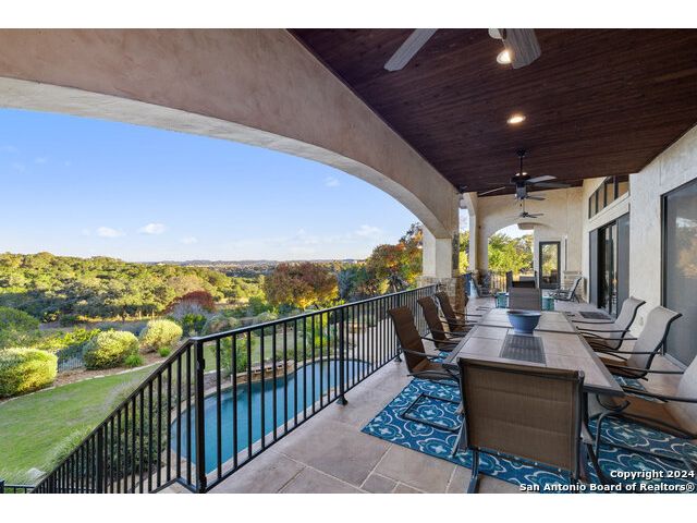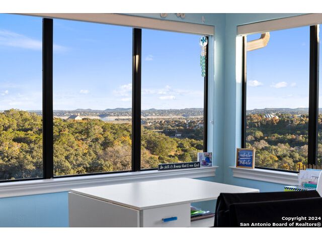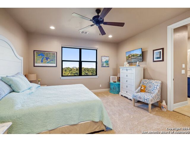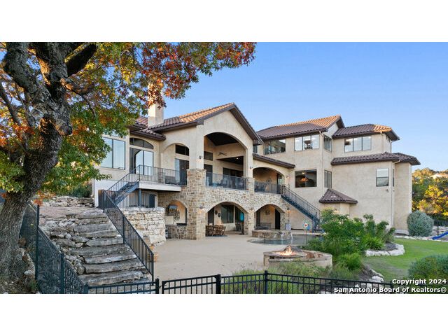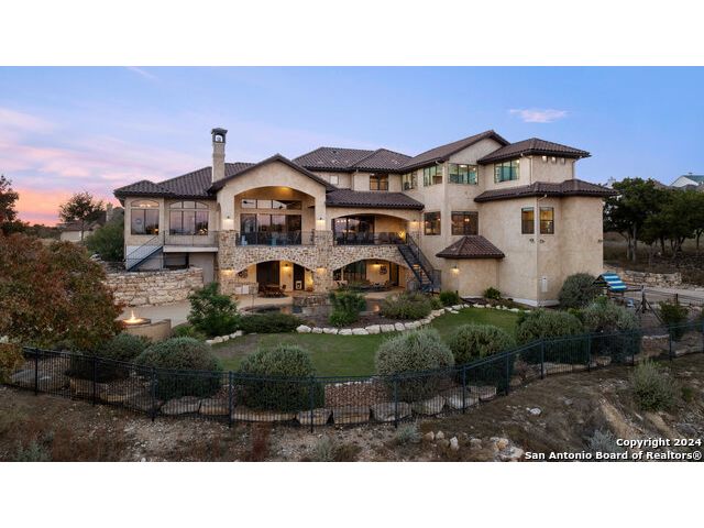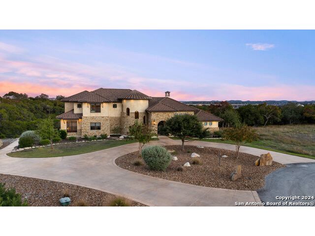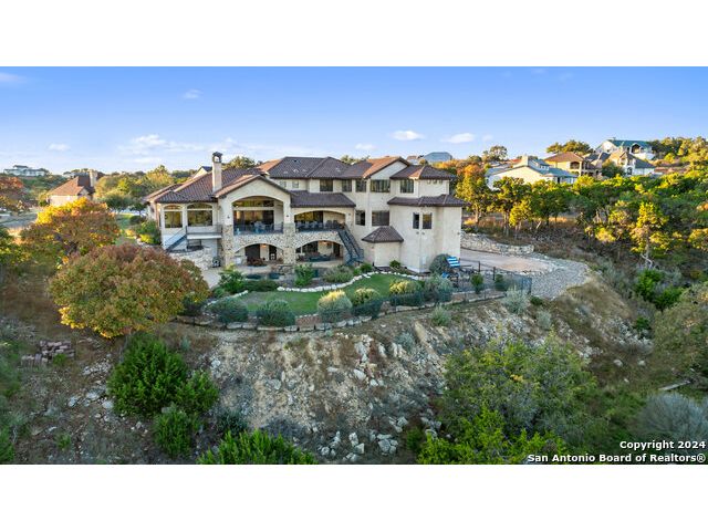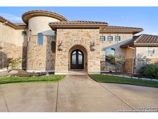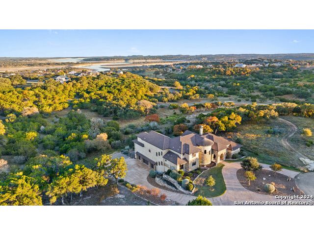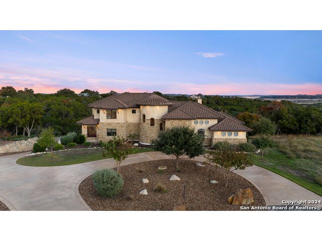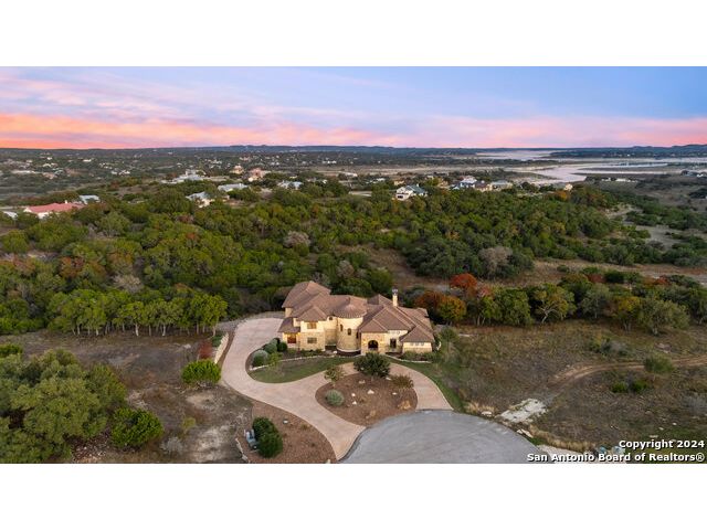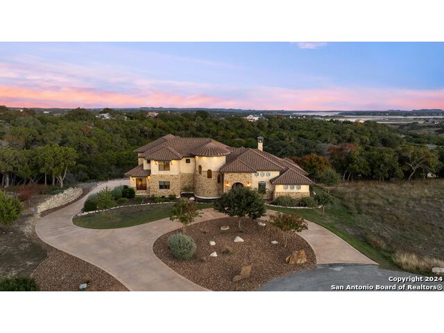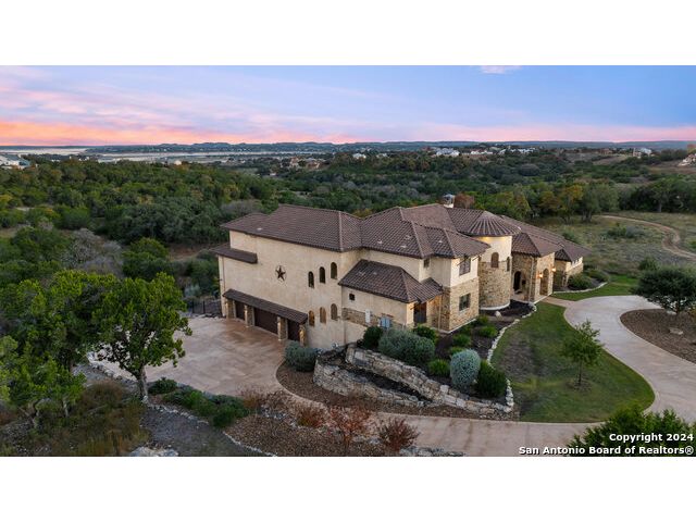 Welcome to the extraordinary Bluewater Place Estate, an exquisite masterpiece of Hill Country elegance, grandeur, and spatial magnitude, where majesty awaits around every corner of this 8000+ square foot oasis privately nestled on 3.2 acres surrounded by stunning rolling green hills and awe-inspiring lake views. This 5 bedroom, 6 bath home, meticulously crafted in 2018, incorporates all elements of the finest standard of Hill Country Living from the resort style poolscape, 4 bay epoxy floor garage, and wine grotto to the gym, library, and craft studio. Every square foot was thoughtfully designed to take in long range lake views, be aesthetically intriguing and supremely functional. The entry level features the heart of the home, an open concept gourmet kitchen and dining area, accented by ample knotty alder cabinetry and artisan backsplash, anchored by gourmet appliances, 14' granite island, coffee bar, and expansive pantry. Not to be overlooked is the grand family room, host to a fir beamed ceiling, rock fireplace, built in entertainment center and of course entry to the breezy 660+/-sf covered porch spanning the length of this great room and kitchen. The secluded primary suite is finished out with a reading nook that captures the sunrise, walk-in shower with 2 shower heads, and impressive 250+/- sf walk-in closet with center island, built in shelves, and luminous windows. The stately library is the perfect retreat for daydreaming bookworms and the studious alike. Embrace your artistic side in the bright and spacious art studio that includes an entire wall of built-in storage to keep your tools organized while the creativity flows. Host gameday from the centralized den with a TV wall, billiards, and full wet bar. Take time for yourself in the peace of a private gym while enjoying the captivating view overlooking the waterfall of the pool. Curate your own wine or spirit collection in the cavernous wine cellar. A swanky elevator navigates to all 3 levels, the epitome of luxury and convenience. Bask in the gentle hill country breeze and host family and friends from the cabana featuring a masonry outdoor kitchen next to the deep blue pool and spa. Leaving no stone unturned, the home also offers a stunning amount of storage on every level and is exemplified by the owner's "Texas Basement," an approximately 322sf of finished out heated and cooled storage room which may also serve as flex space. Truly an entertainer's delight and phenomenal Hill Country home base. Close to shopping and restaurants. 35 Minutes to New Braunfels and San Antonio. Just 45 minutes to Austin. Located on the north side of Mystic Shores, residents will enjoy access to Canyon Lake with boat ramps and lake-side parks, 2 community pools, sports courts, community boat, and RV storage, as well as nature preserves with walking and biking trails.